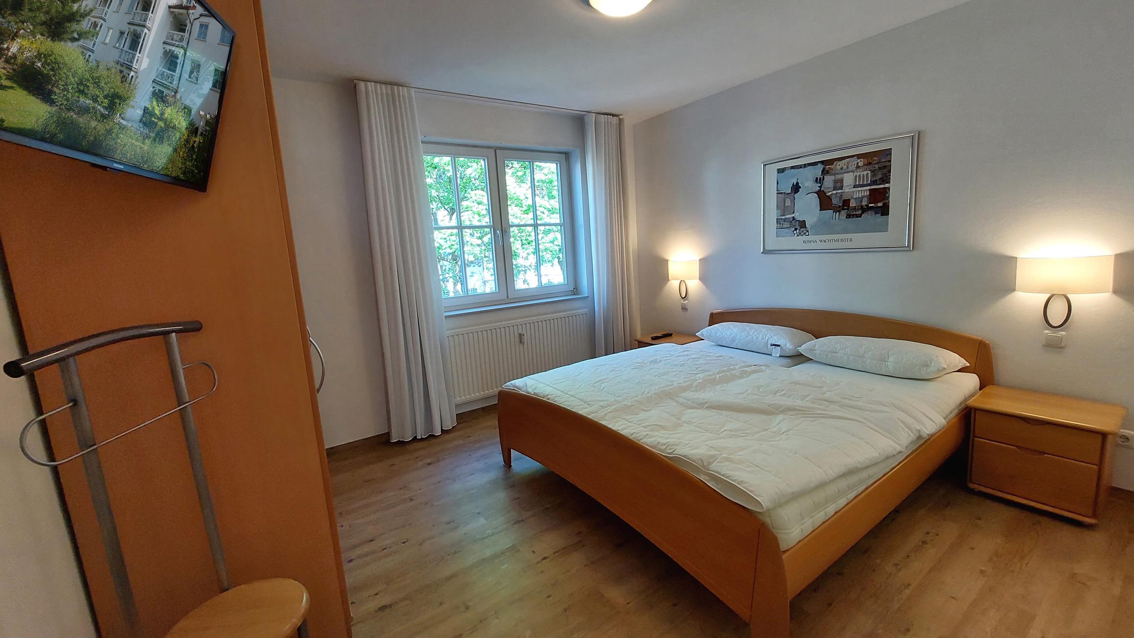 Beide Schlafzimmer verfügen jeweils über Doppelbetten mit Nachttischen, einen Kleiderschrank und einen TV.