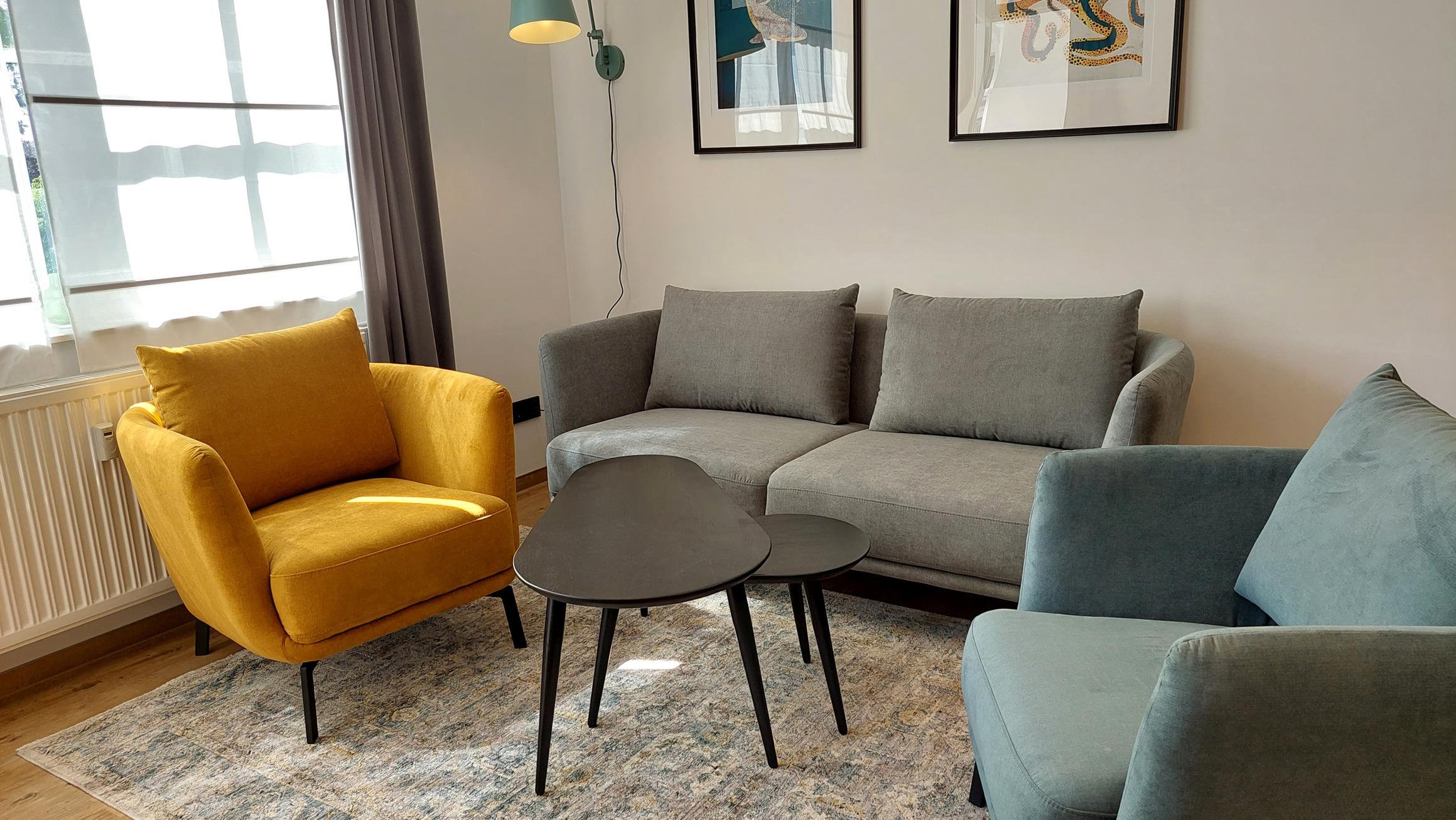 Auch vom Wohnbereich gelangen Sie auf den möblierten Balkon mit wunderbarem Blick ins Grüne.