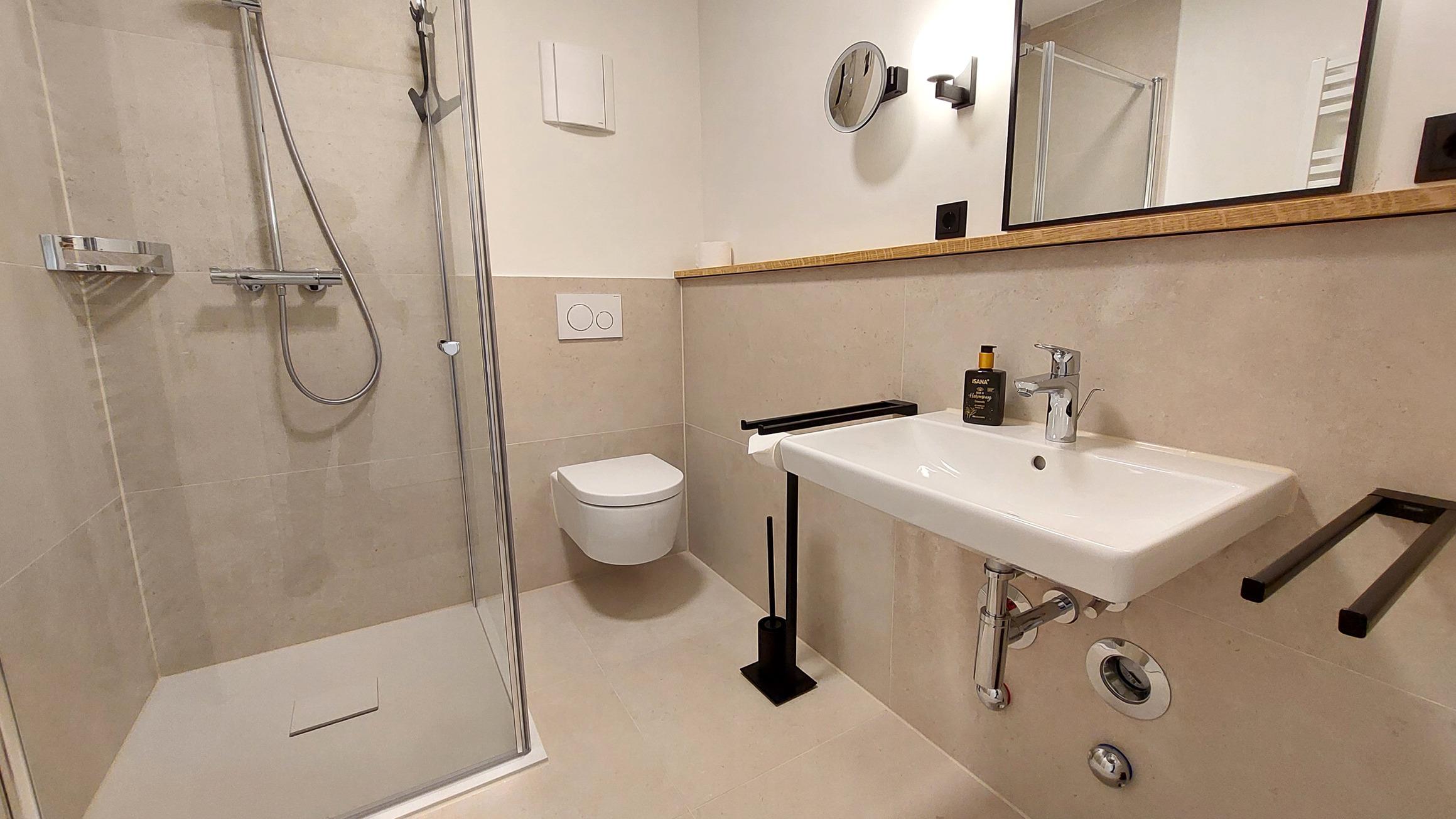 Das helle Badezimmer bietet eine ebenerdige Dusche, WC und Waschtisch.