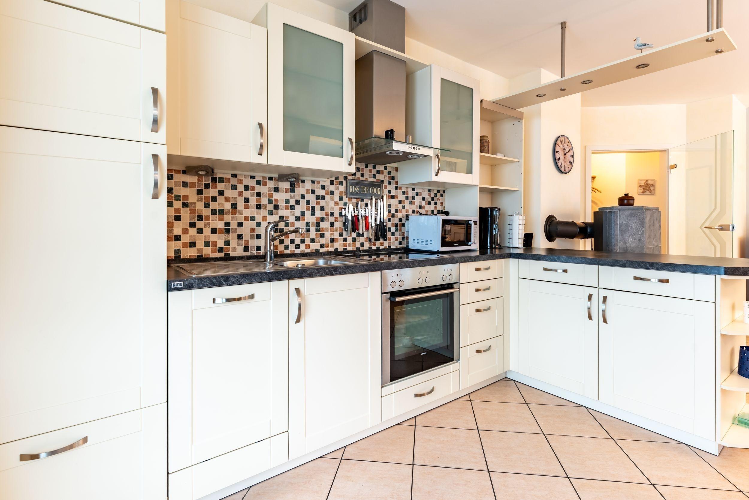 Das Herzstück der Wohnung ist der lichtdurchflutete Wohnbereich. Hier sorgt der Kamin für eine besonders behagliche Atmosphäre. Die gemütliche Sitzgruppe lädt zu entspannten Abenden ein, während die voll ausgestattete, offene Küchenzeile und der angrenzende Essbereich gemeinsame Mahlzeiten in geselliger Runde ermöglichen.