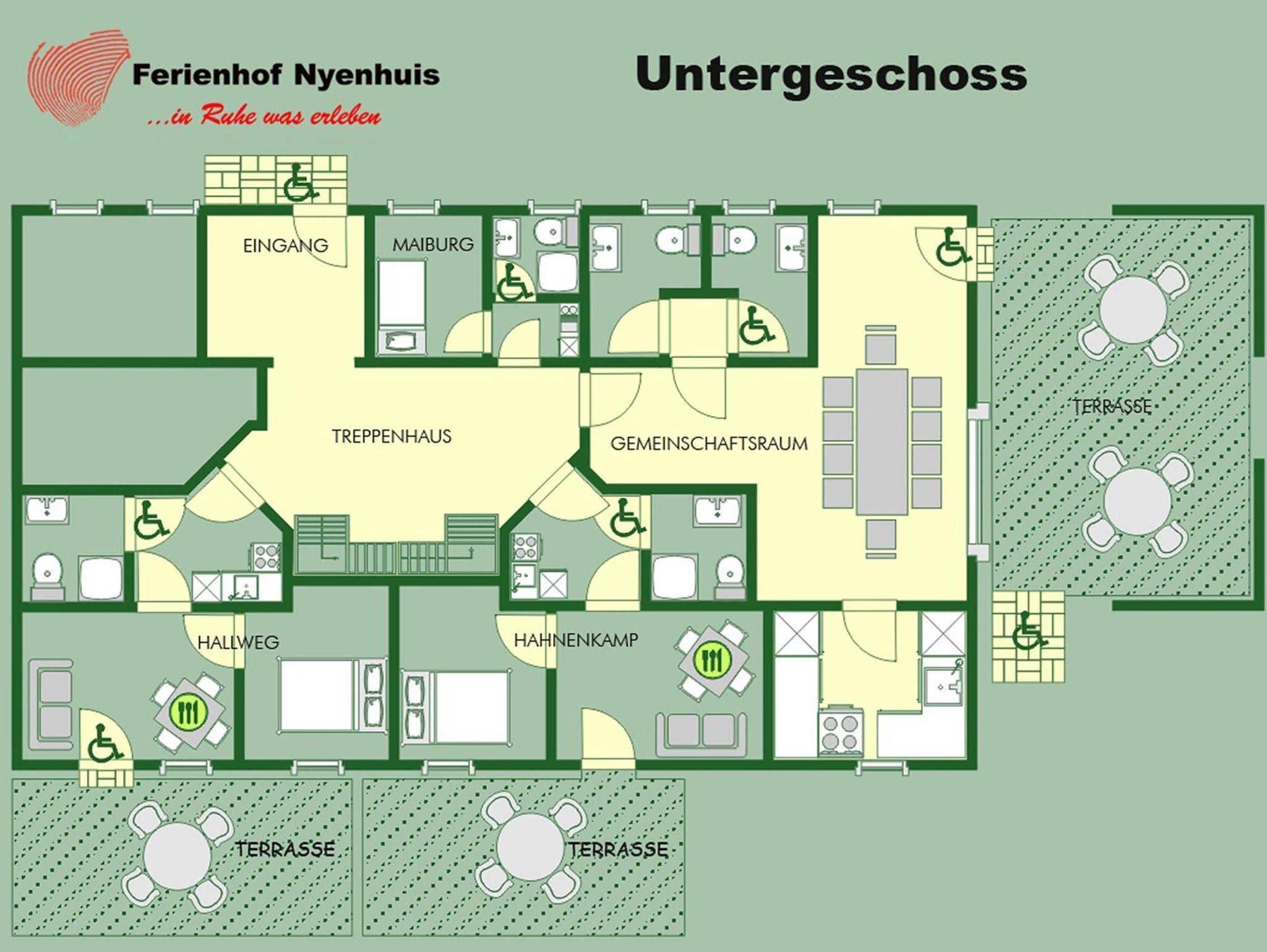 Die Ferienwohnungen Hahnenkamp und Hallweg sind rollstuhlfreundlich. Hunde sind in diesen beiden FeWos willkommen (10,00 EUR Tier/Nacht). Alle Terrassen und Parterreräumlichkeiten sind behindertenfreundlich. Für zusätzliche Schlafgelegenheiten (Schlafcouch, ist in allen Ferienwohnungen möglich) werden 15,00 EUR pro Person/Nacht berechnet. Gruppenpreise bei Ausnutzung aller Schlafgelegenheiten 50,00 EUR Person/Nacht inkl. Frühstück bei 1 Übernachtung, 45,00 € bei 2 Übernachtungen und 40,00 € ab 3 Übernachtungen. Die alleinige Nutzung vom großen Aufenthaltsraum mit Terrasse, TV-SAT und eigener Küche für bis zu 25 Personen ist damit inbegriffen.