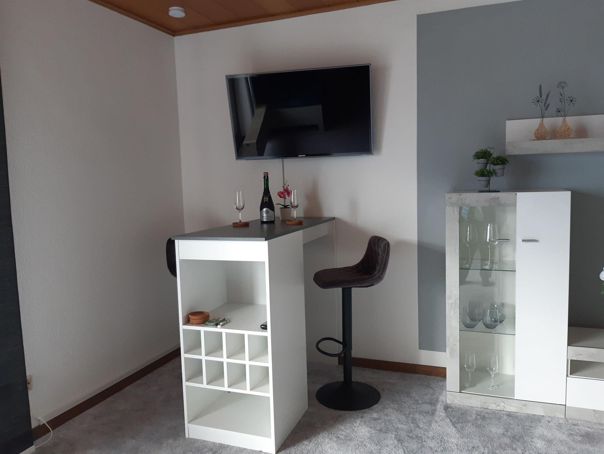 Im Wohnzimmer befindet sich ein separates Einzelbett und eine Doppelschlafcouch, eine Essecke für 4 Personen, eine kleine Theke und ein großer Fernseher. W-LAN Anschluss ist vorhanden und kostenfrei. Aus dem Wohnzimmer gelangt man direkt auf die Terrasse mit wunderschönem Blick auf die alte Eiche.