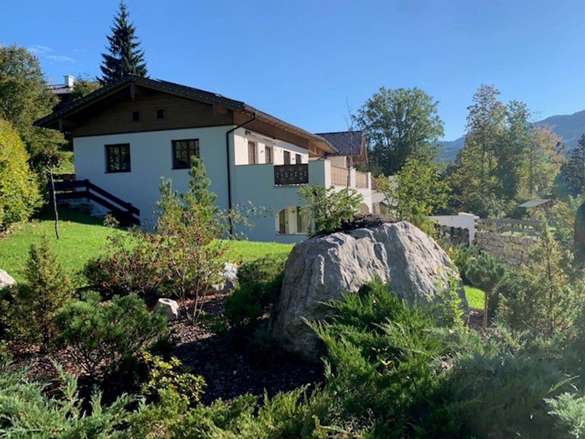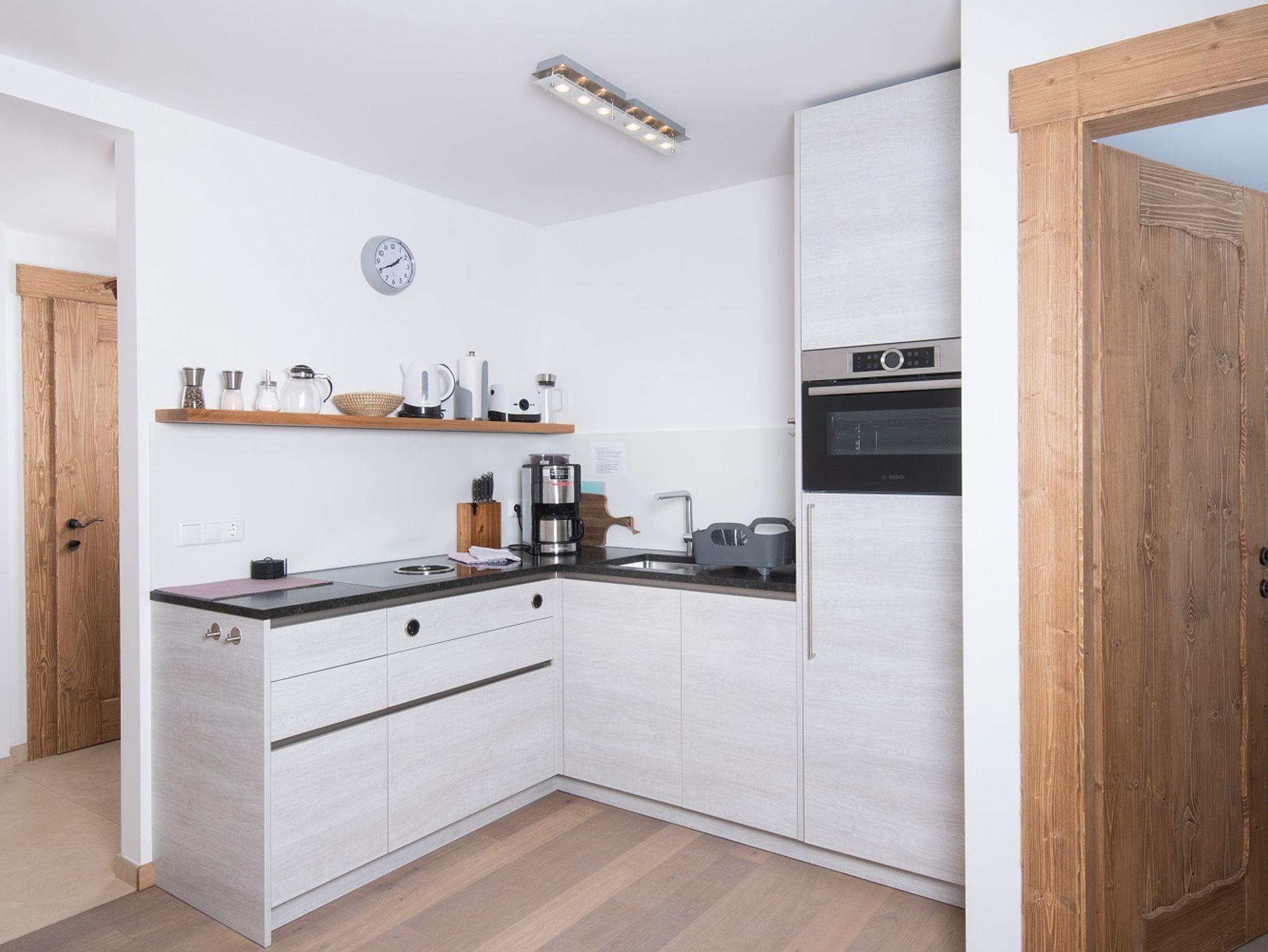 Einrichtung in alpin-modernem Stil, Echtholzparkett, Fußbodenheizung, moderne vollausgestattete Küche, Bad mit Walk-In-Dusche, Schlafzimmer mit Boxspring-Doppelbett, überdachte Aussichtsterrasse.