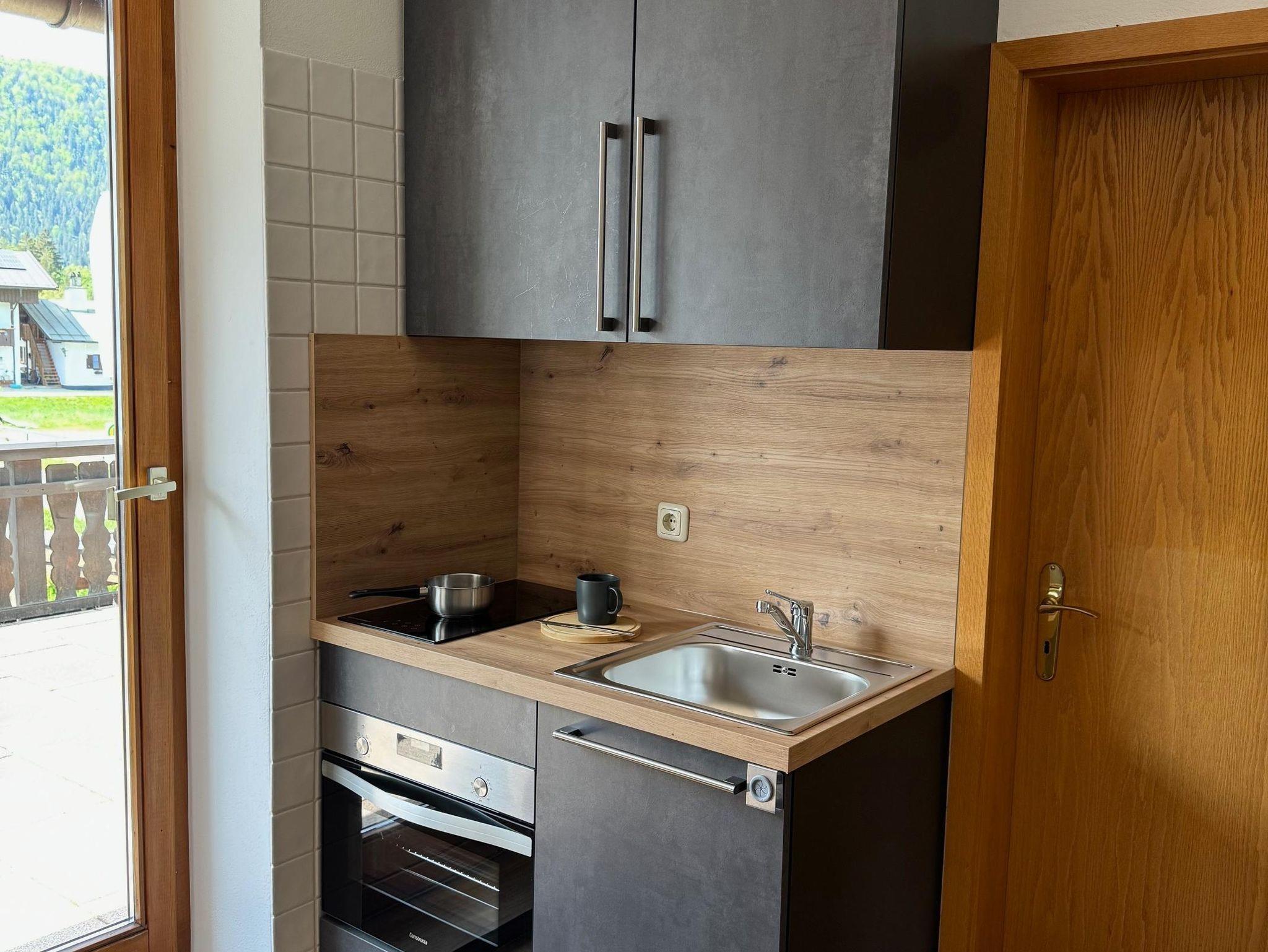 Das Highlight der gemütlichen Wohnung ist der große Balkon mit Sitzgruppe, von dem aus man den Sonnenuntergang hinter den Berggipfeln bewundern kann. Ein Beistellbett für Babys wäre auf Anfrage möglich.