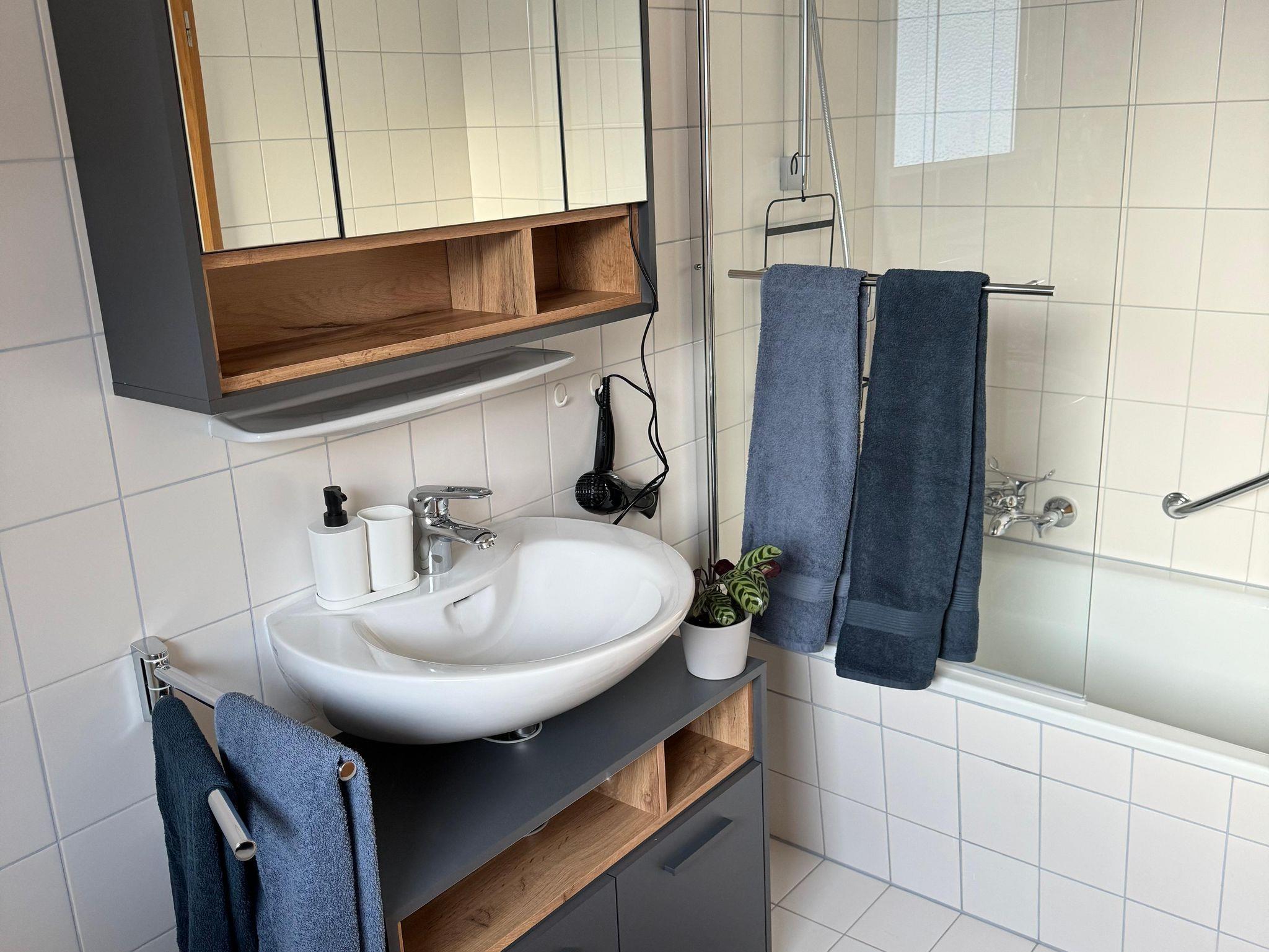 Das große Bad verfügt über eine Dusch-Wanne, Handtücher sind inbegriffen.