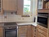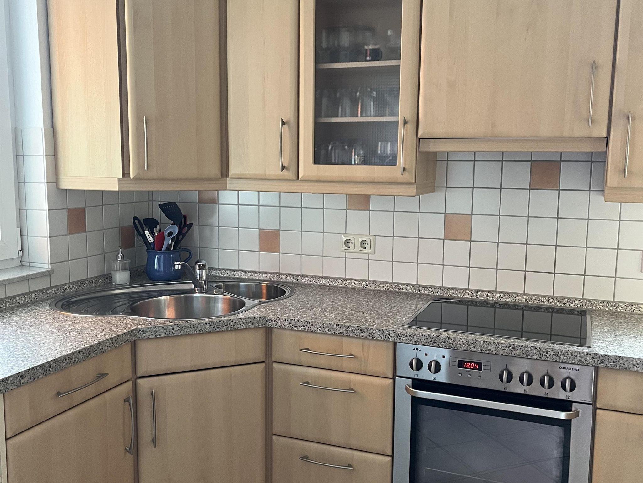 Die Küche beinhaltet einen Kühlschrank, einen Backofen, ein Kochfeld, eine Mikrowelle, einen Geschirrspüler sowie Kaffeemaschine, Wasserkocher und Toaster.