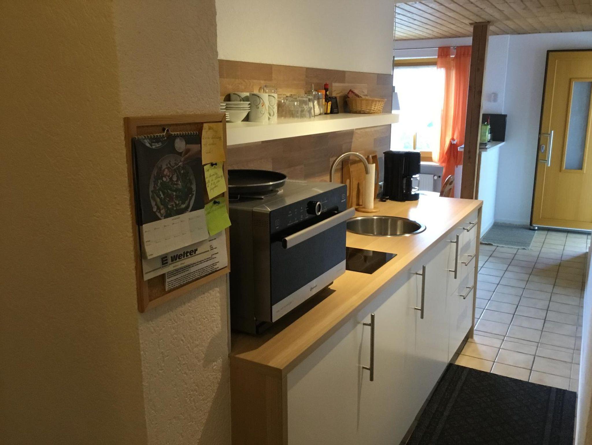 Wohnküche mit Küchenzeile, Kühlschrank, 2-Platten-Kochfeld, Kaffeemaschine, Toaster,
