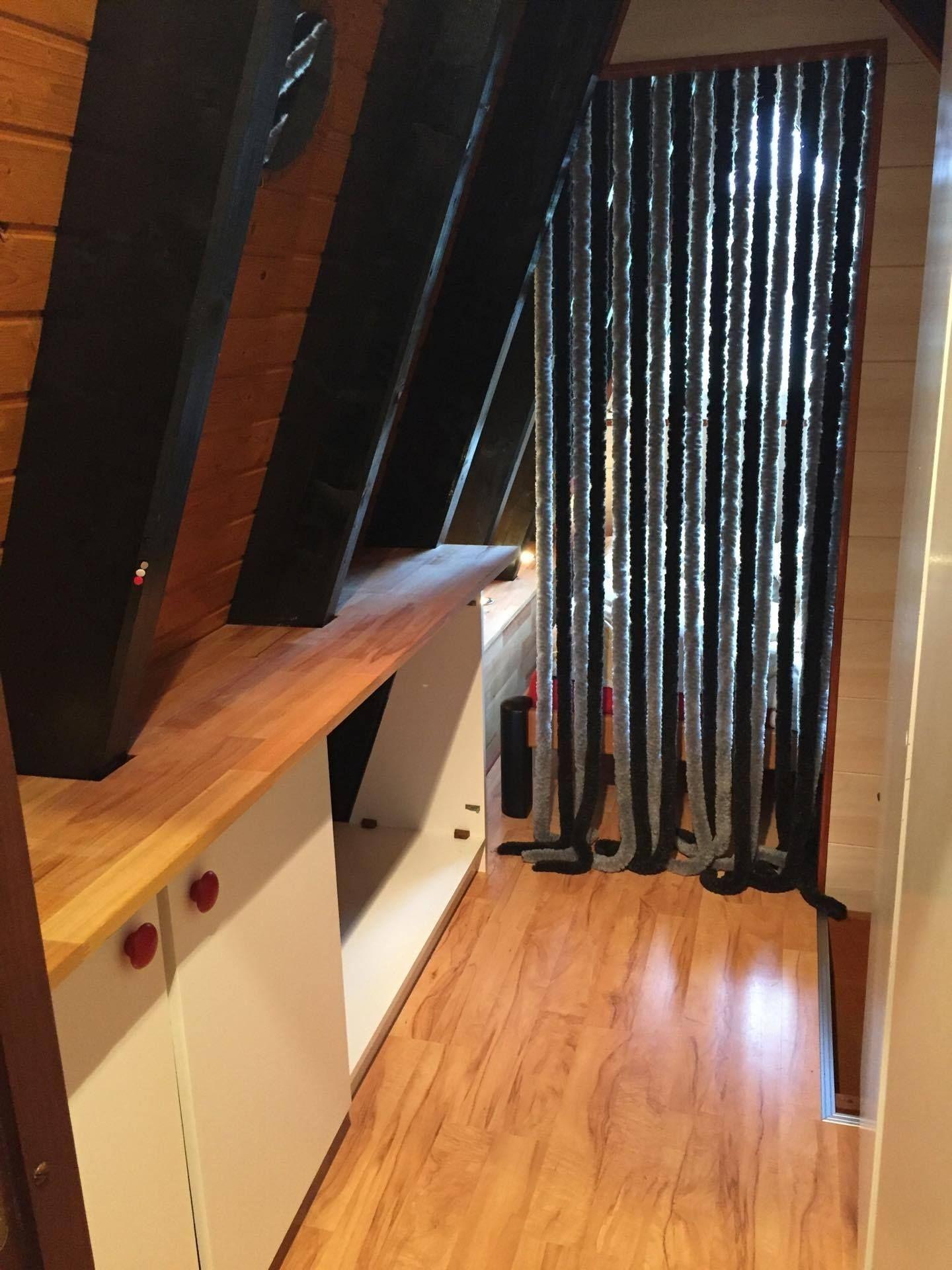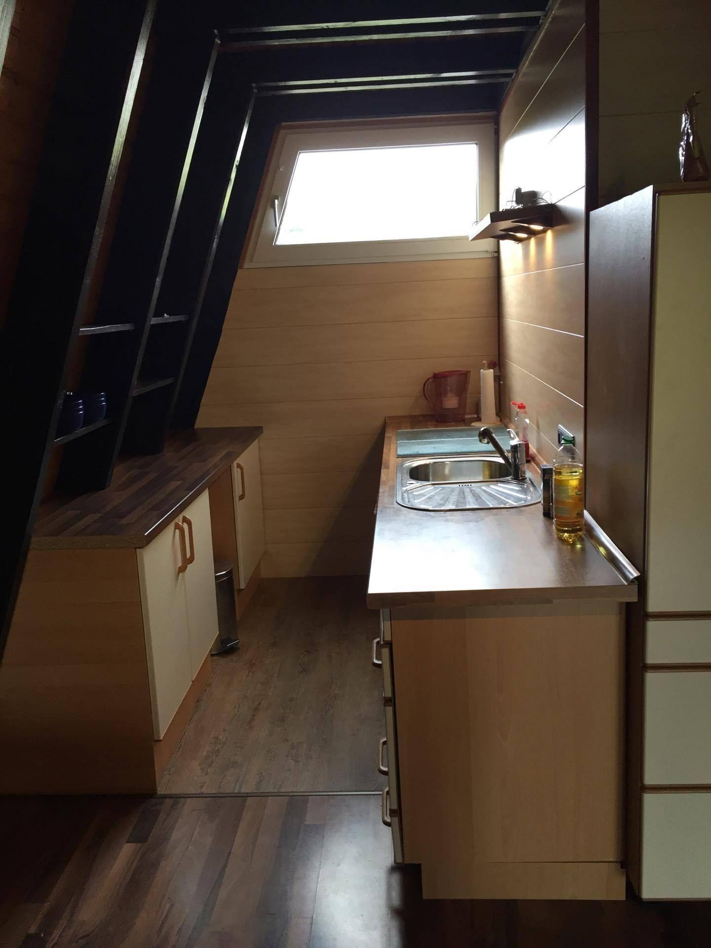 Im unteren Stockwerk des Hauses befindet sich ein großes Wohnzimmer mit einer Essecke sowie einer Küche. Vorhanden sind in dieser, neben einer Mikrowelle und einem Herd (inklusive Backofen) eine Kaffeemaschine und ein Wasserkocher. Auch Töpfe, Teller und Besteck sind vorhanden.