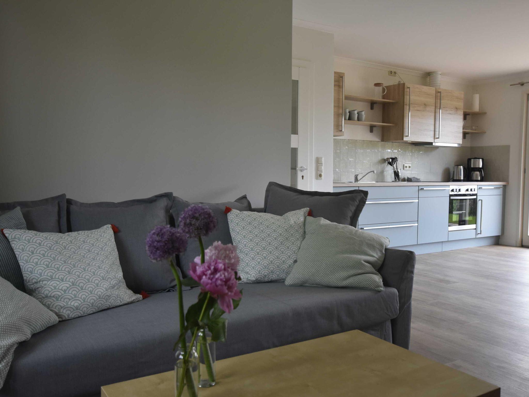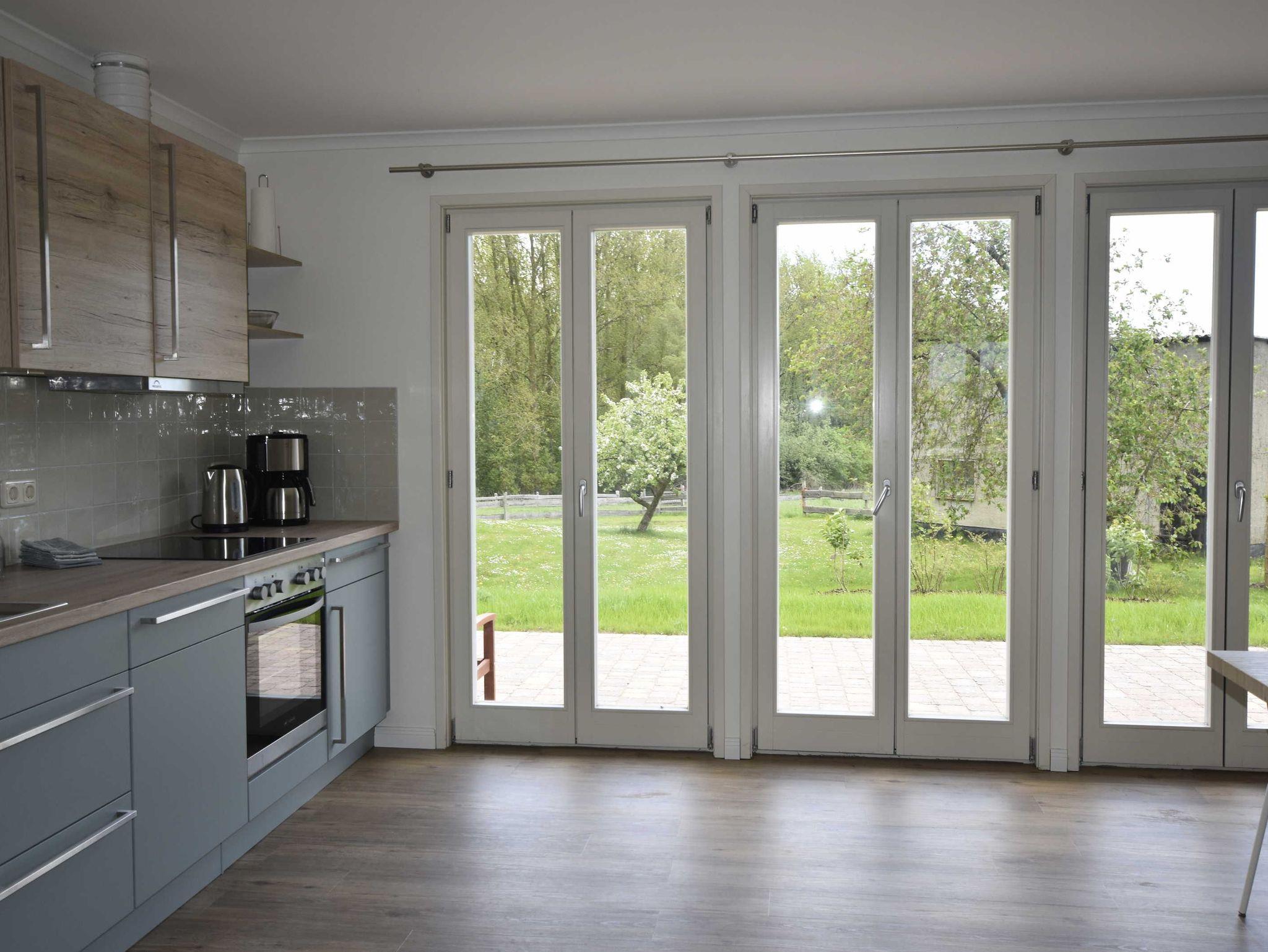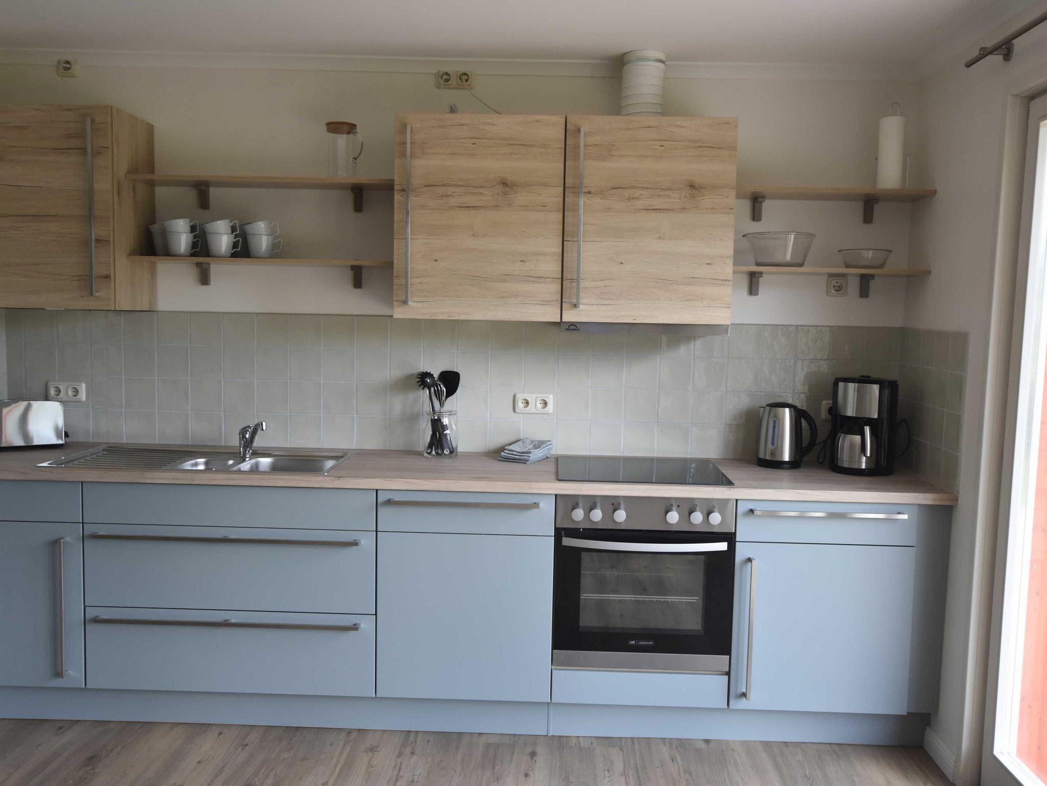Neu gebautes (Fertigstellung April 2021) 4-Raum-Ferienhaus (94 qm) bis zu 8 Personen mit 2 Bädern. Ideal für Familien mit Kindern. Modern, farbenfroh und freundlich eingerichtet. Wohnzimmer mit integrierter Küche, großem Eßtisch und Sitzecke. Küche ausgestattet mit 4 Platten Ceranfeld, Geschirrspülmaschine, Backofen, Mikrowelle, Kaffeemaschine, Wasserkocher. 1 Schlafzimmer mit Doppelbett, 2 Schlafzimmer mit jeweils 2 Einzelbetten. Aufbettung für 7. und 8. Person im Wohnzimmer auf ausziehbarer Schlafcouch (=Doppelbett). Es gibt 2 Badezimmer; 1 Badezimmer mit Dusche, WC und Waschbecken und 1 Badezimmer mit Badewanne, WC und Waschbecken. Direkter Zugang vom Wohnzimmer zur Terrasse mit Gartenmöbel.