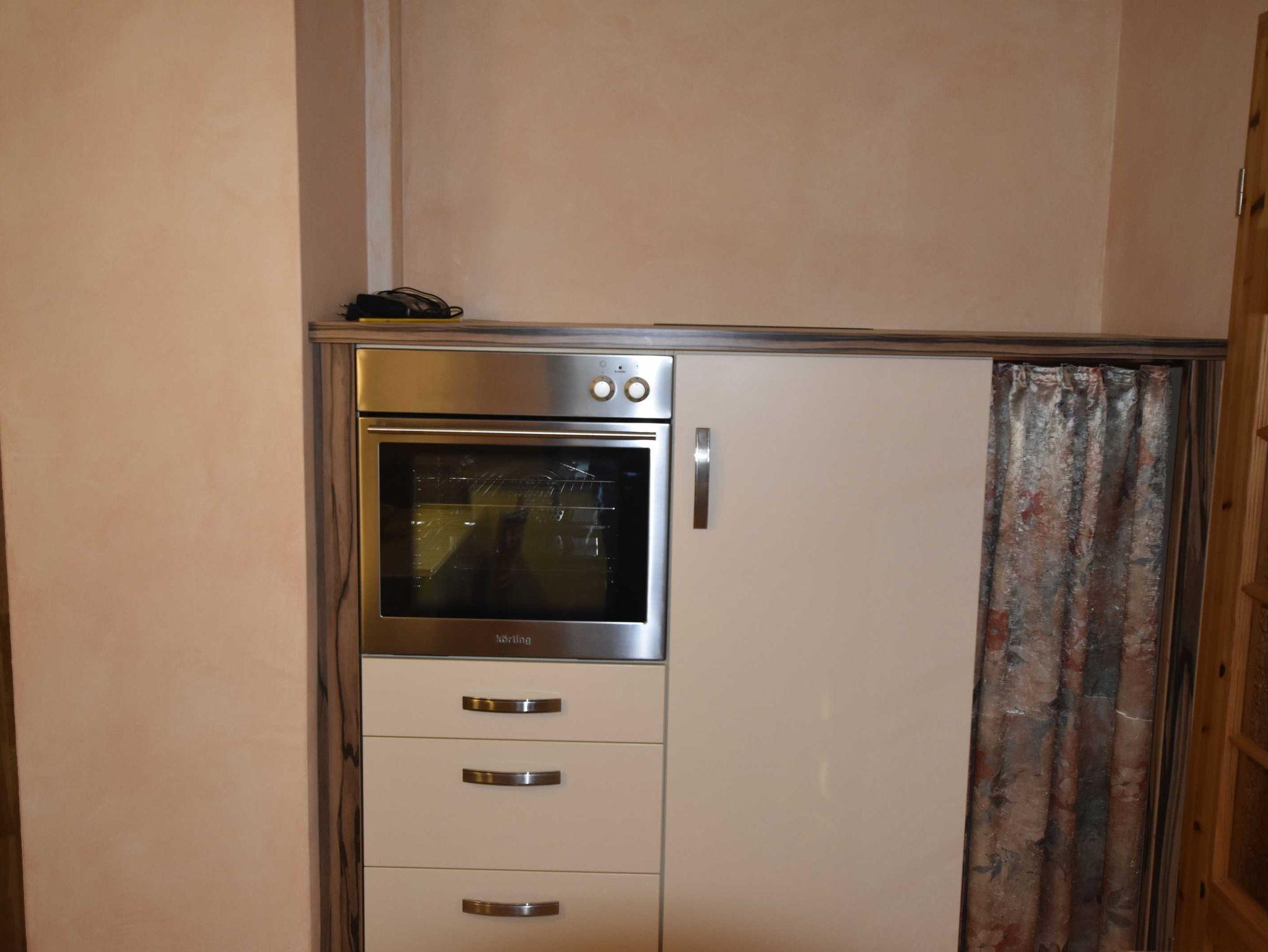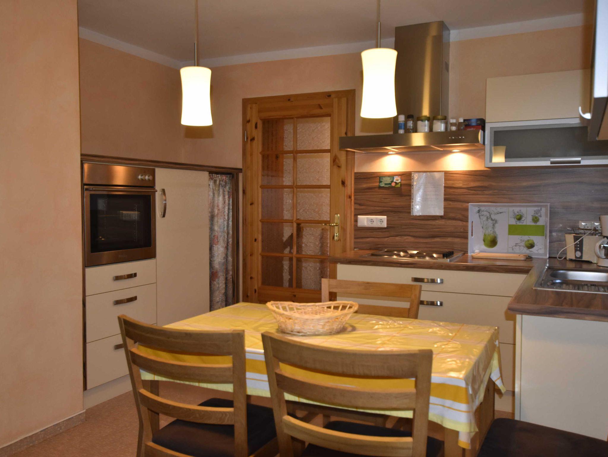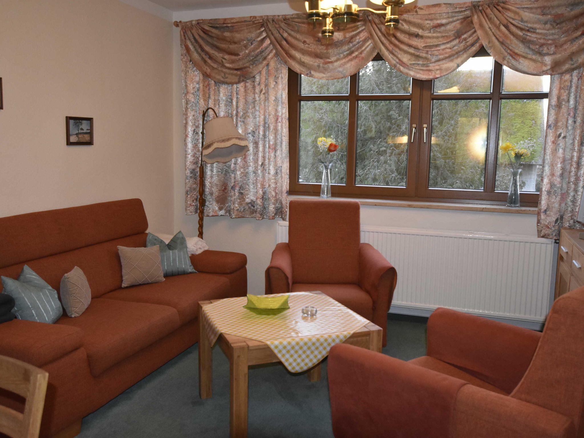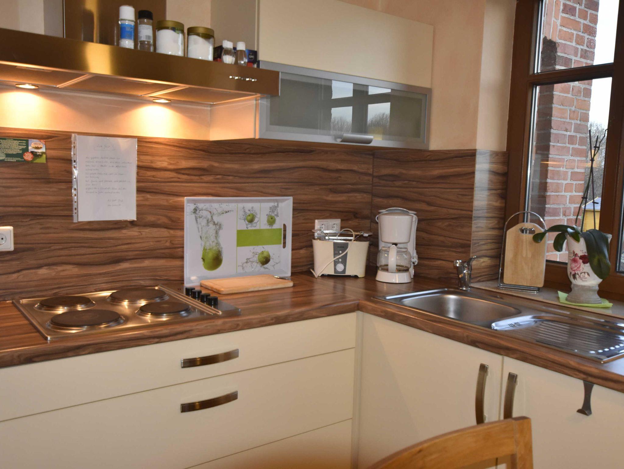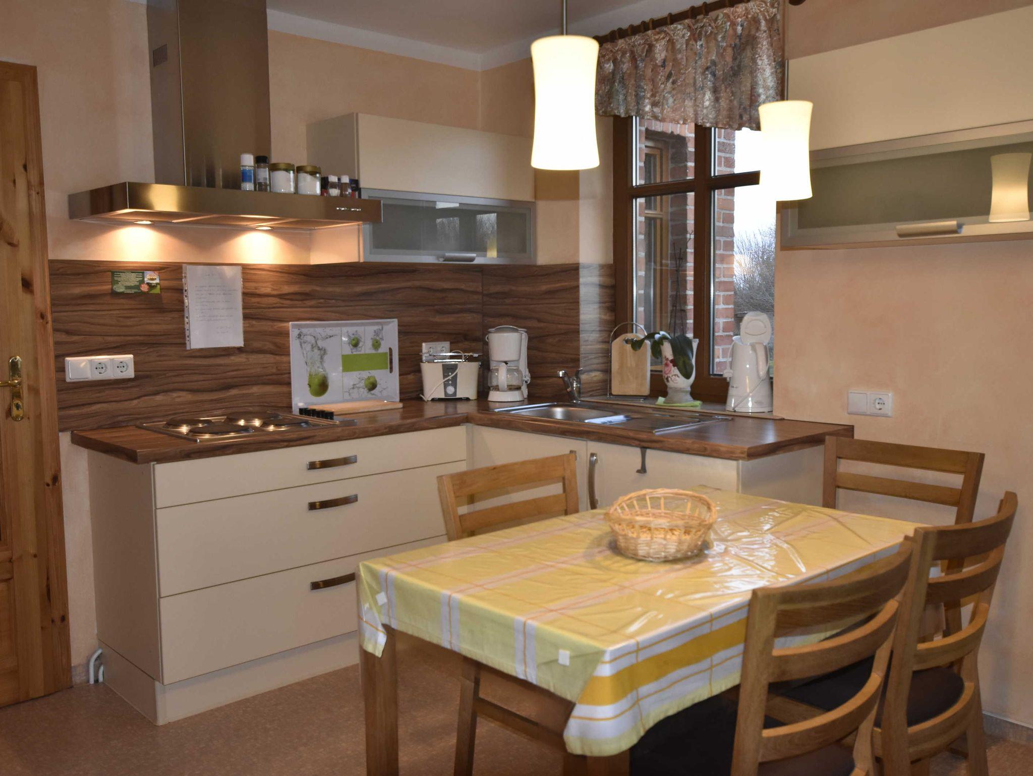 Liebevoll und neu renovierte 3-Raum-Ferienwohnung. Eingangstür im EG, über den kleinen Flur und Treppe gelangt man ins OG. Das Wohnzimmer ist ausgestattet mit Couch, Esstisch, Stühlen, Sat.-TV, DVD Player und Radio. Die Küche, integriert im Wohnzimmer, ist ausgestattet mit 4-Plattenherd, Backofen, Toaster, Kaffeemaschine, Wasserkocher und Kühlschrank.