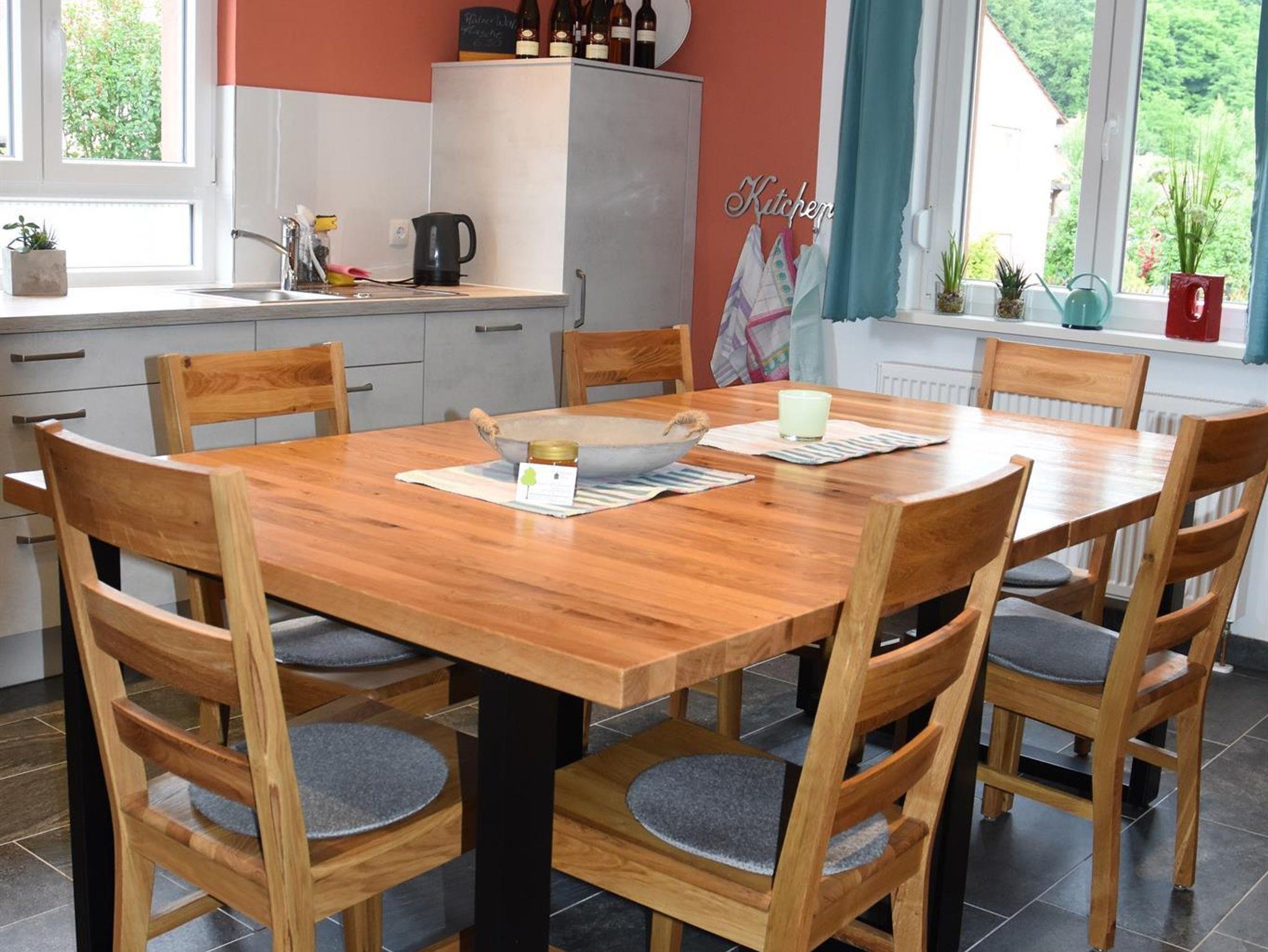 Unsere Ferienhaus bietet mit seinen 5 Schlafzimmern mit Doppelbetten, 3 Bädern, einem separaten WC und einer volleingerichteten Küche mit großem Tisch und Wohnzimmer ausreichend Platz für Ihren Urlaub im Pfälzerwald.