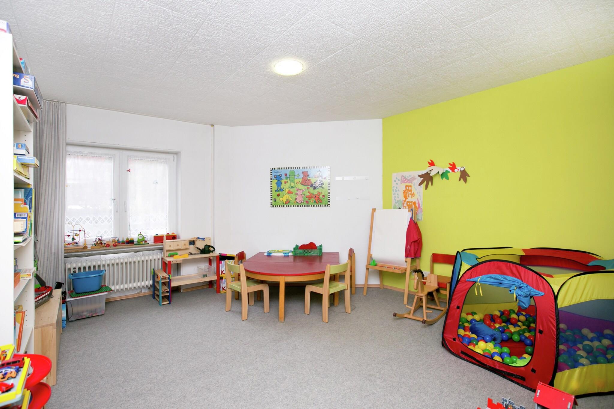 Abschliessbare Halle für Fahrräder und Motorräder. Gästewaschzimmer mit Waschmaschine, Trockner und Bügelbrett stehen bereit und ein Indoorspielzimmer mit Tischtennisplatte, Kicker und Mal-Bastel- und Spielbereich.
