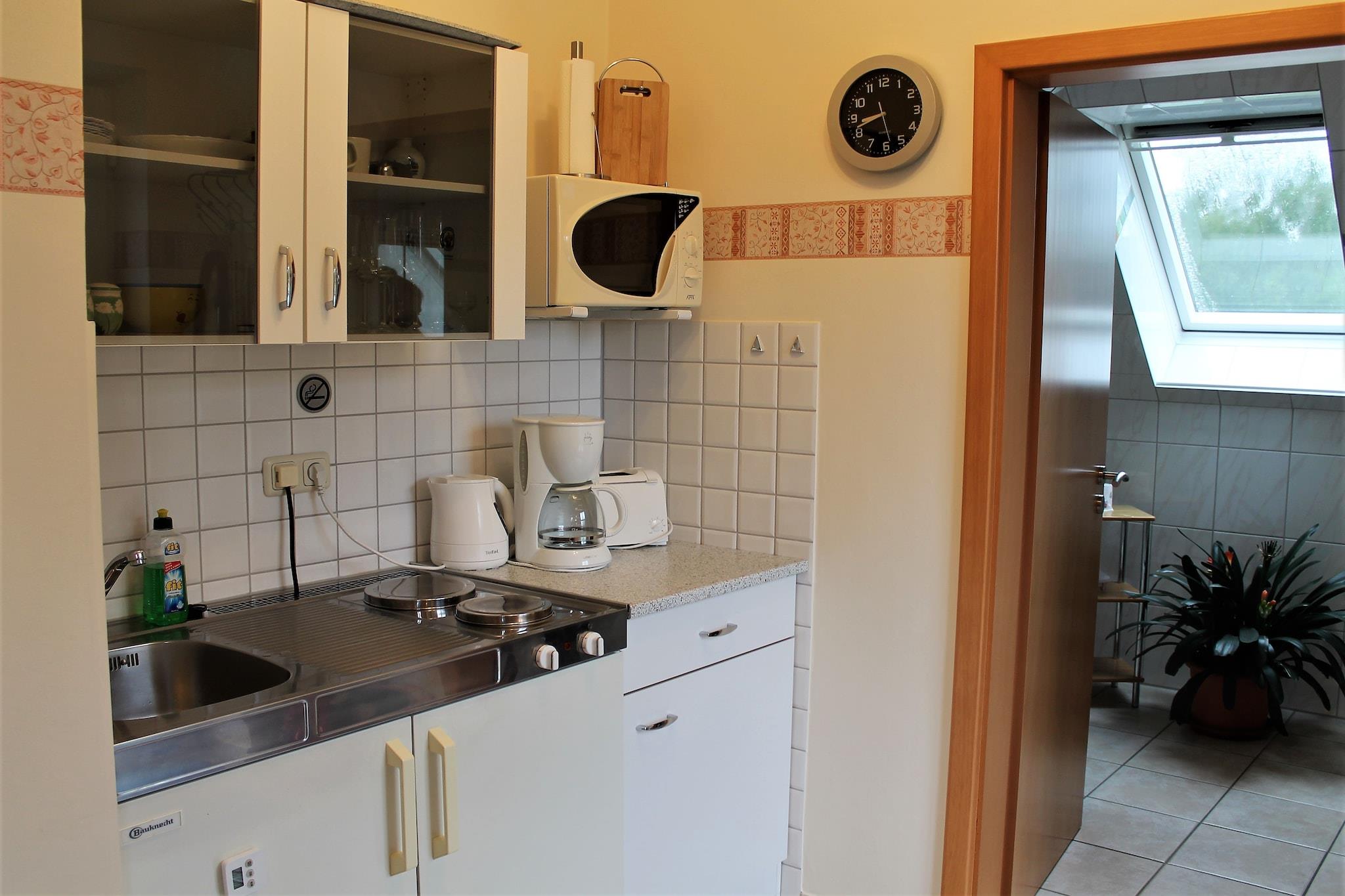 In der 1. Etage: (Eingang(von außen erreichbar), Kochnische(Wasserkocher, Toaster, Kochherd(2 Kochplatten), Kaffeemaschine), Wohn-/Schlafzimmer(Doppelbett, TV(Flatscreen, Satellit)), Badezimmer(Dusche, Waschbecken, Toilette), Kinderbett, Hochstuhl) Dachgeschoss: (Einzelbett) Grill, Terrasse, Garten, Gartenmöbel, Parkplatz, Fahrräder verfügbar