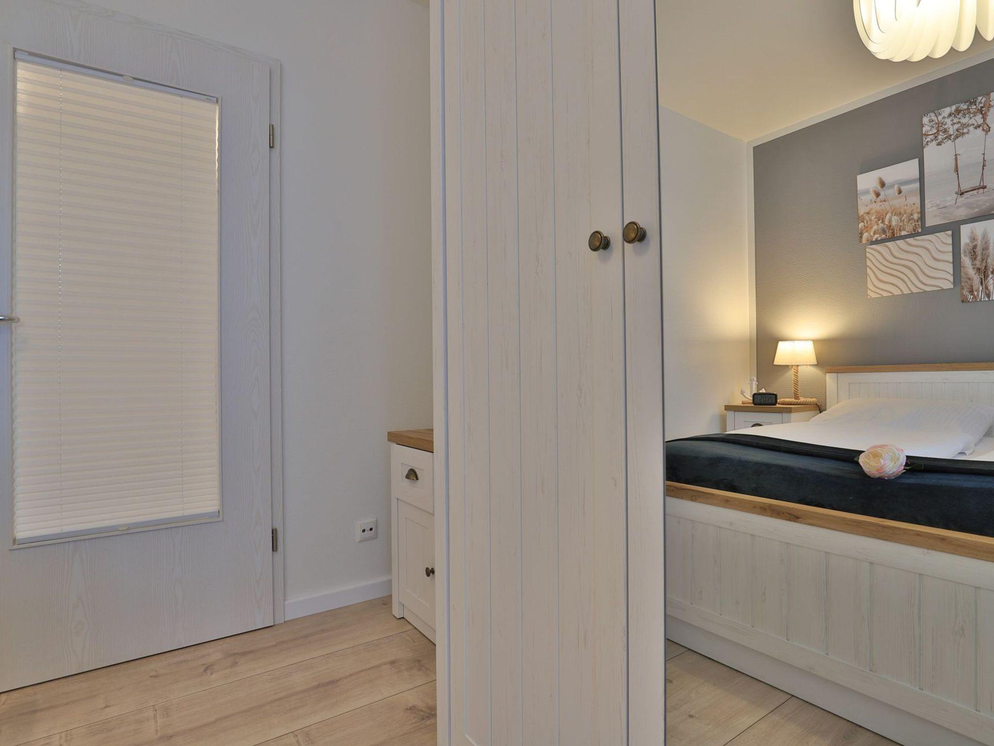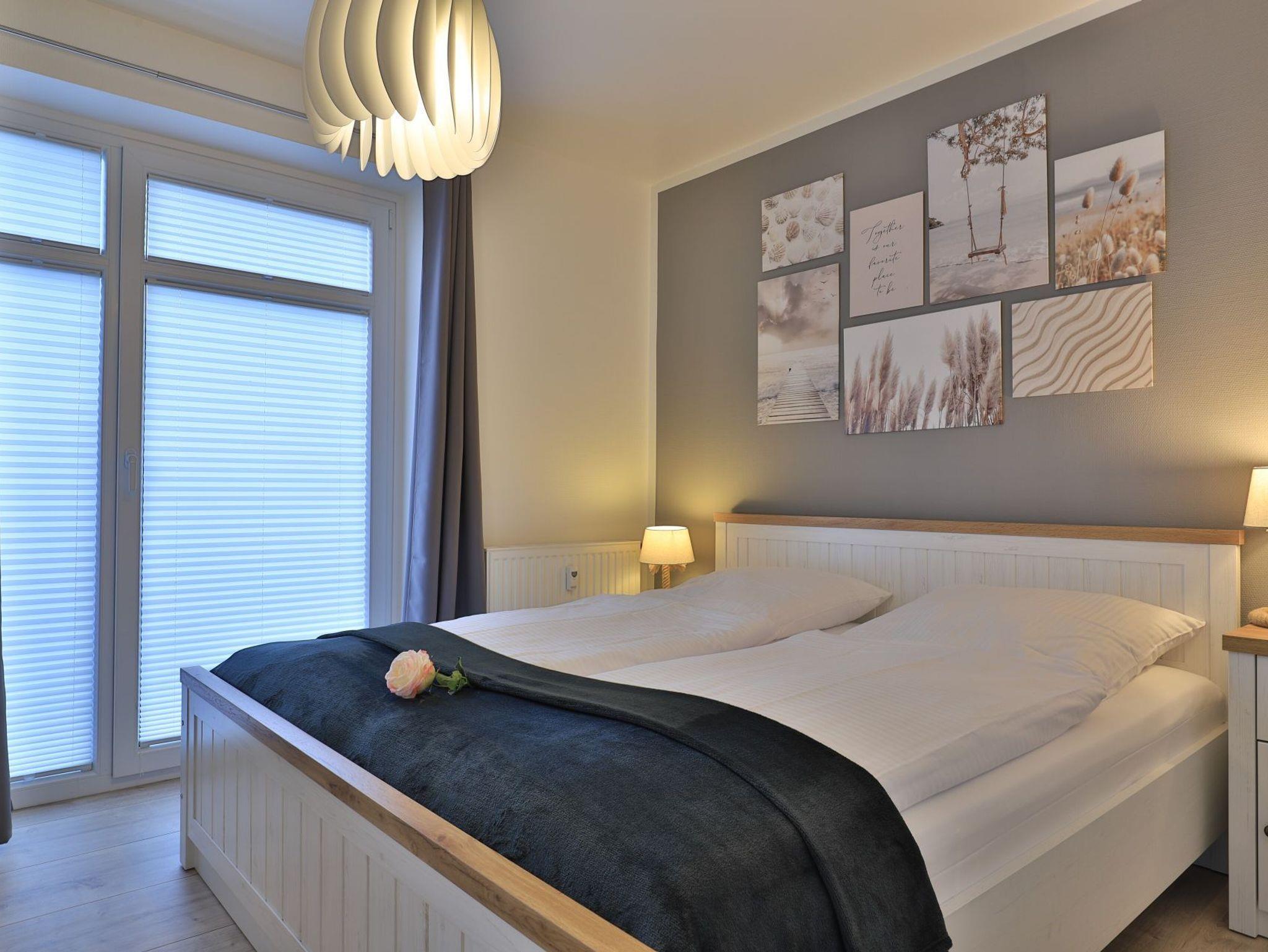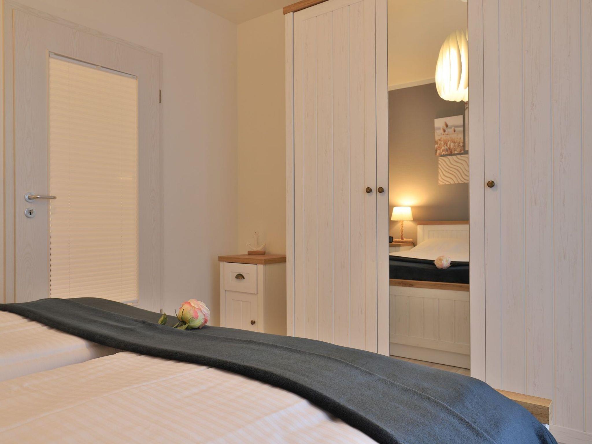 Das separate Schlafzimmer ist mit einem bequemen Doppelbett und Kleiderschrank eingerichtet.Zugehörig ist ein modernes Badezimmer mit bodentiefer Dusche, Waschtisch, WC.