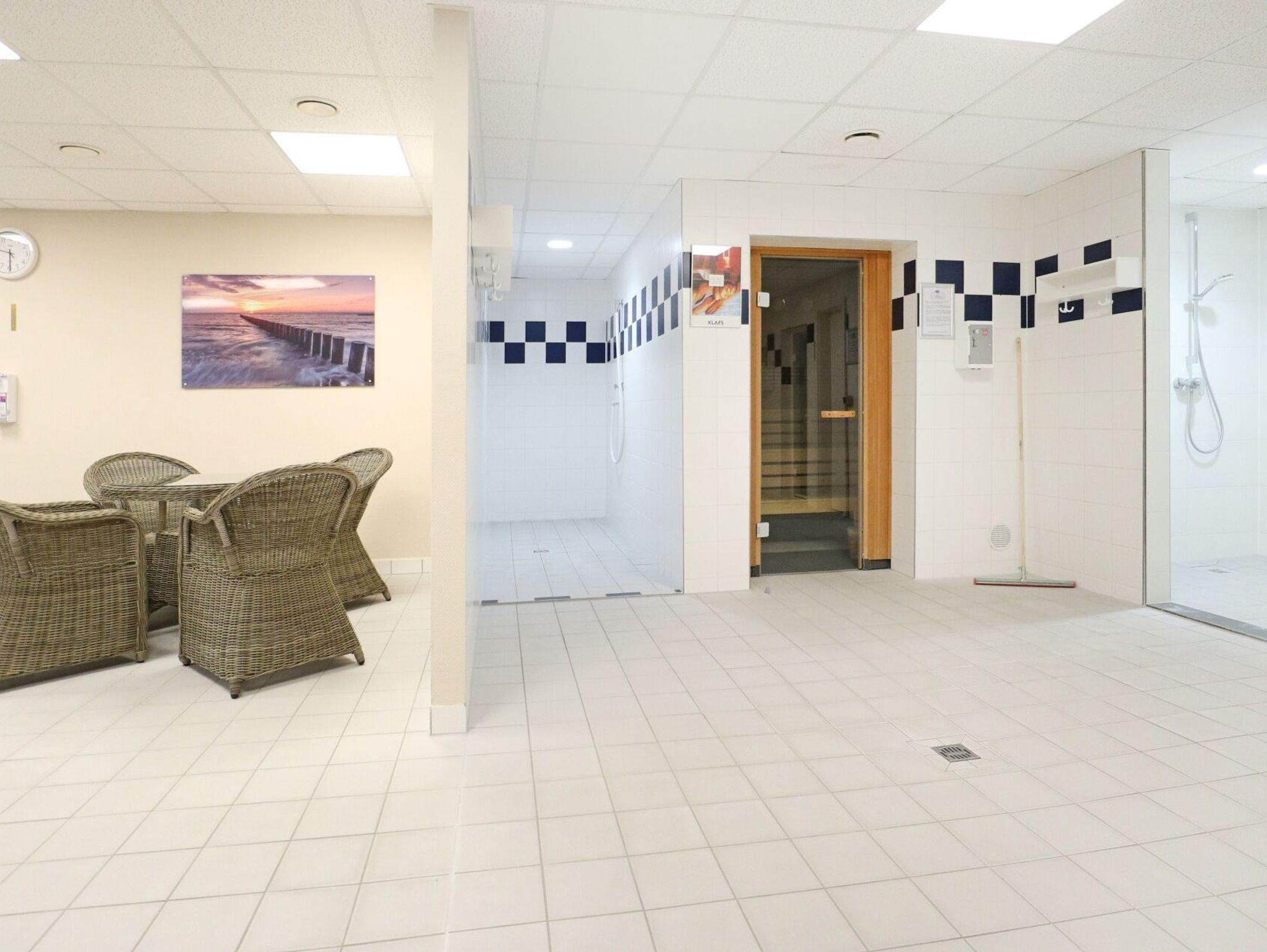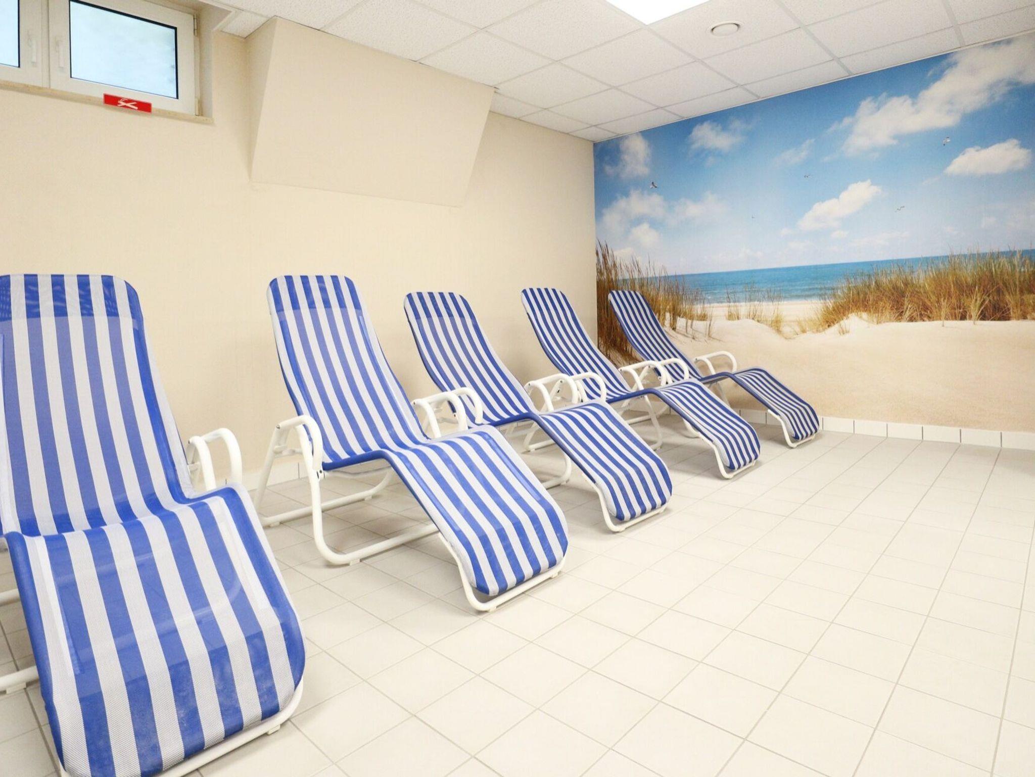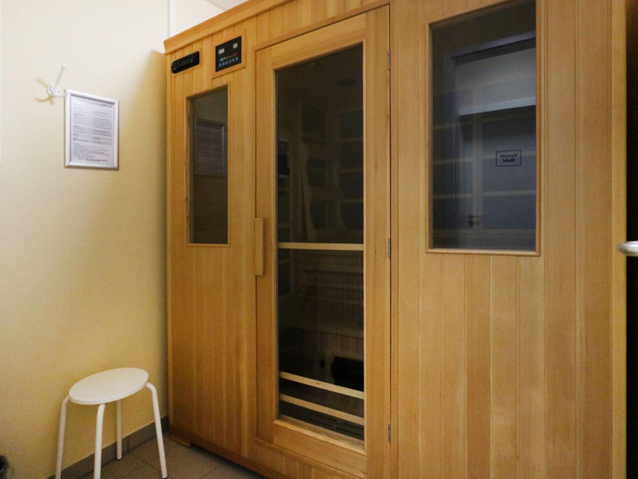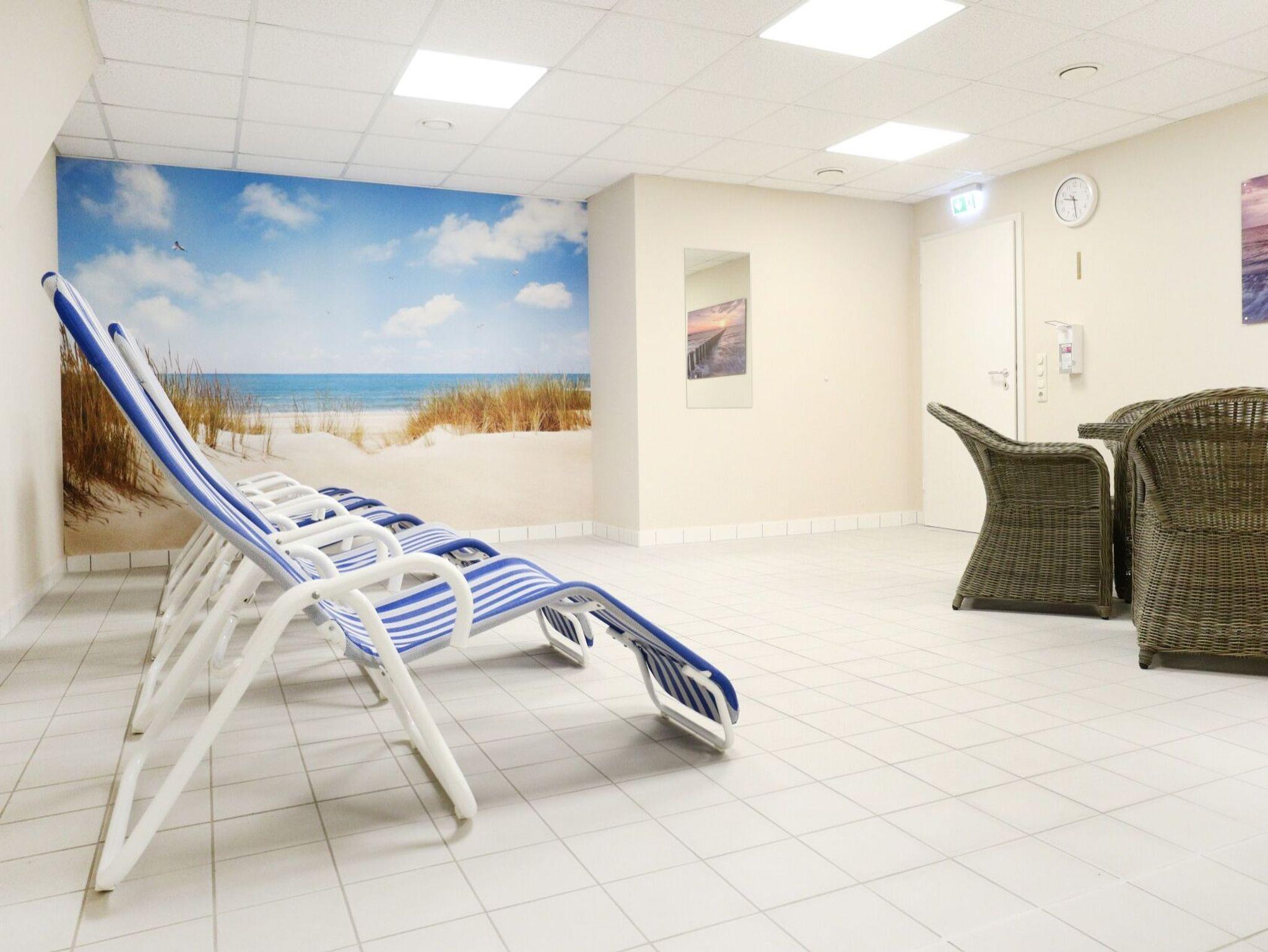 Ein reservierter PKW-Stellplatz befindet sich direkt vor dem Haus. Ganzjährig können Sie den geräumigen Fitnessraum nutzen. Im hauseigenen Wellnessbereich stehen gegen Gebühr eine Sauna und eine Infrarotkabine zur Verfügung. In dem Haus befinden sich Waschmaschine und Wäschetrockner mit Münzeinwurf.