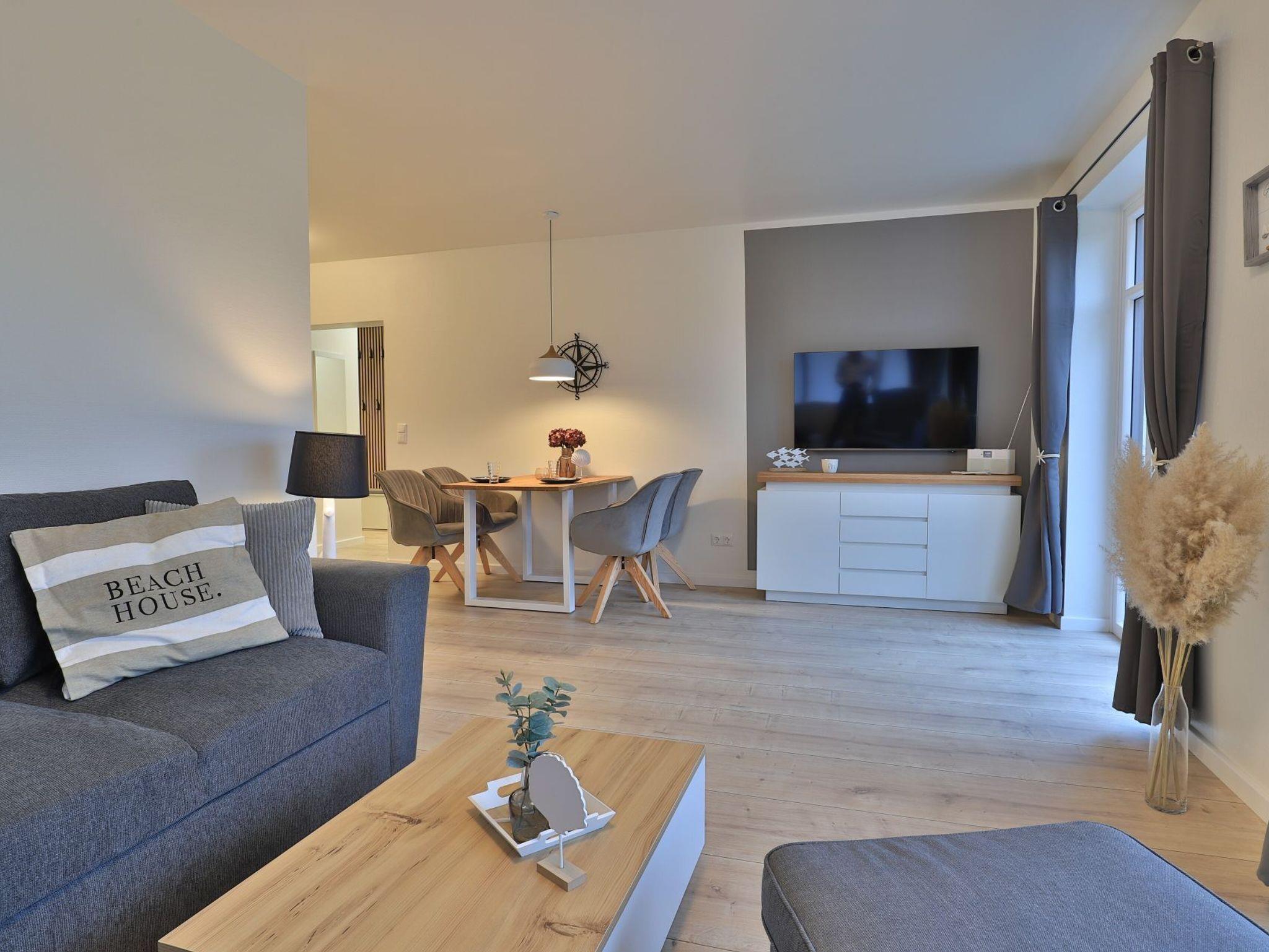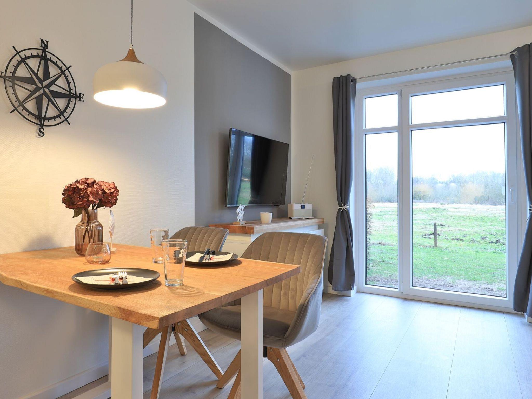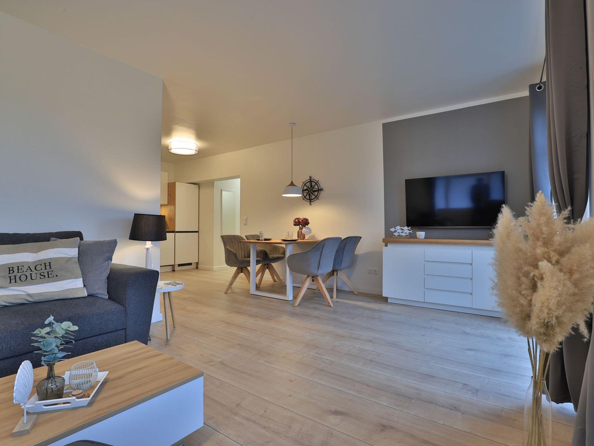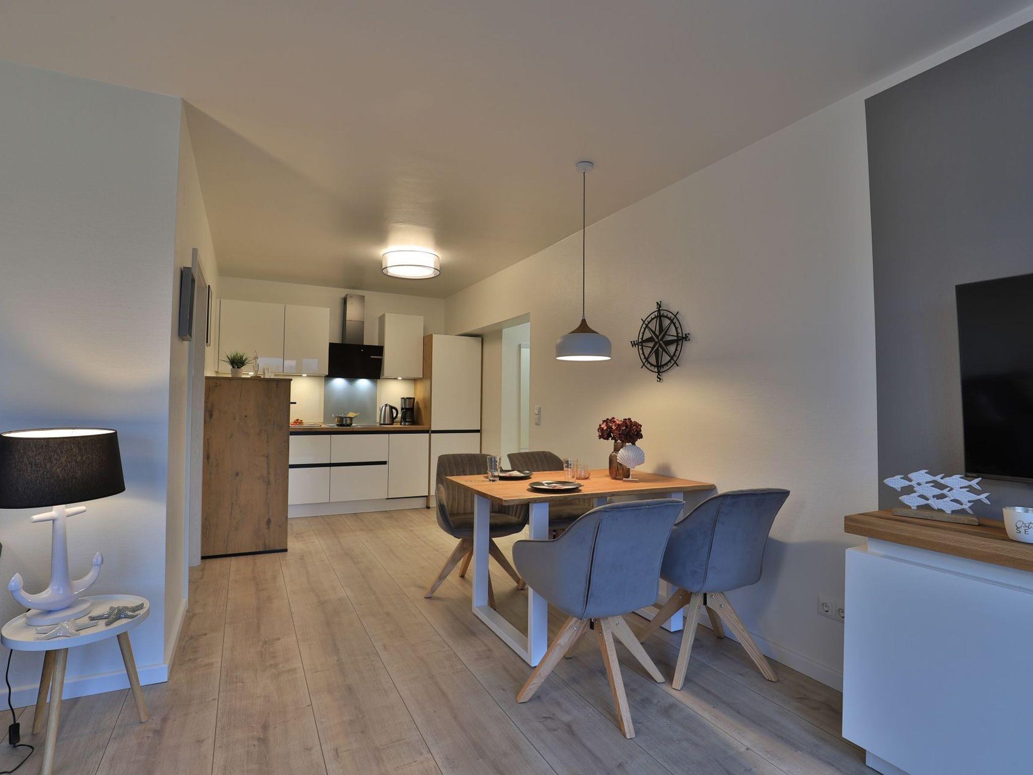 Das modernisierte 2-Zimmer Appartement befindet sich im Erdgeschoss und begeistert mit bester Ausstattung und stilvoller Möblierung. Die Wohnfläche ist mit 50m² ideal für eine Belegung mit bis zu 3 Personen. Im offenen Wohn-/Essbereich ermöglicht ein ausziehbares Komfortsofa eine dritte Schlafgelegenheit. Auch der Relax -Sessel lädt zum Entspannen ein. In der hochwertigen Küchenzeile können die Urlaubsmahlzeiten zubereitet werden: Herd, Backofen, Toaster, Kaffeemaschine, Wasserkocher, Geschirrspüler usw. laden zum Kochen ein. Für Unterhaltung sorgen ein Fernseher (kostenloser Sky-TV-/Primere Empfang) und eine Musikanlage. WLAN steht ohne zusätzliche Gebühr bereit. Dies Wohneinheit bietet eine saisonal möblierte Süd-Terrasse mit Strandkorb und dem zauberhaften Blick auf die Haffwiesen.