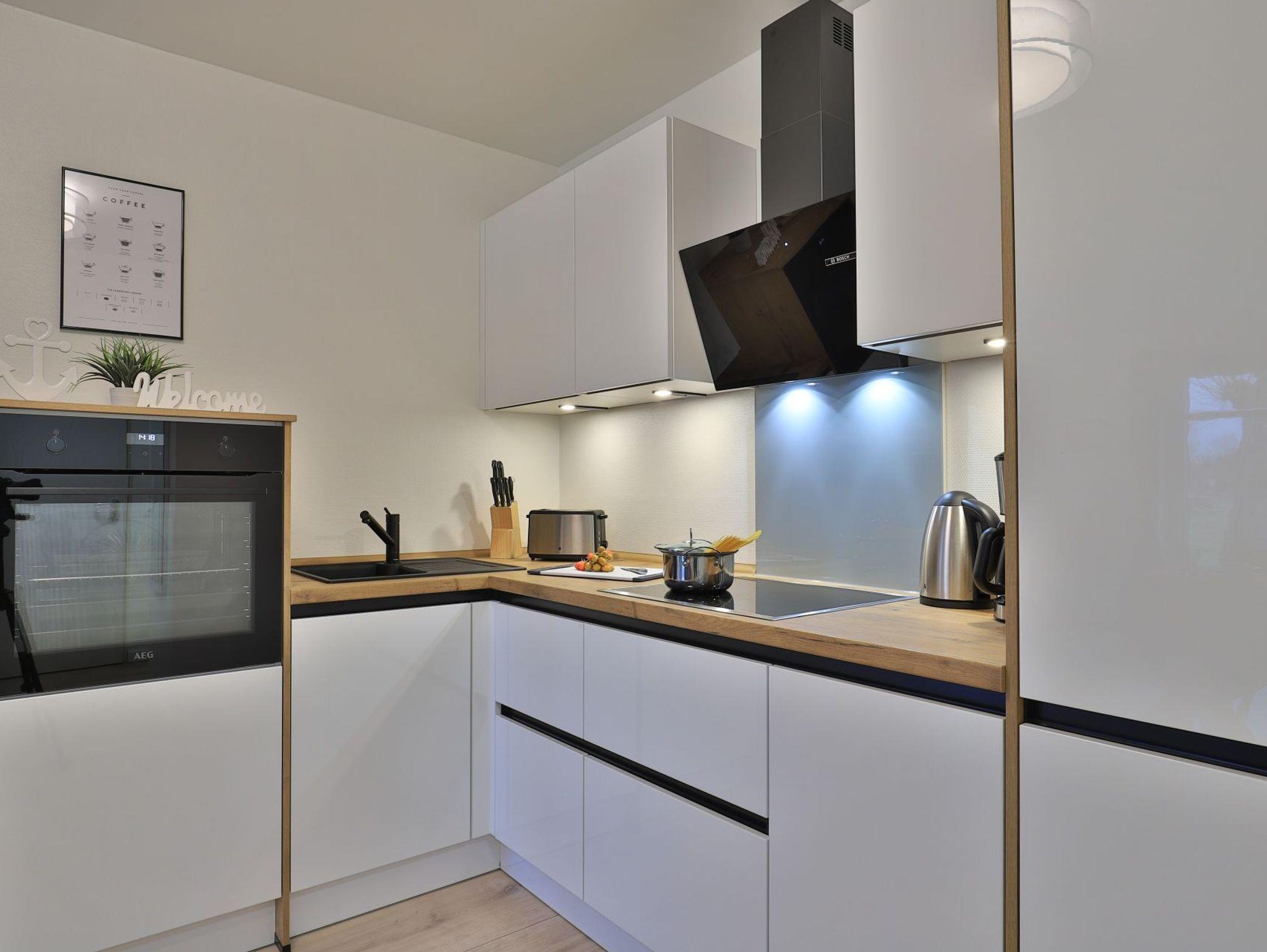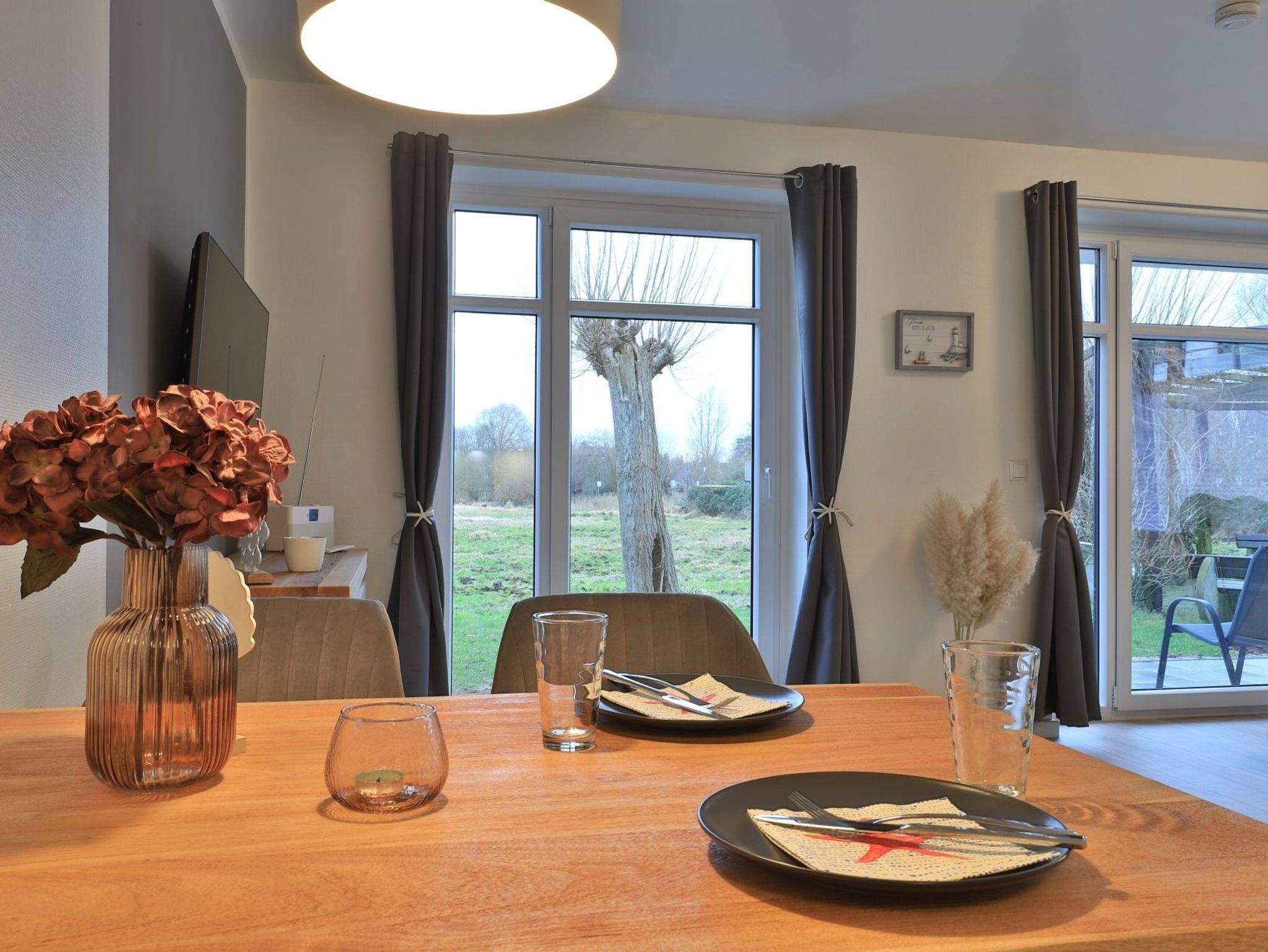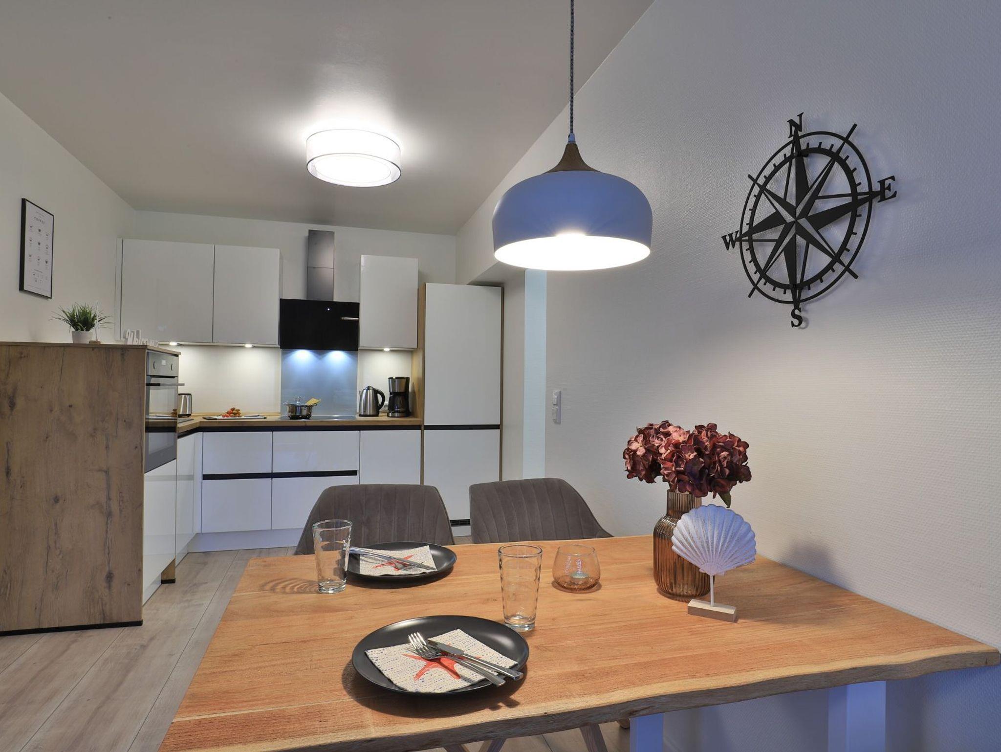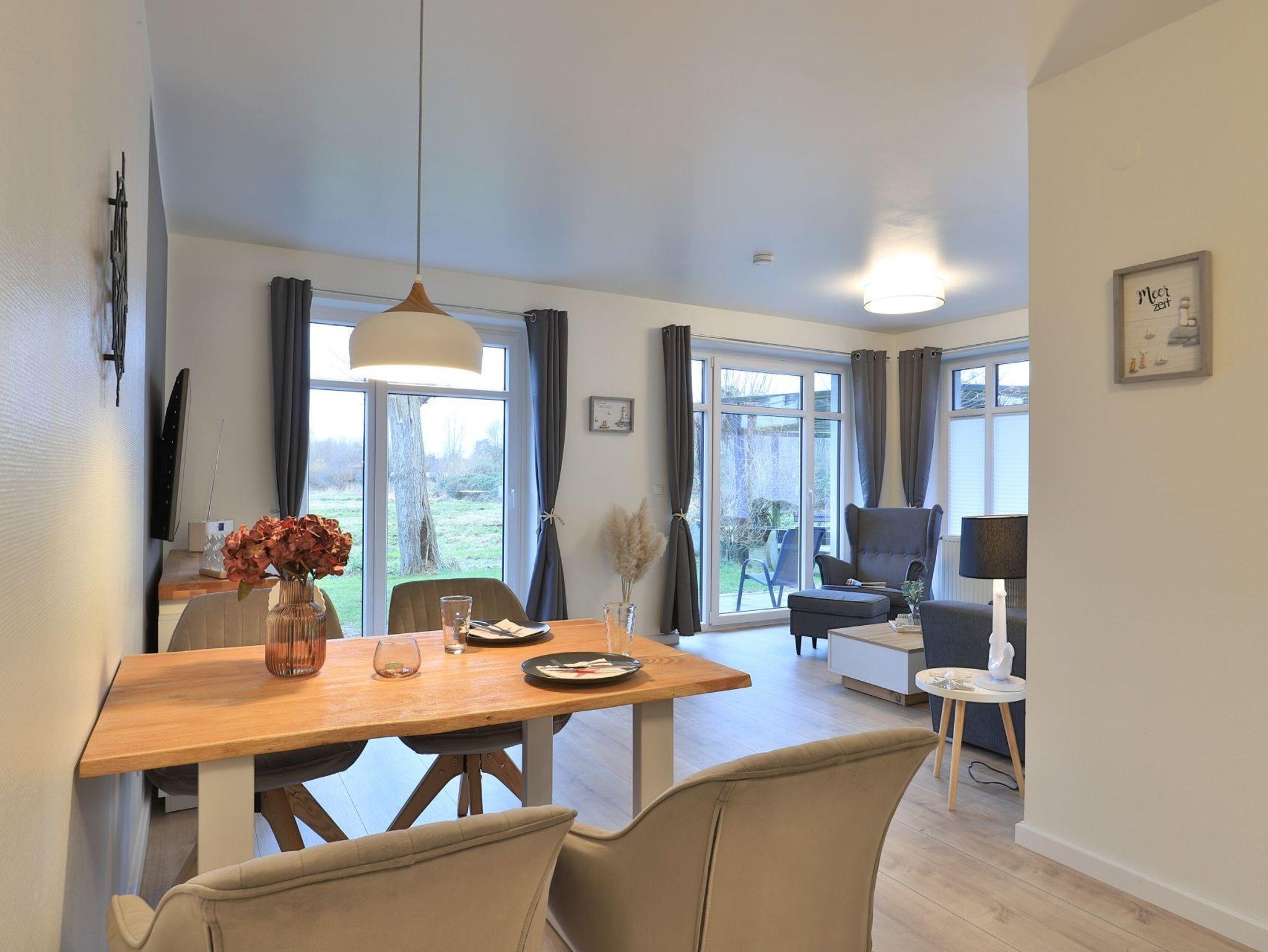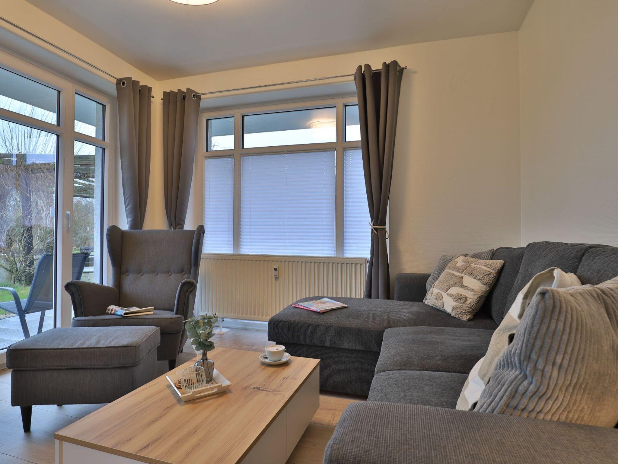 Das modernisierte 2-Zimmer Appartement befindet sich im Erdgeschoss und begeistert mit bester Ausstattung und stilvoller Möblierung. Die Wohnfläche ist mit 50m² ideal für eine Belegung mit bis zu 3 Personen. Im offenen Wohn-/Essbereich ermöglicht ein ausziehbares Komfortsofa eine dritte Schlafgelegenheit. Auch der Relax -Sessel lädt zum Entspannen ein. In der hochwertigen Küchenzeile können die Urlaubsmahlzeiten zubereitet werden: Herd, Backofen, Toaster, Kaffeemaschine, Wasserkocher, Geschirrspüler usw. laden zum Kochen ein. Für Unterhaltung sorgen ein Fernseher (kostenloser Sky-TV-/Primere Empfang) und eine Musikanlage. WLAN steht ohne zusätzliche Gebühr bereit. Dies Wohneinheit bietet eine saisonal möblierte Süd-Terrasse mit Strandkorb und dem zauberhaften Blick auf die Haffwiesen.