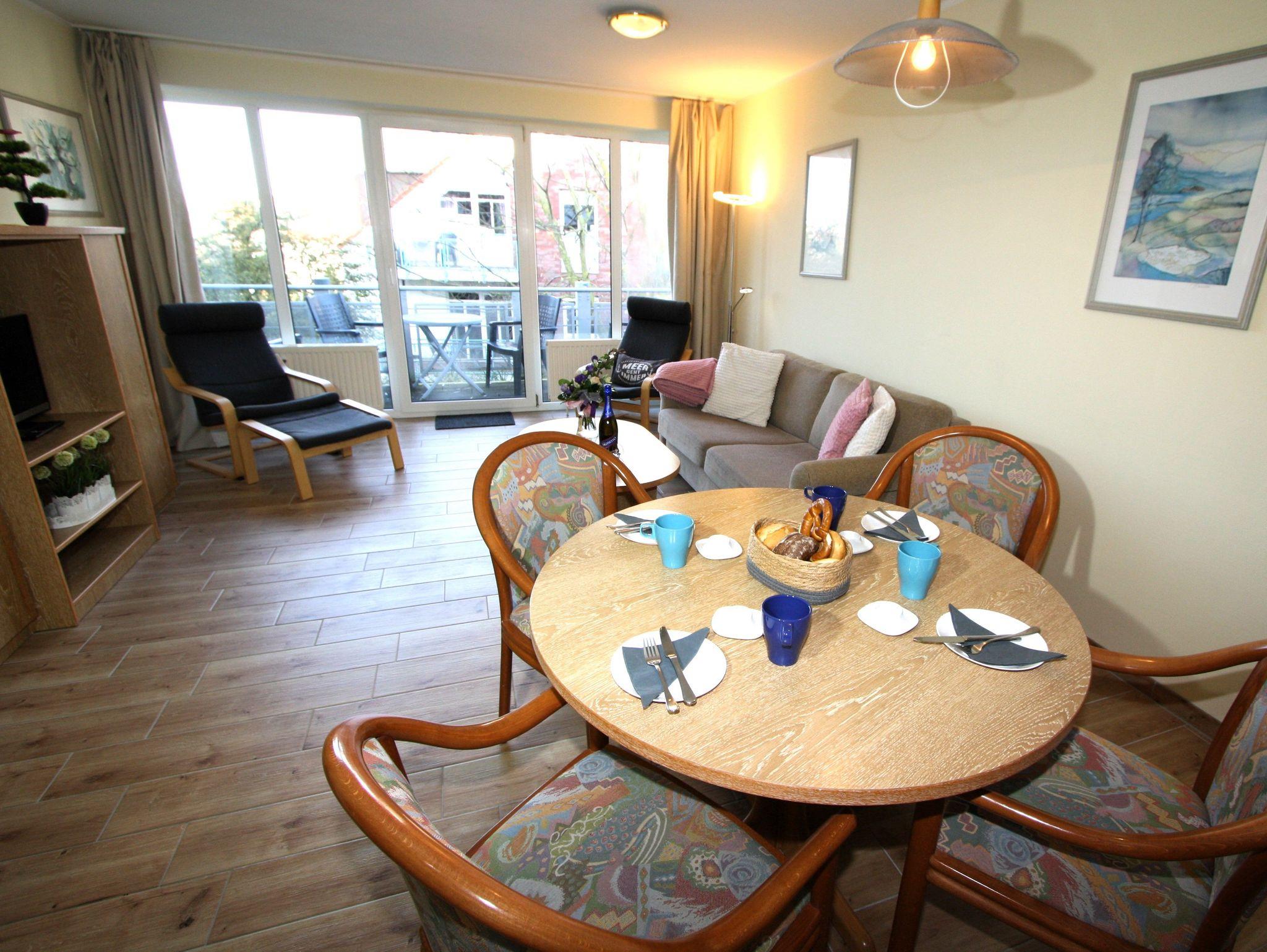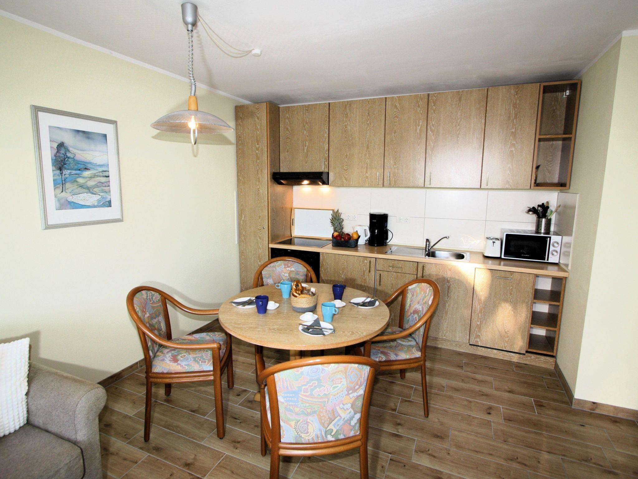 Sie wohnen in einem hellen und gemütlichen 2-Zimmer-Appartement für bis zu 4 Personen auf ca. 46 m². Das Schlafzimmer ist mit einem komfortablen Doppelbett ausgestattet, im Wohn-/Schlafraum lädt eine bequeme Doppelbettcouch zum Entspannen ein. Ein separater Essplatz und ein voll ausgestatteter Küchenbereich bieten alles, was Sie für gemütliche Mahlzeiten benötigen.