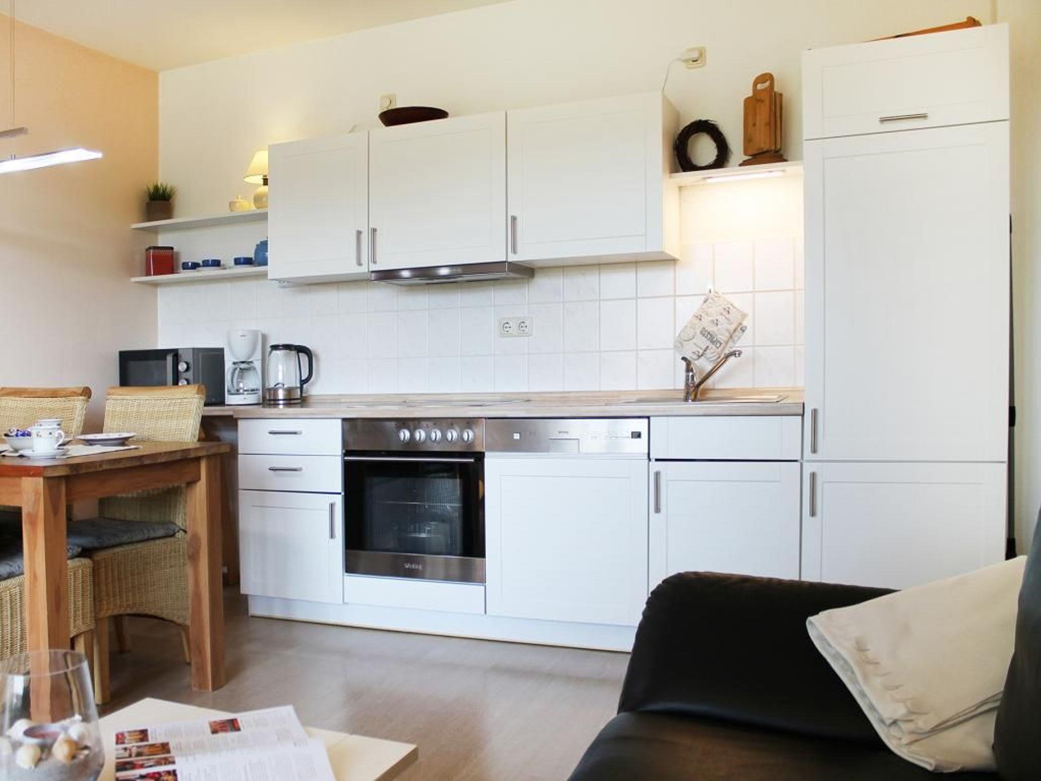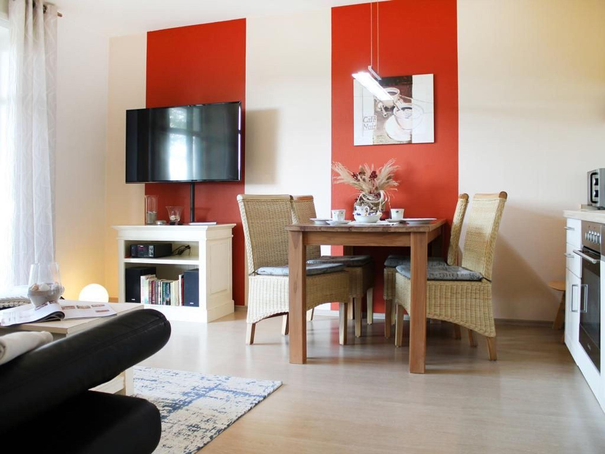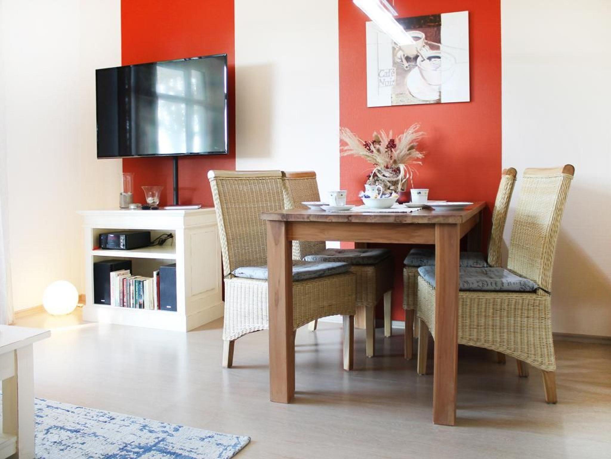 Die sehr attraktive Ferienwohnung Haffblick 54 ist eine Erdgeschoss Wohnung mit Süd-Terrasse und Blick auf die Pferdewiesen. Die Wohnfläche beträgt 48qm und ist für maximal 4 Personen ausgerichtet. Der schicke Wohn-Essbereich verfügt über bodentiefe Fenster. Vom gemütlichen Sofa, welches ausziehbar ist, haben Sie den Blick auf die Haffwiesen. Für gemeinsame Mahlzeiten bietet sich der Esstisch mit vier Stühlen an. Die in den Wohnbereich integrierte Küchenzeile ist hochwertig und voll ausgestattet mit Ceranfeldherd, Backofen, Mikrowelle, Dunstabzug, Geschirrspüler usw. Des Weiteren befinden sich im Wohnraum ein Flachbild Fernseher, DVD, Sky sowie eine Musikanlage. WLAN nutzen Sie kostenfrei. Ein separates Schlafzimmer mit Doppelbett und Kleiderschrank lässt Sie geruhsam schlafen. Für kleine Kinder sind in der Wohnung Hochstuhl und Kinderreisebett vorhanden. Zugehörig ist ein Duschbad. Im 1. Obergeschoss können Sie gegen Gebühr Waschmaschine und Wäschetrockner nutzen. Ihren PKW parken Sie kostenfrei am Haus. Zwei Fahrräder mit tiefem Einstieg stehen für Sie bereit. Bitte beachten Sie, dass es sich um eine Nichtraucher Wohnung handelt, in der Haustiere nicht gestattet sind. Auf Wunsch sind Wäschepakete mit Bettwäsche und Handtüchern zu buchbar. Herrliche Rad-Wanderwege beginnen nah des Hauses. In wenigen Gehminuten erreichen Sie den Strand, wie auch Seebrücke und das Ortszentrum von Boltenhagen.