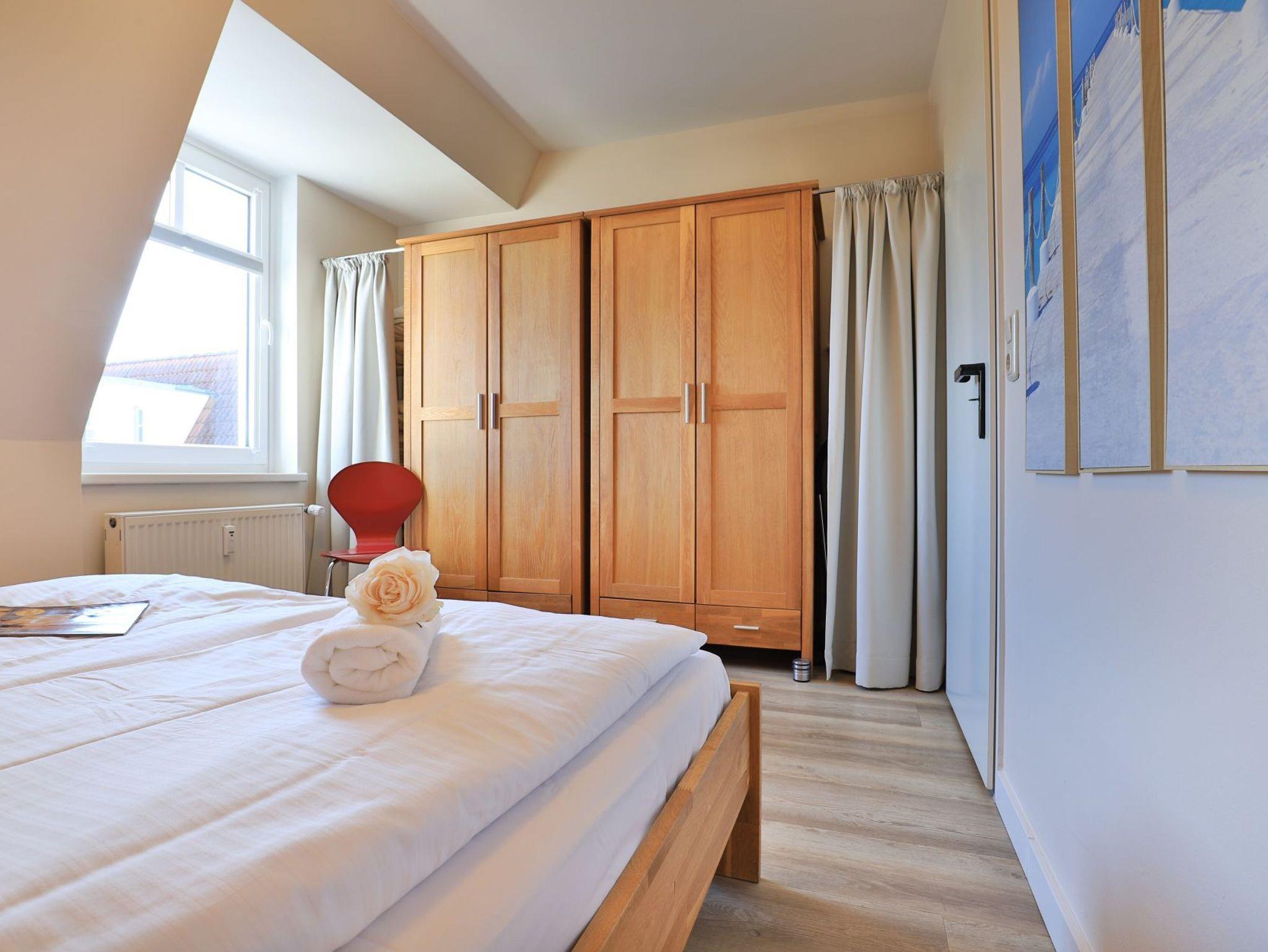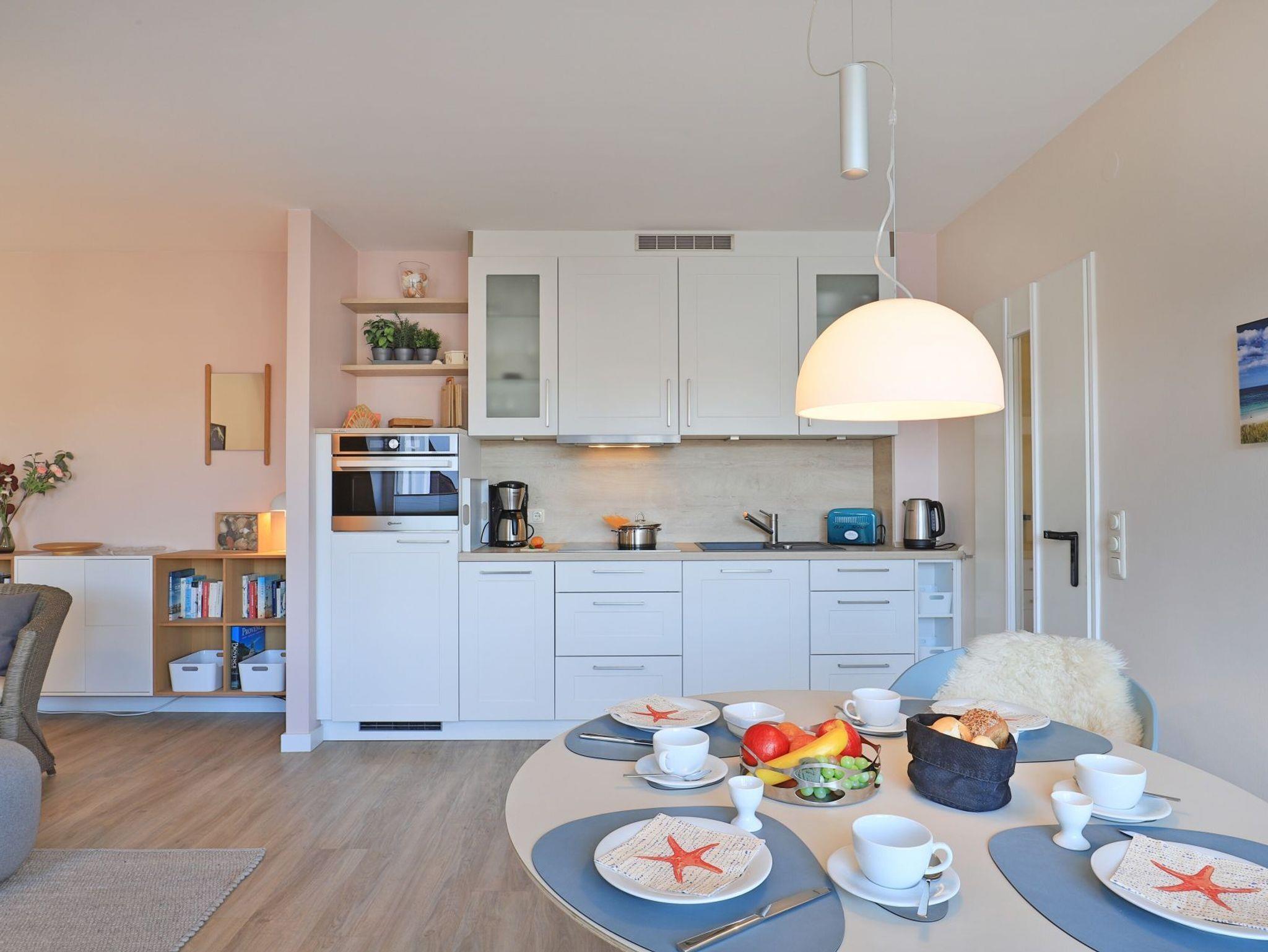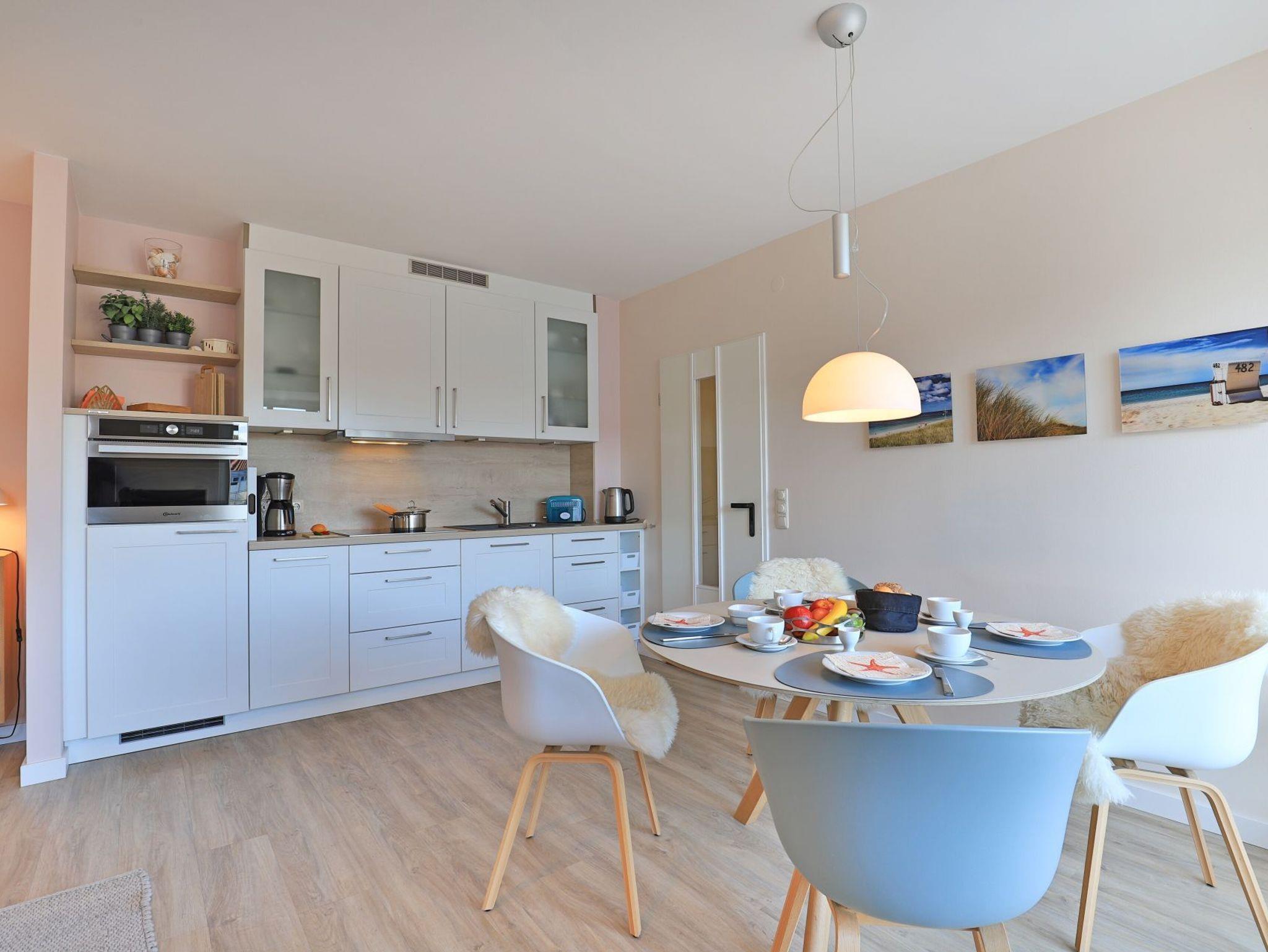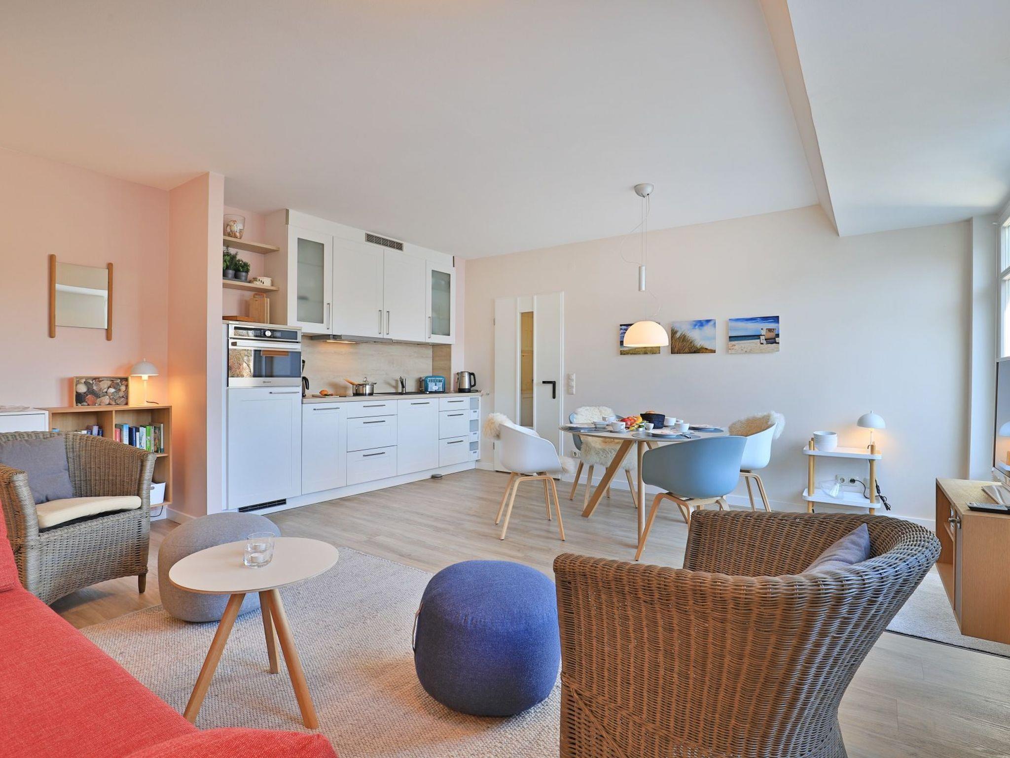 Das modern ausgestattete 2-Zimmer-Appartement befindet sich im 2. Obergeschoss und ist bequem mit dem Fahrstuhl erreichbar. Auf einer geräumigen Wohnfläche von 46qm finden bis zu 4 Personen ausreichend Platz. Der einladende Wohn- und Essbereich ist lichtdurchflutet und bietet einen Flachbild-TV, Radio, WLAN sowie einen Esstisch und eine gemütliche Couch, die bei Bedarf ausgeklappt werden kann, um zwei zusätzliche Schlafplätze zu ermöglichen. Vom Wohnraum aus haben Sie Zugang zum saisonal möblierten Balkon mit Blick auf den Innenhof. Die Einbauküche ist geschickt in den Wohn-/Essbereich integriert und verfügt über alle notwendigen Geräte, darunter Ceranherd, Backofen in Komforthöhe, Dunstabzug, Toaster, Kaffeemaschine, Wasserkocher und Geschirrspüler. Das Schlafzimmer ist mit einem komfortablen Doppelbett und einem Kleiderschrank ausgestattet. Zudem umfasst das Ferienappartement ein modernes Duschbad, das einen Waschtisch, Fön, WC beinhaltet. Eine Waschmaschine, Bügeleisen, Bügelbrett stehen zur Verfügung. Ein fest zugeordneter Stellplatz in der Tiefgarage rundet das Angebot ab und sorgt für zusätzlichen Komfort und Sicherheit. Insgesamt bietet diese Nichtraucher Ferienwohnung eine ideale Kombination aus modernem Wohnkomfort und praktischer Ausstattung. Keine Haustiere. Hervorzuheben ist die nahe Lage zum Strand.