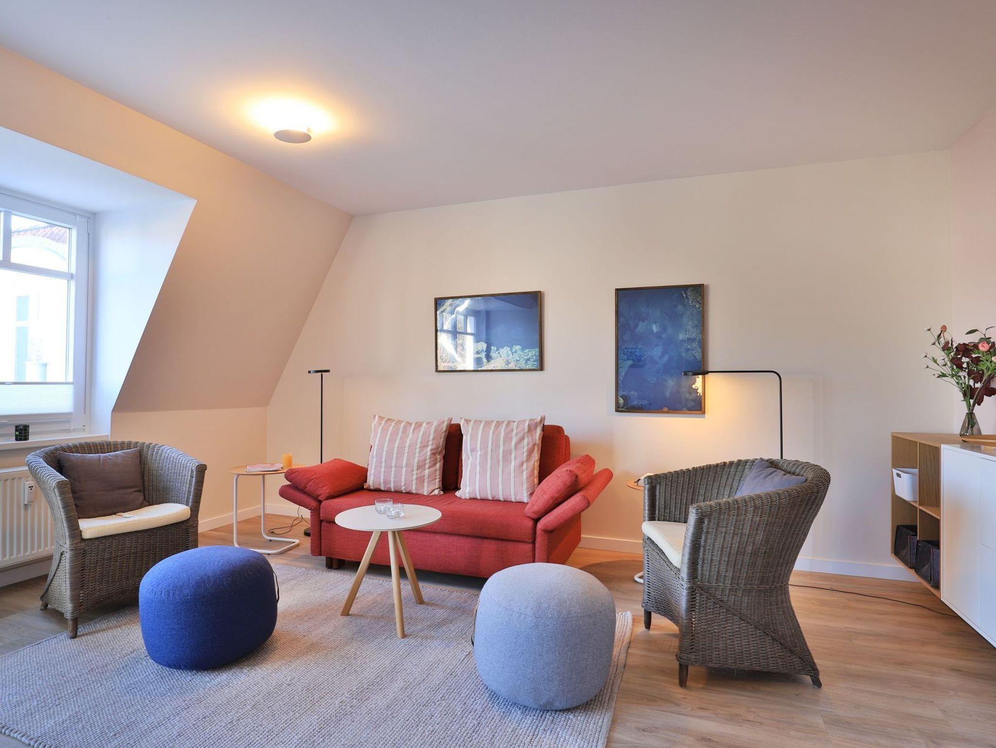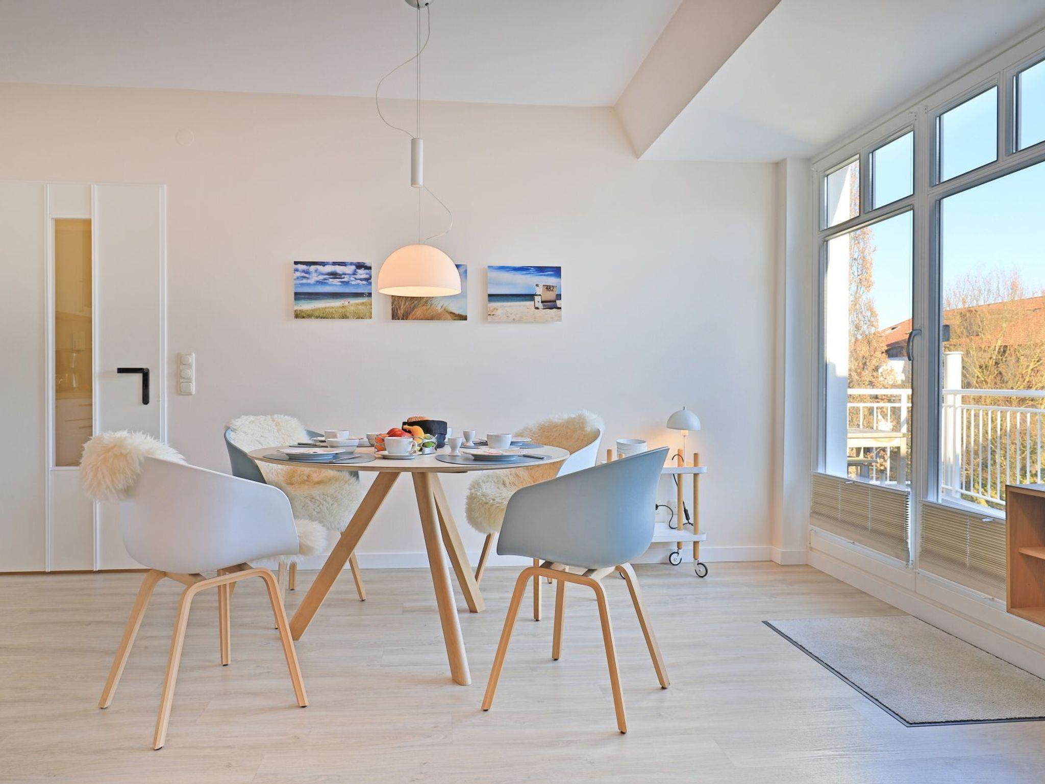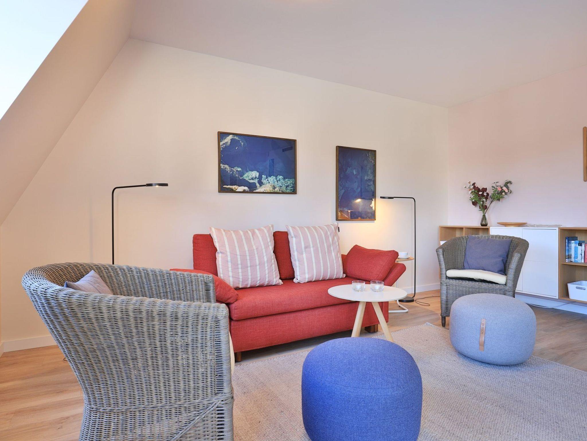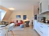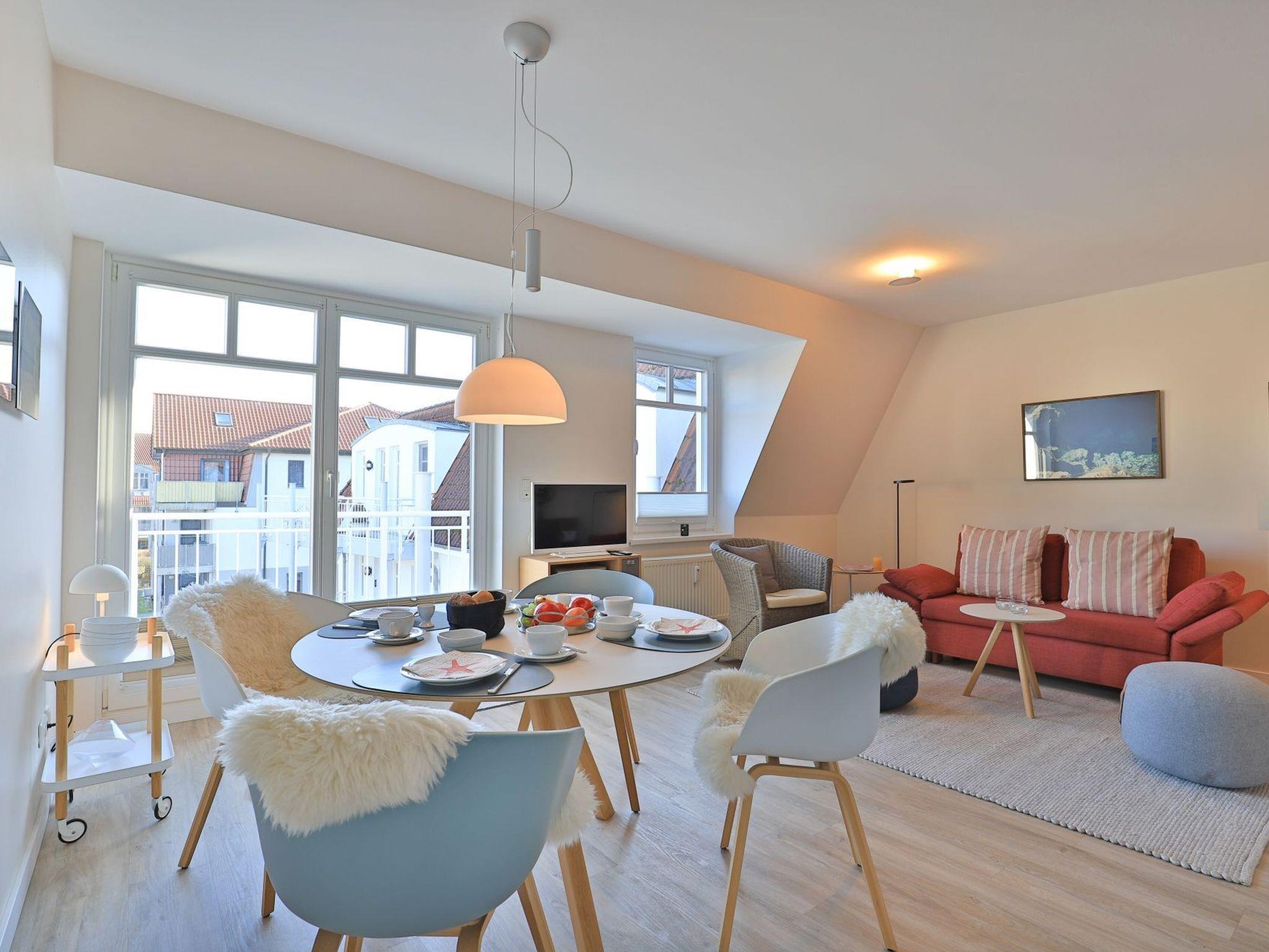 Das modern ausgestattete 2-Zimmer-Appartement befindet sich im 2. Obergeschoss und ist bequem mit dem Fahrstuhl erreichbar. Auf einer geräumigen Wohnfläche von 46qm finden bis zu 4 Personen ausreichend Platz. Der einladende Wohn- und Essbereich ist lichtdurchflutet und bietet einen Flachbild-TV, Radio, WLAN sowie einen Esstisch und eine gemütliche Couch, die bei Bedarf ausgeklappt werden kann, um zwei zusätzliche Schlafplätze zu ermöglichen. Vom Wohnraum aus haben Sie Zugang zum saisonal möblierten Balkon mit Blick auf den Innenhof. Die Einbauküche ist geschickt in den Wohn-/Essbereich integriert und verfügt über alle notwendigen Geräte, darunter Ceranherd, Backofen in Komforthöhe, Dunstabzug, Toaster, Kaffeemaschine, Wasserkocher und Geschirrspüler. Das Schlafzimmer ist mit einem komfortablen Doppelbett und einem Kleiderschrank ausgestattet. Zudem umfasst das Ferienappartement ein modernes Duschbad, das einen Waschtisch, Fön, WC beinhaltet. Eine Waschmaschine, Bügeleisen, Bügelbrett stehen zur Verfügung. Ein fest zugeordneter Stellplatz in der Tiefgarage rundet das Angebot ab und sorgt für zusätzlichen Komfort und Sicherheit. Insgesamt bietet diese Nichtraucher Ferienwohnung eine ideale Kombination aus modernem Wohnkomfort und praktischer Ausstattung. Keine Haustiere. Hervorzuheben ist die nahe Lage zum Strand.