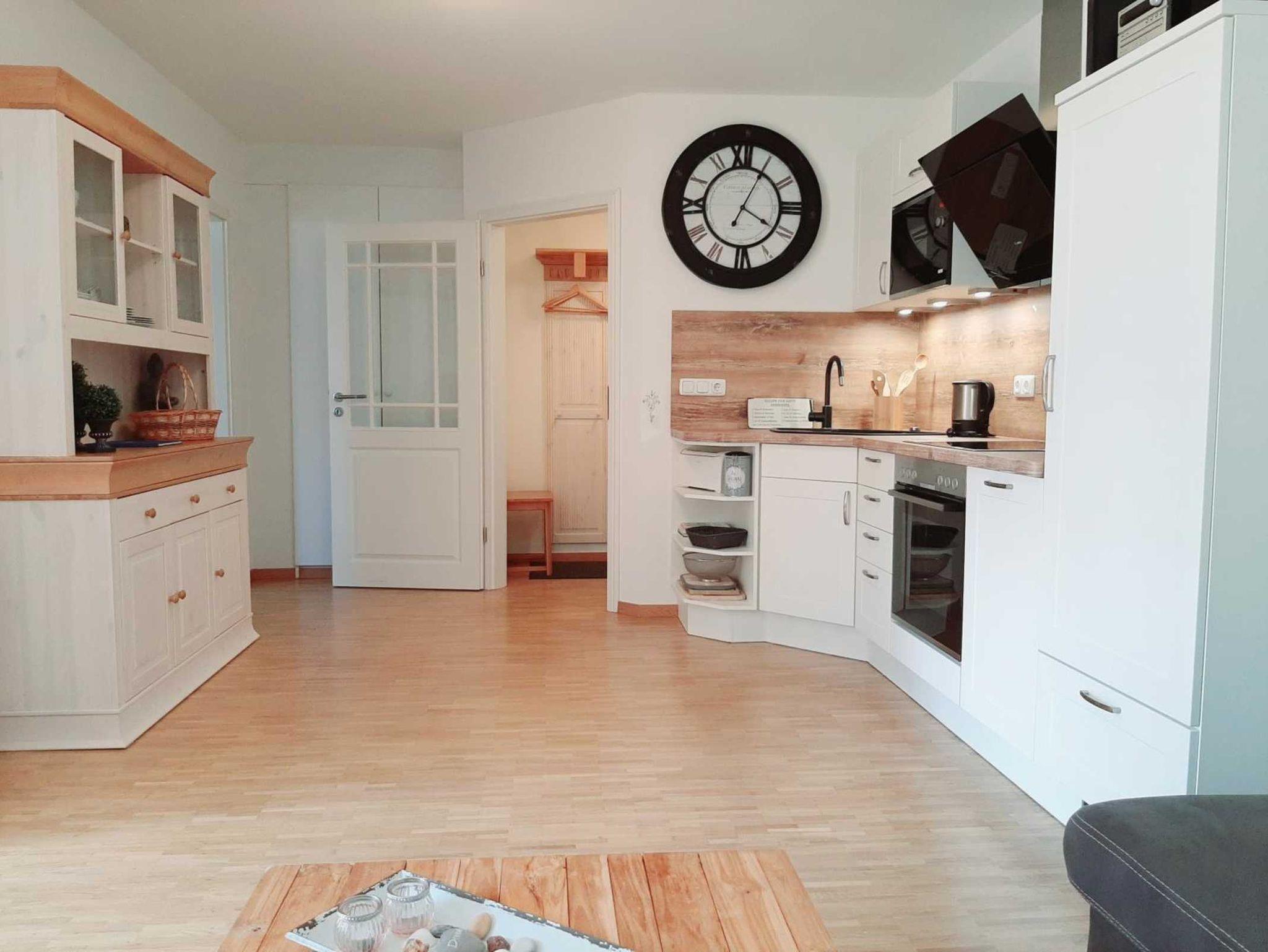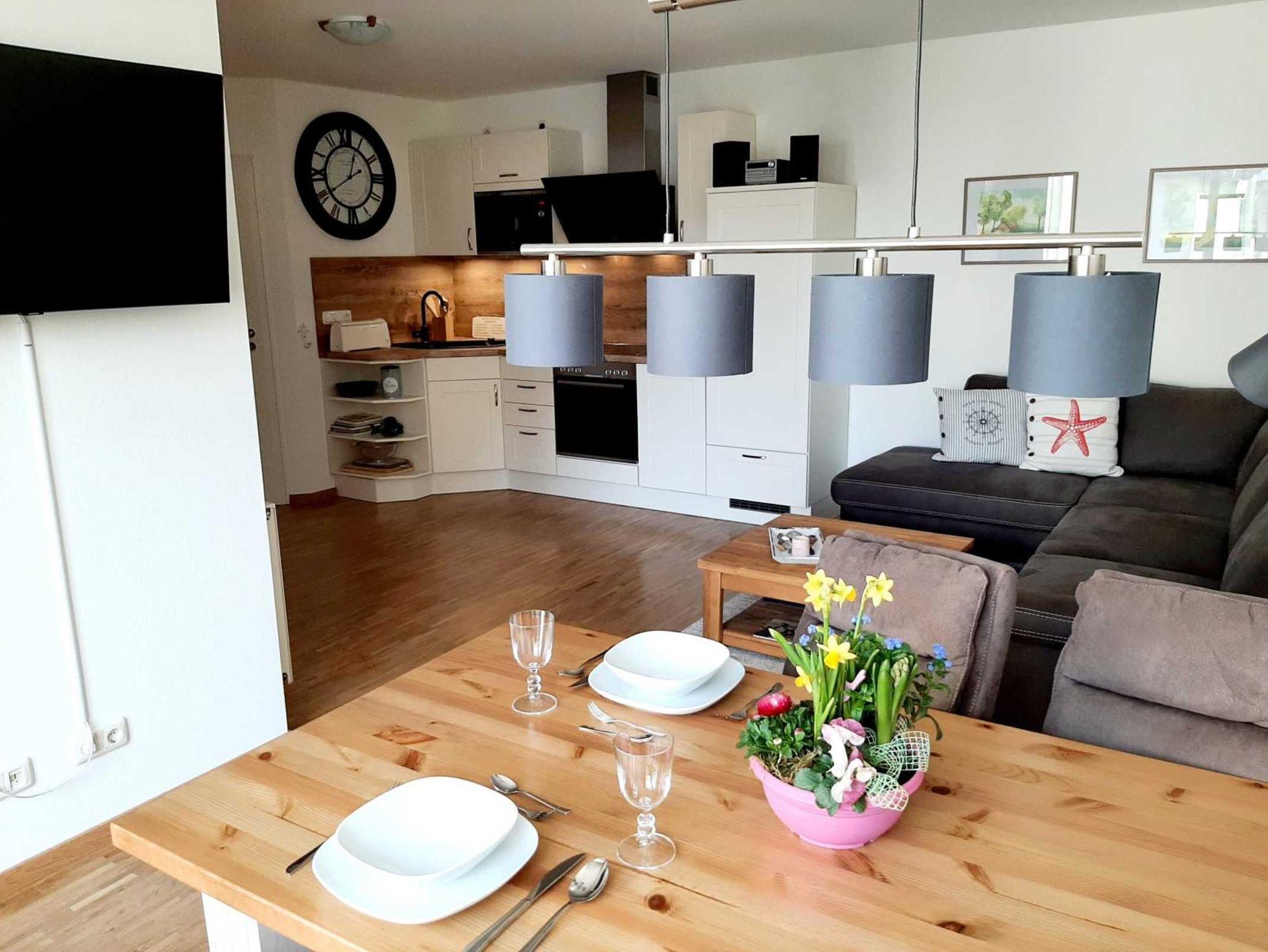 Die hell-maritim eingerichtete 48 m² große Nichtraucher-Wohnung befindet sich im 1. OG und verfügt über kostenfreies WLAN und kostenloses sky-Fernsehen.