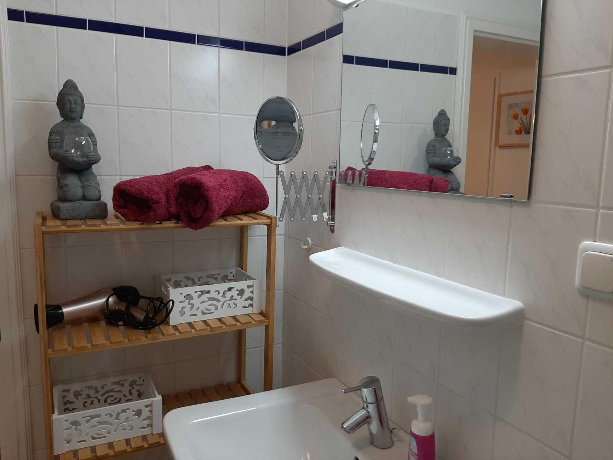 Im geräumigen Duschbad haben Sie ausreichend Ablagefläche, einen Hocker, Föhn und Kosmetikspiegel und im Einbauschrank im Flur finden Sie einen Wäscheständer sowie ein Bügelbrett.