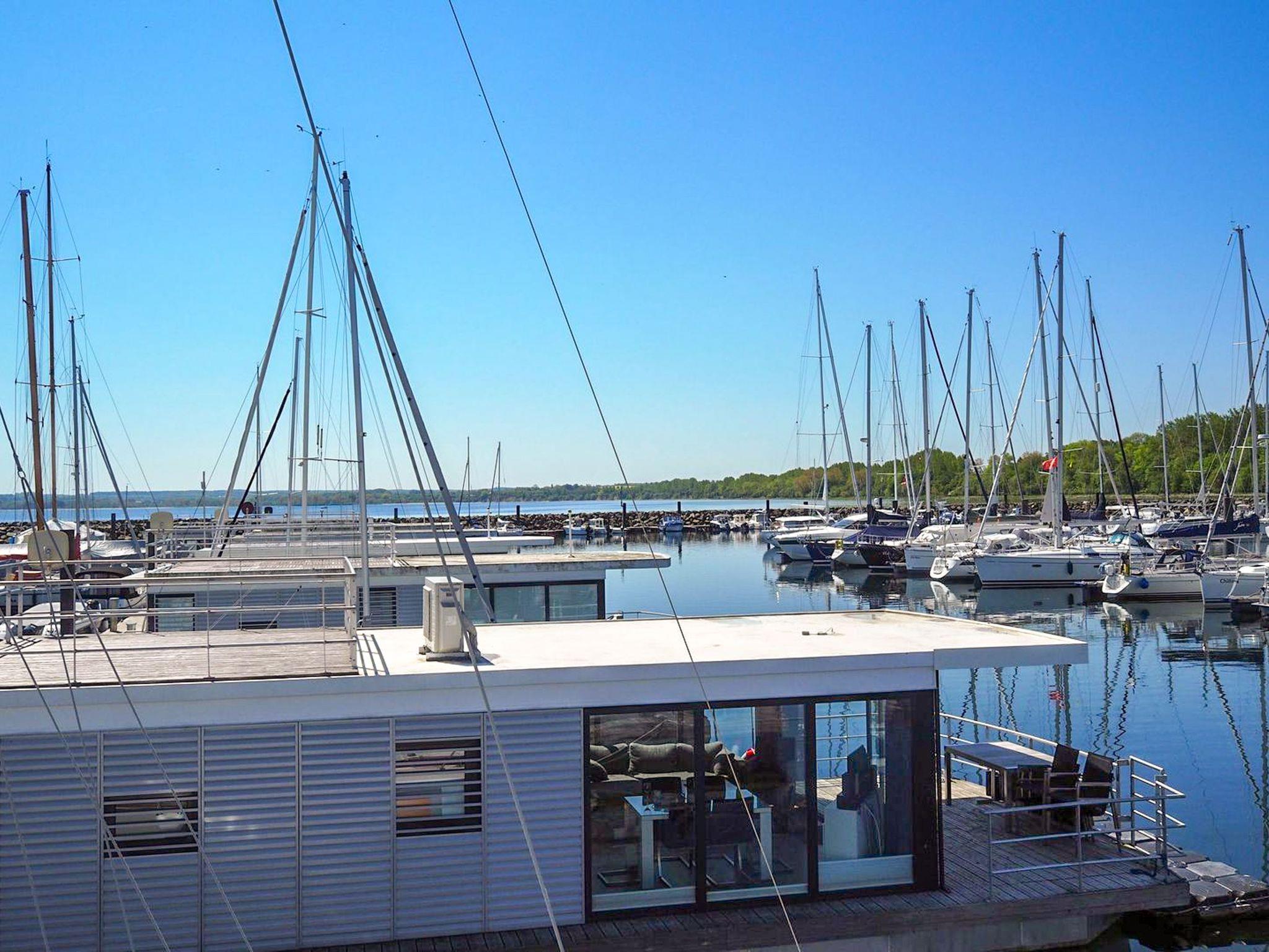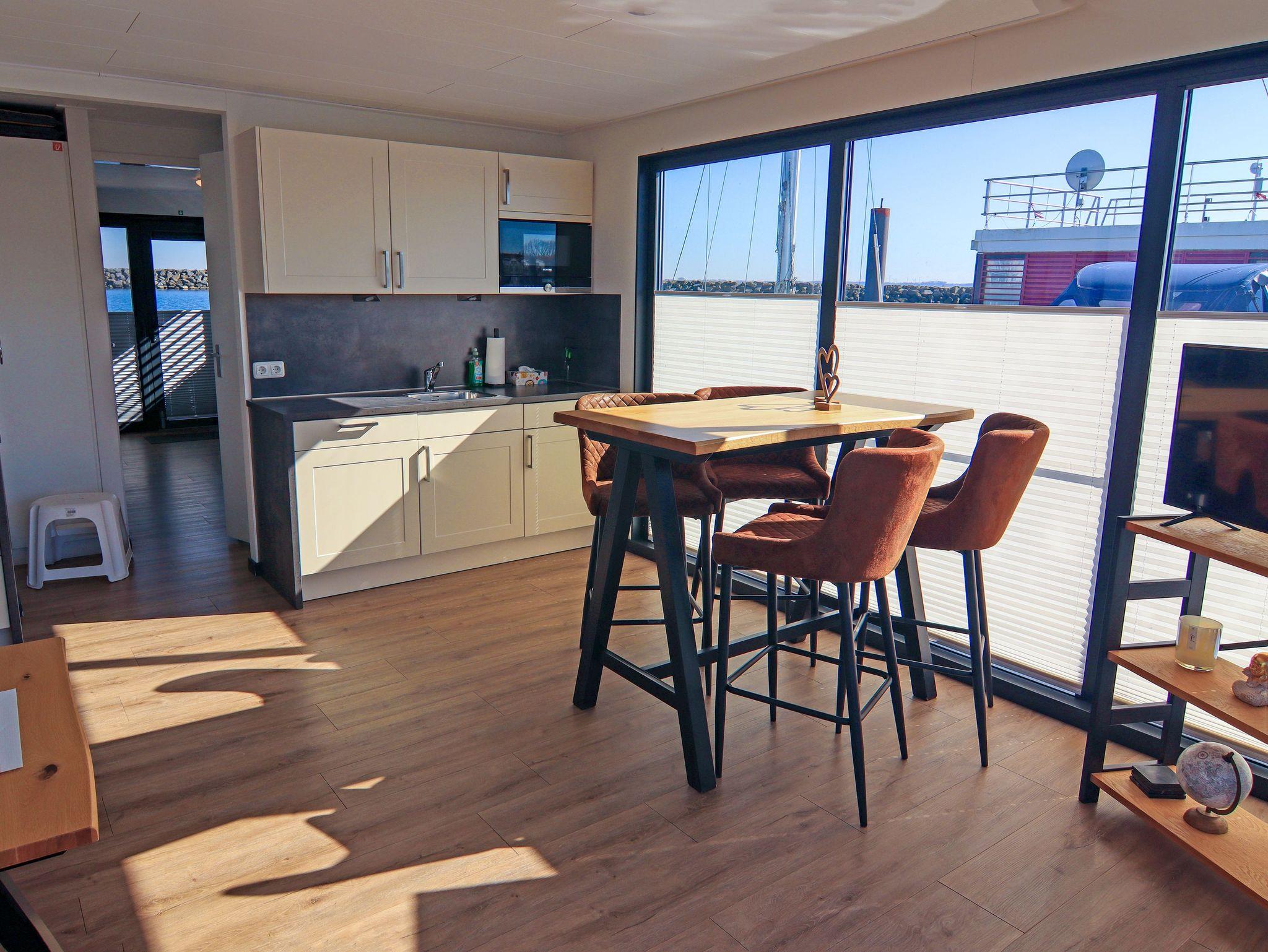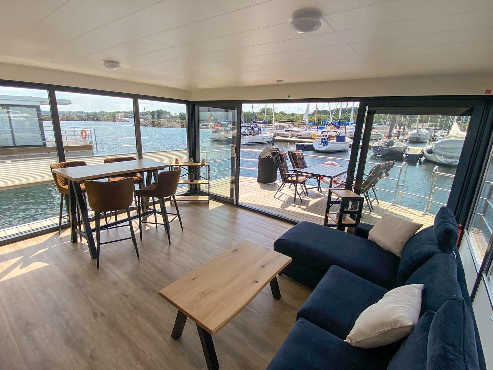 Erleben Sie maritimen Komfort auf dem Hausboot im Yachthafen Boltenhagen mit Terrasse und Dachterrasse.