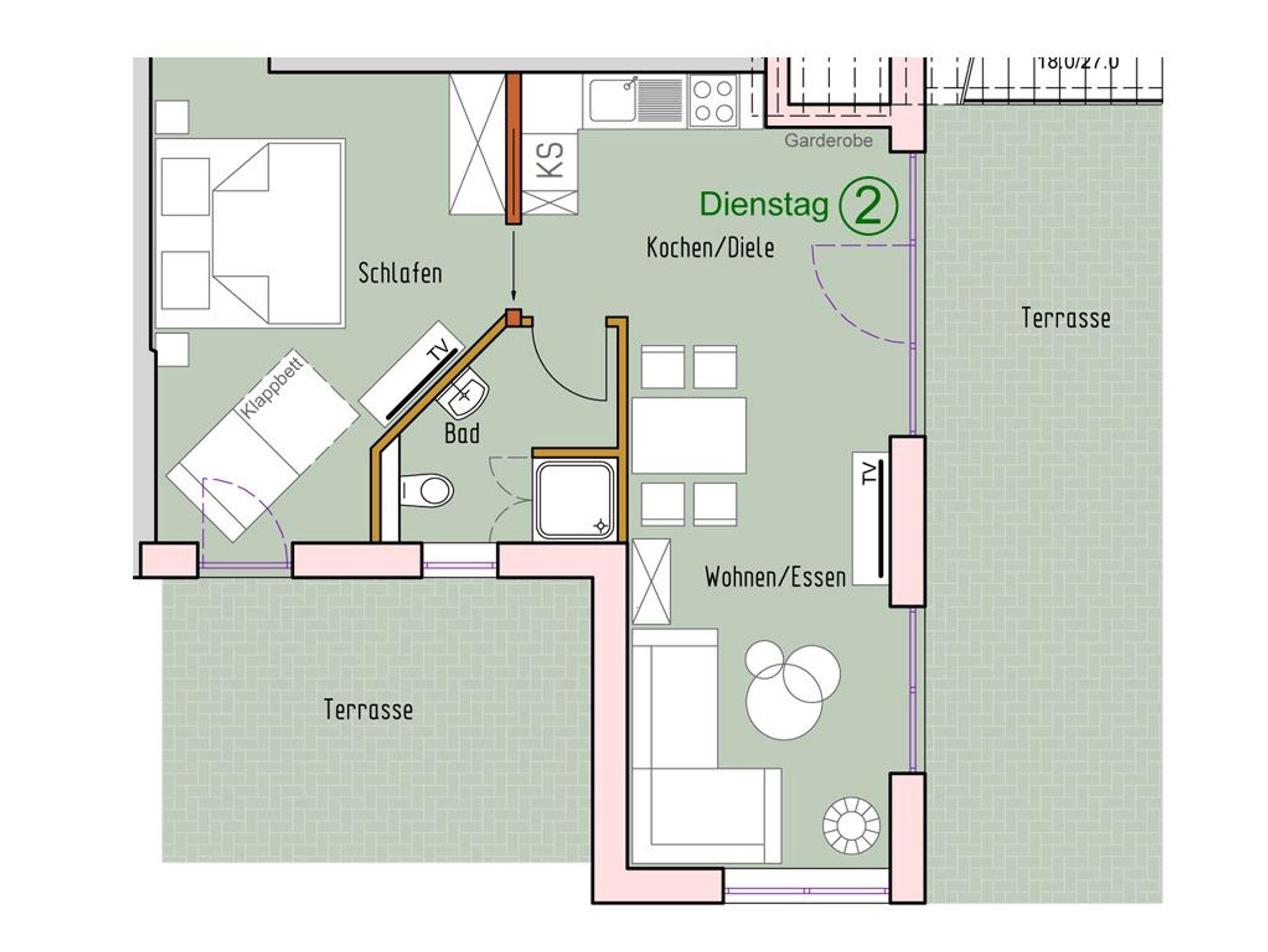 Hervorzuheben ist die, auch für Rollstuhlfahrende nutzbare, Wohnraumküche mit: Herd, Backofen, Dunstabzug, Mikrowelle, Kühlschrank mit integr. Gefrierfach, Geschirrspüler, Kaffeemaschine, Wasserkocher, usw. Während der wärmeren Jahreszeit nutzen Sie die Vorzüge der wohnungseigenen, saisonal möblierten Terrassen in Süd und West- Ausrichtung, eine der Terrassen mit Strandkorb. Ein separates Wohlfühlschlafzimmer mit Doppelbett, Kleiderschrank, Fernseher lädt zu entspannten Nächten ein. Für eine evtl. mitreisende 3. Person befindet sich eine weitere Schlafmöglichkeit im Schlafzimmer. Bei Anreise sind bezogene Betten für 2 Personen inklusive.