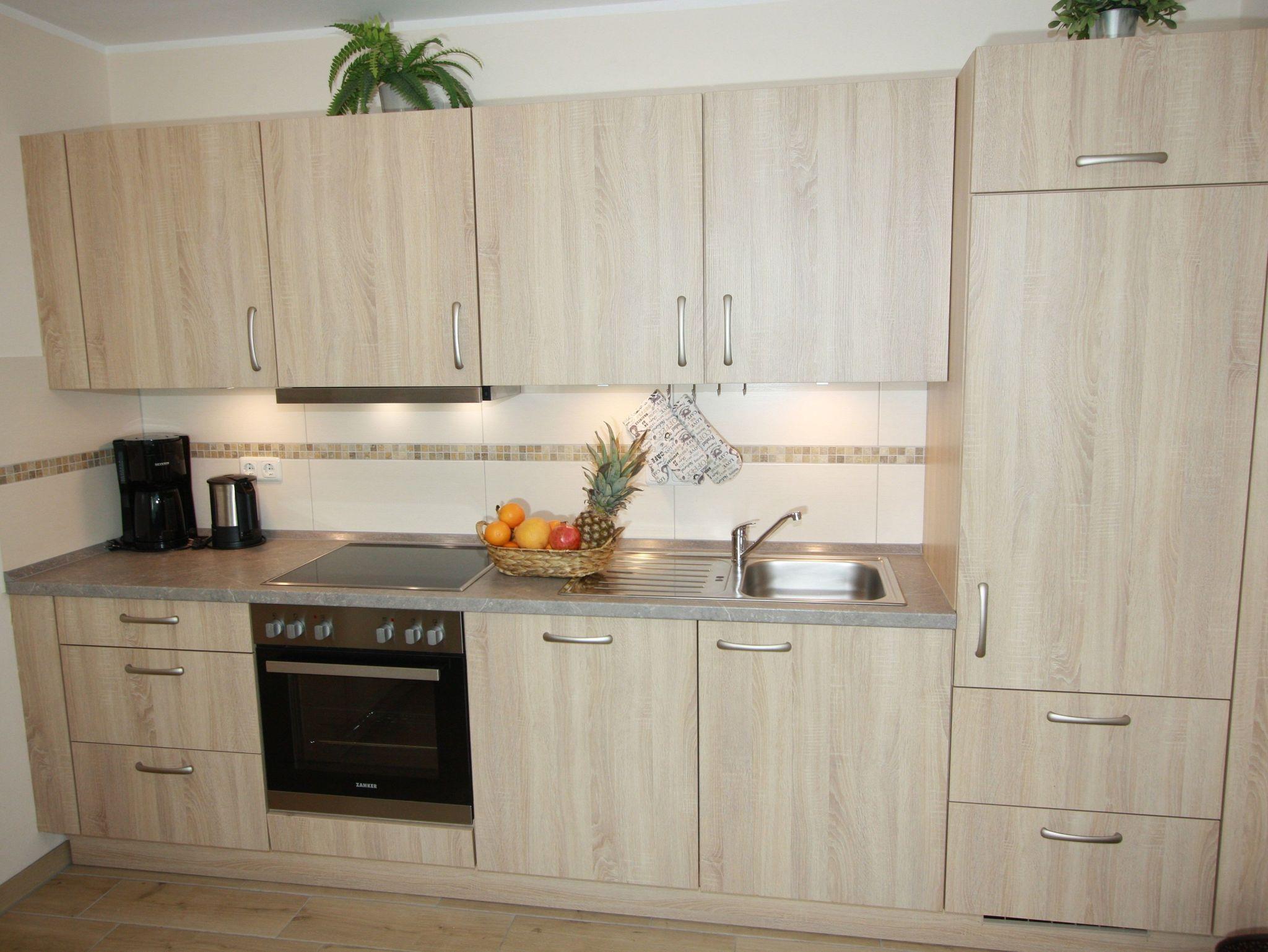 Angrenzend an den Wohnbereich befindet sich der separate Essplatz und eine voll ausgestattete Küchenzeile mit Geschirrspüler und Mikrowelle.