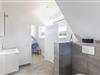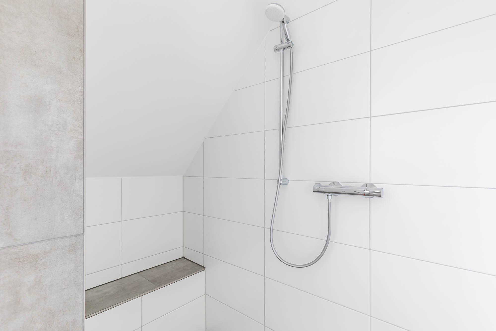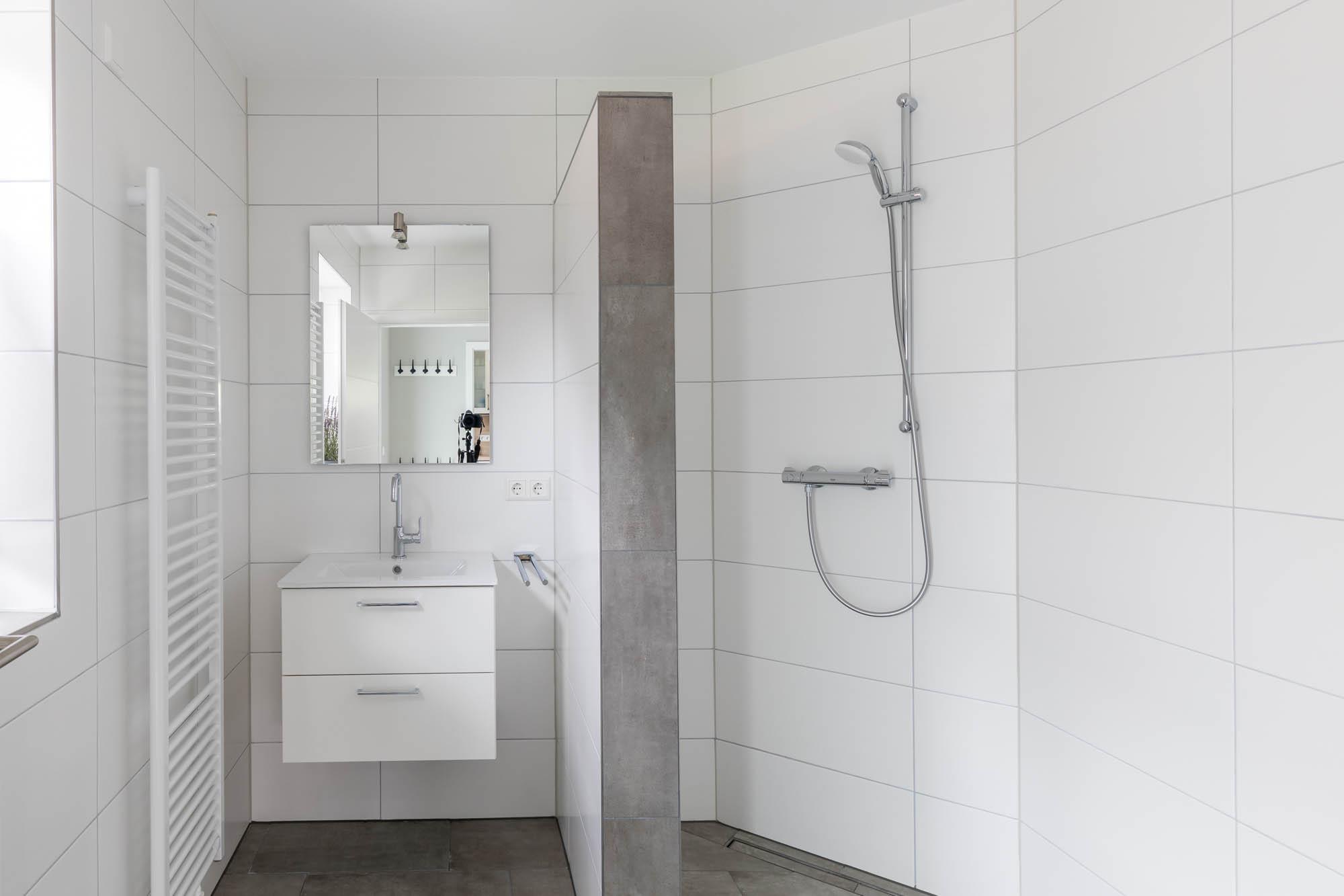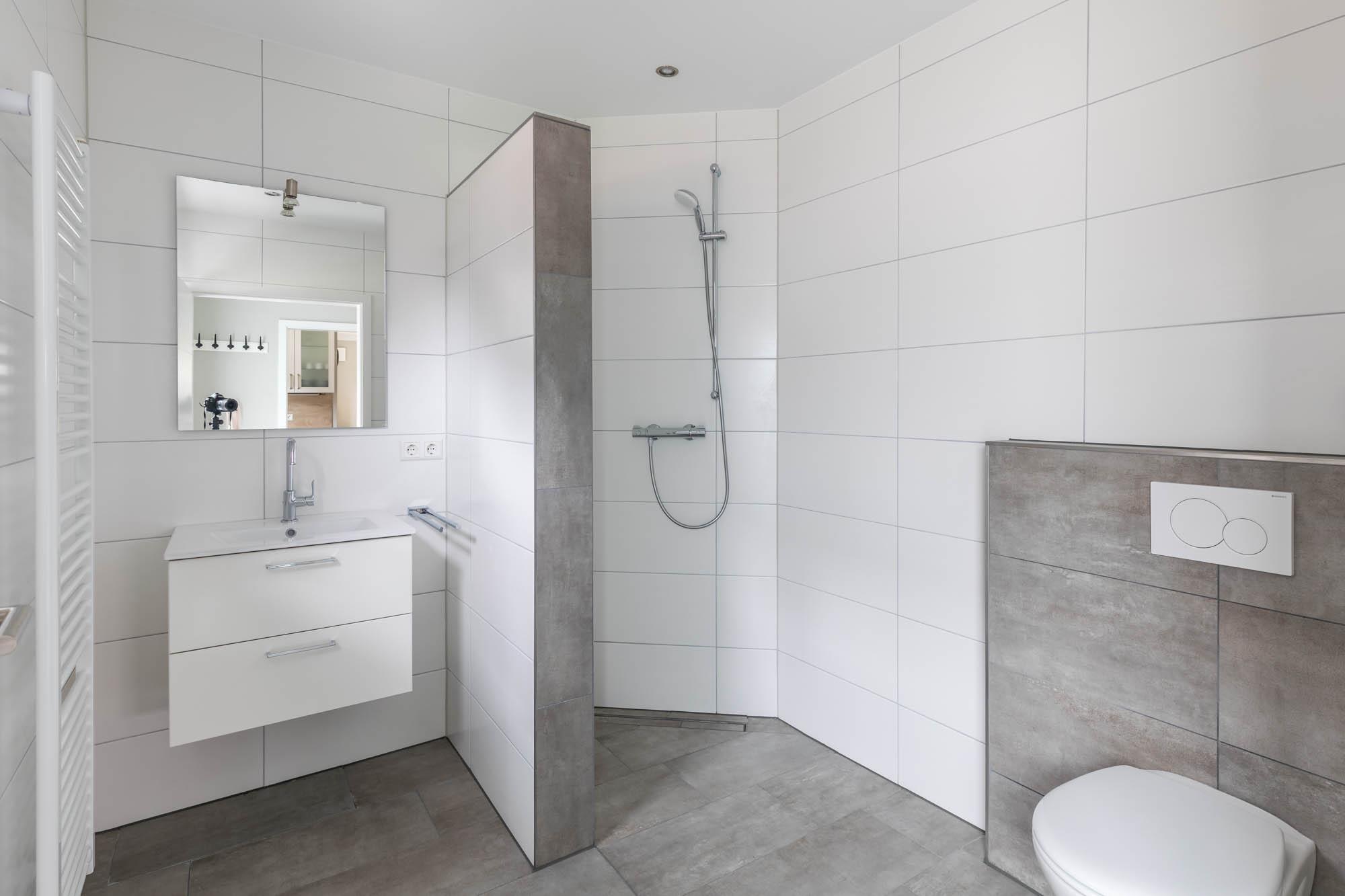Weiterhin befindet sich auf dieser Ebene ein modernes Bad mit bodengleicher Dusche und WC. Das Fenster sorgt außerdem für ausreichend Tageslicht und hilft beim Lüften nach dem Duschen.