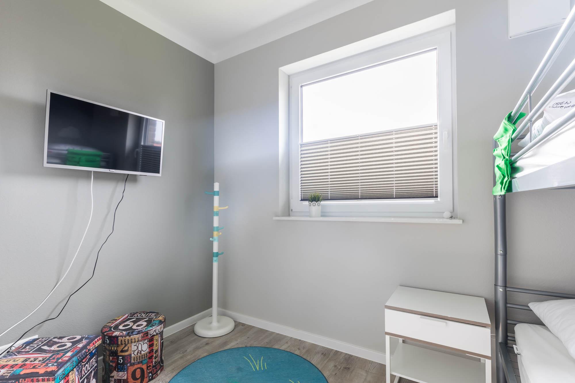 Vom Flur aus führt eine Treppe ins 1. Obergeschoss. Hier gelangen Sie zu den zwei weiteren Schlafzimmern, wovon eines mit einem Etagenbett (je 90x200cm), Kommode und eigenem SAT-TV und das andere mit einem Doppelbett (180x200cm) mit Kleiderschrank ausgestattet ist.