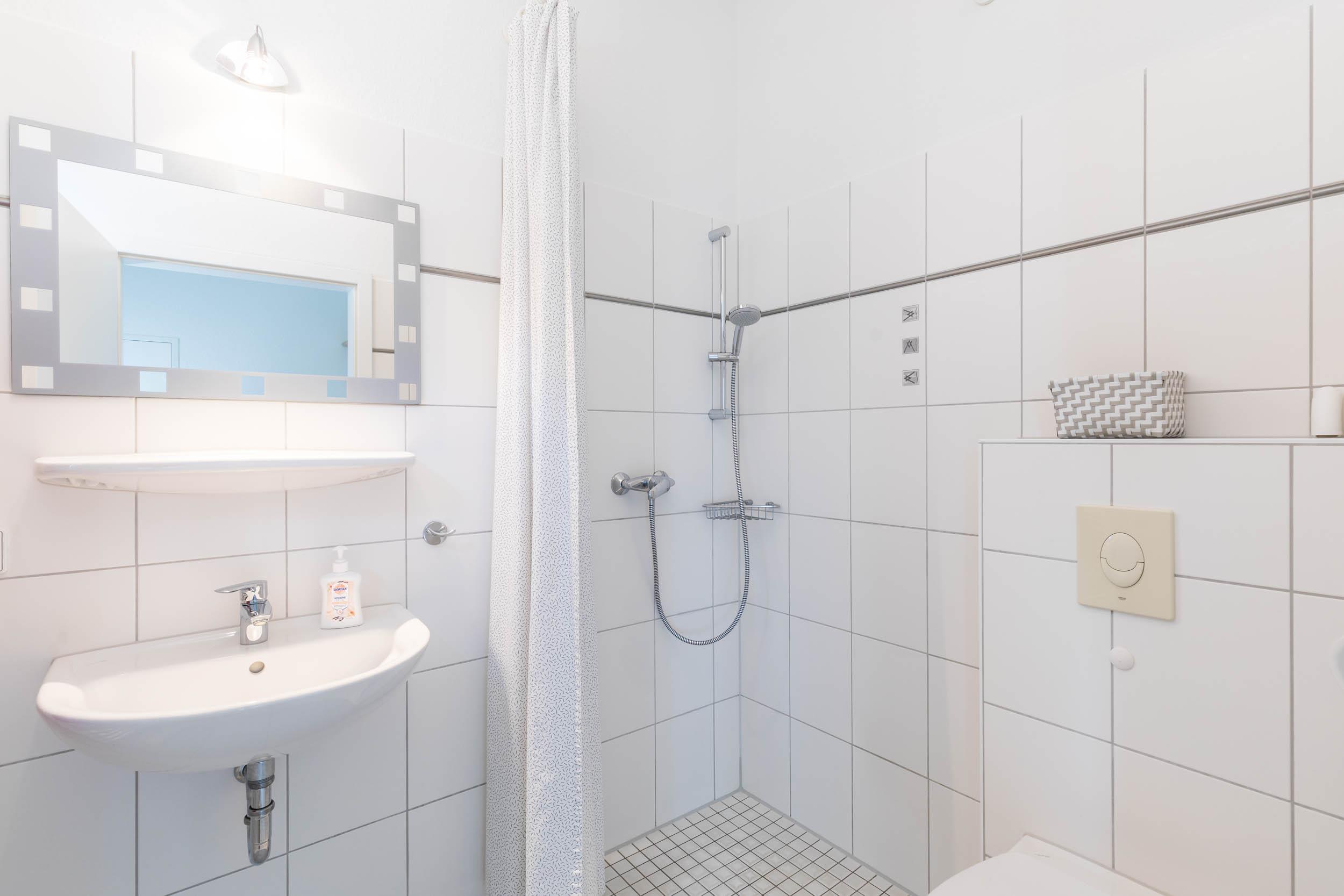 Das hell geflieste Bad mit Fenster bietet eine barrierefreie Dusche (mit Vorhang) und WC.