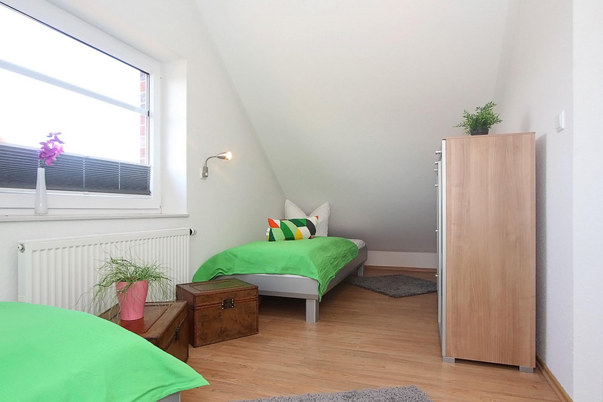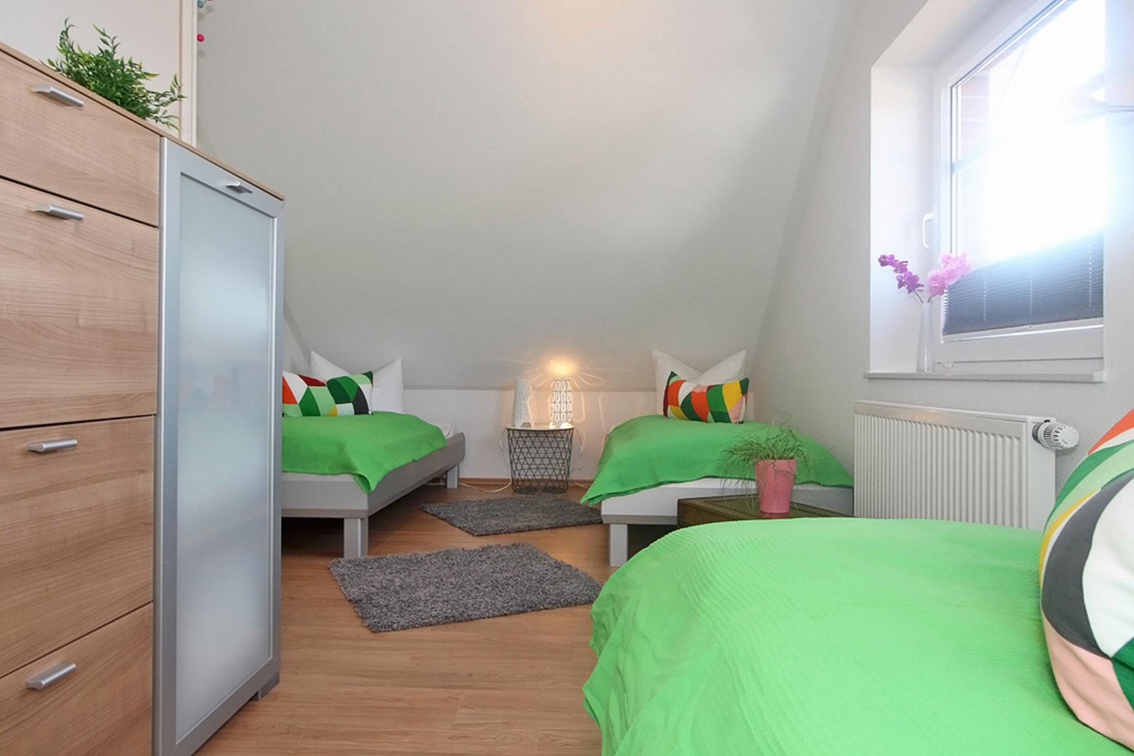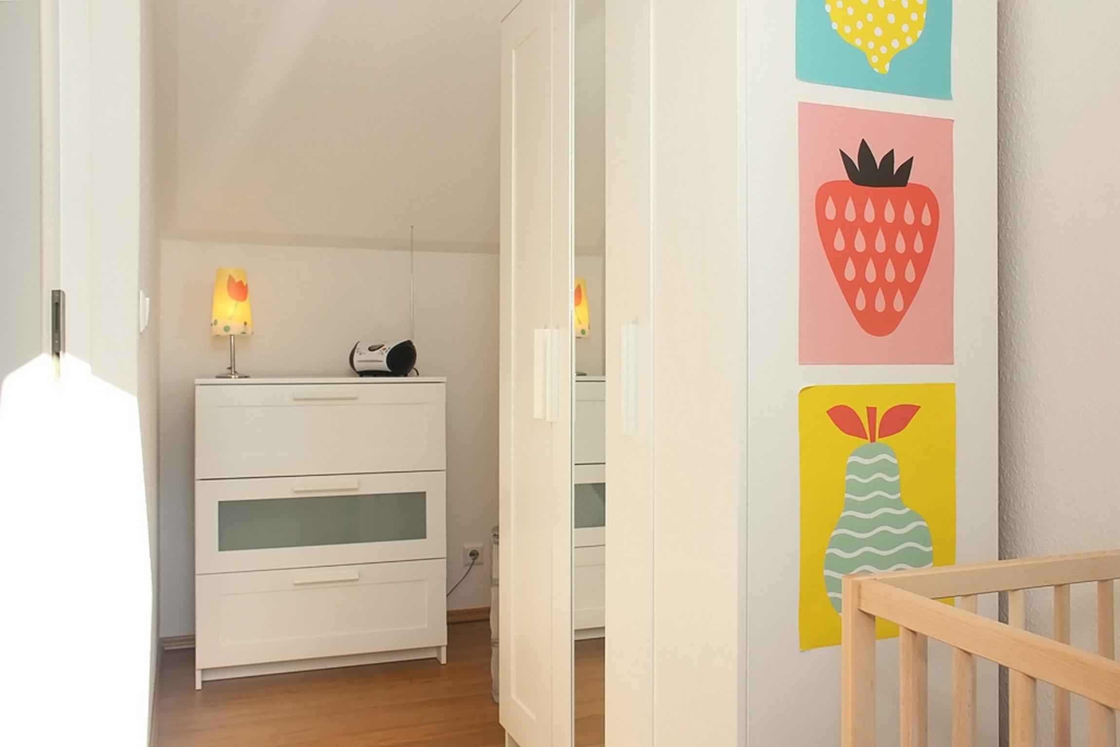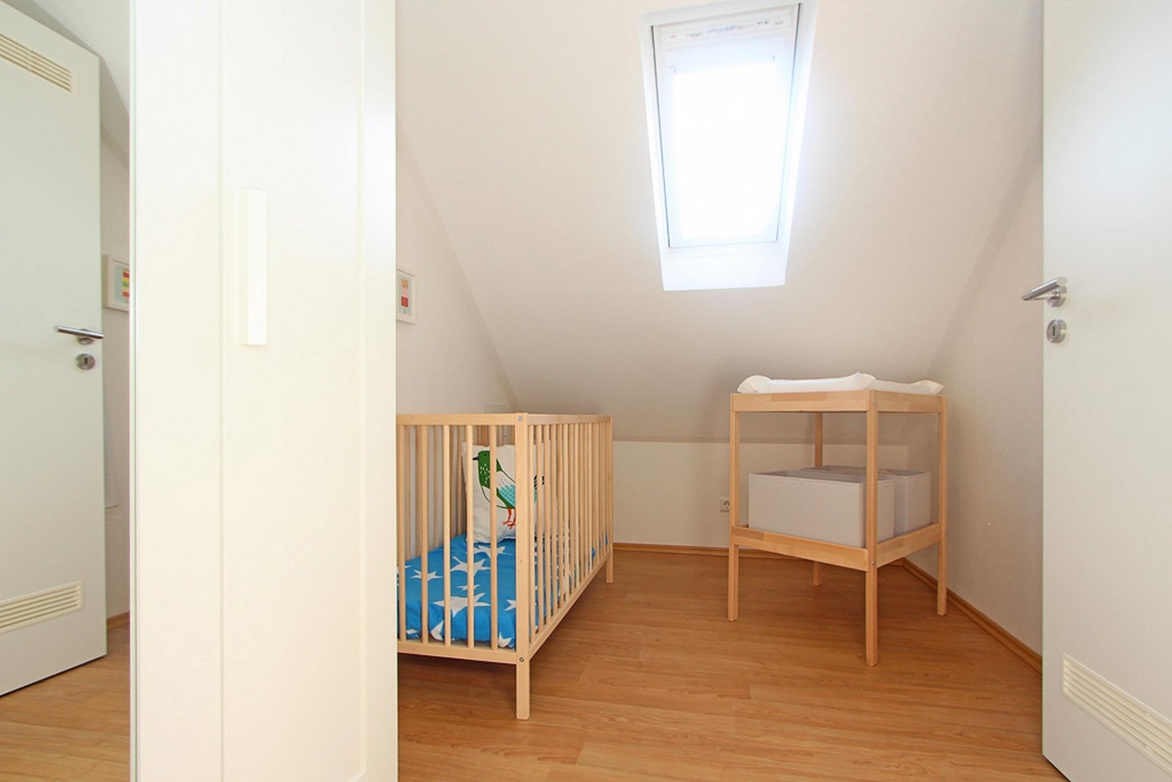 Das Gäste-/ Kinderzimmer bietet 3 Einzelbetten (je 90x200cm) und eine Kommode für Ihre Kleidung. Von diesem Zimmer aus erreichen Sie ein weiteres, kleines separates Zimmer für unsere kleinsten Gäste. Hier steht ein festes Holz-Gitterbettchen mit Matratze und Wickeltisch sowie ein kleiner Kleiderschrank und Kommode. Das Zimmer ist mit einem Treppenschutzgitter versehen.