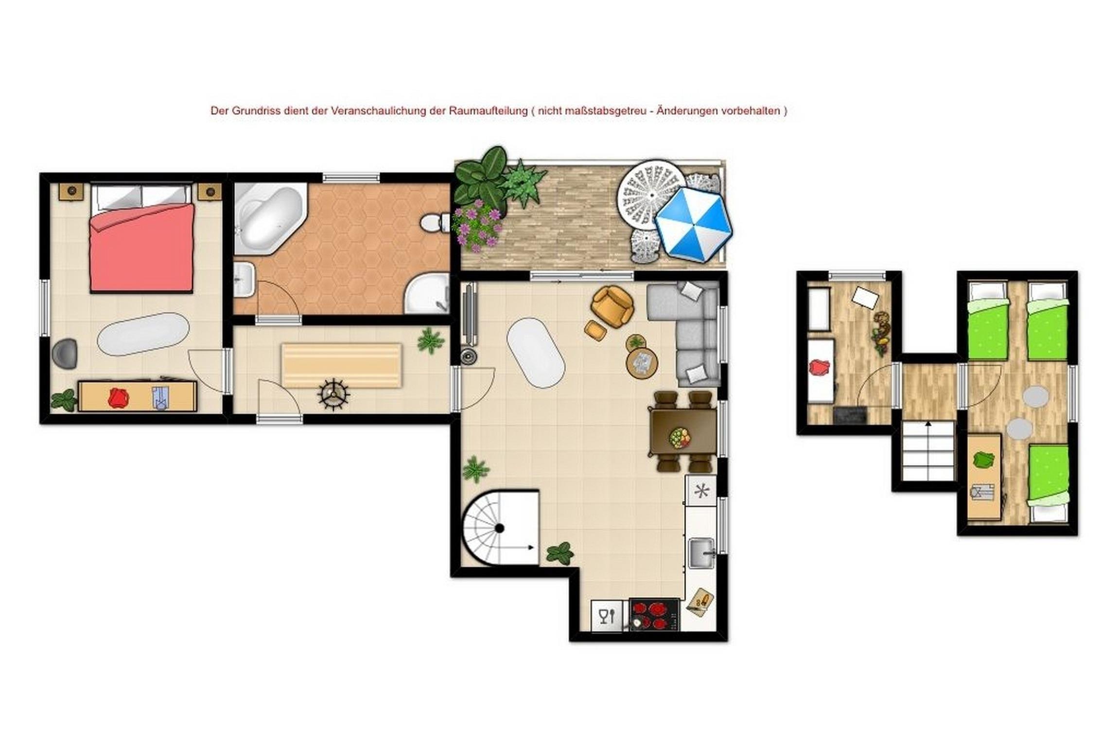 Vom Wohn-/ Küchenbereich aus führt eine offene Holz-Wendeltreppe ins Dachgeschoss. Hier in der oberen Wohnebene - im Dachgeschoss warten 2 weitere Schlafzimmer auf Sie, liebe Gäste: