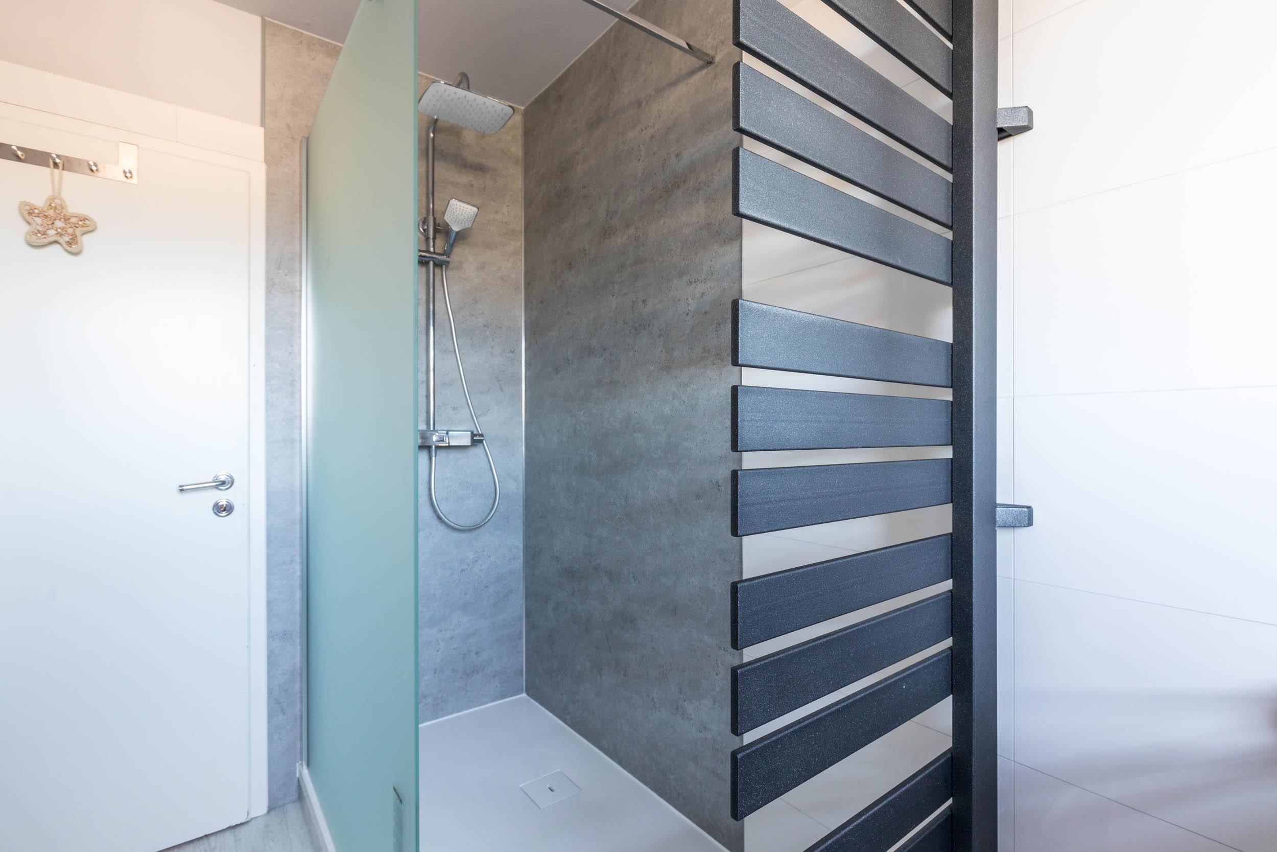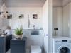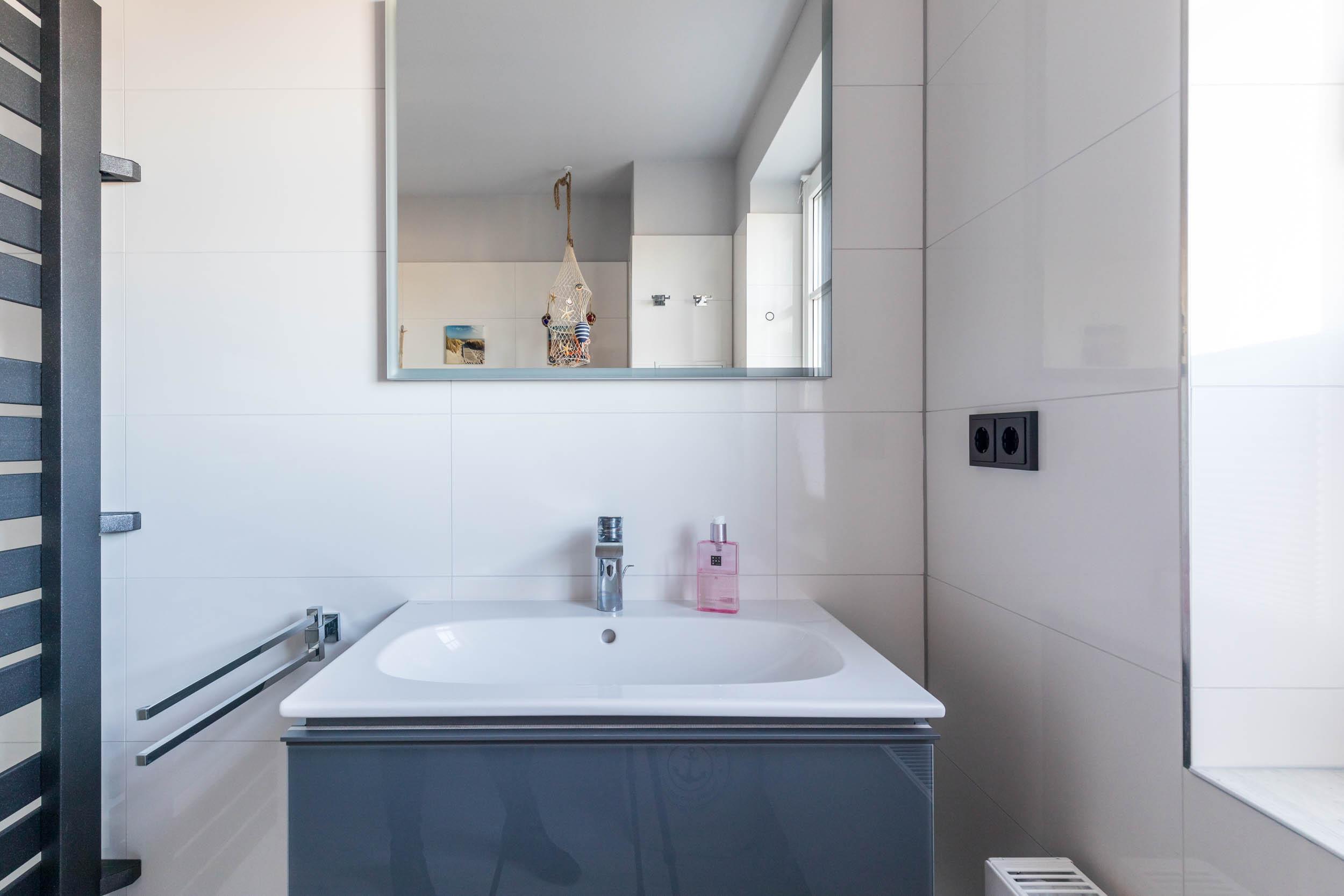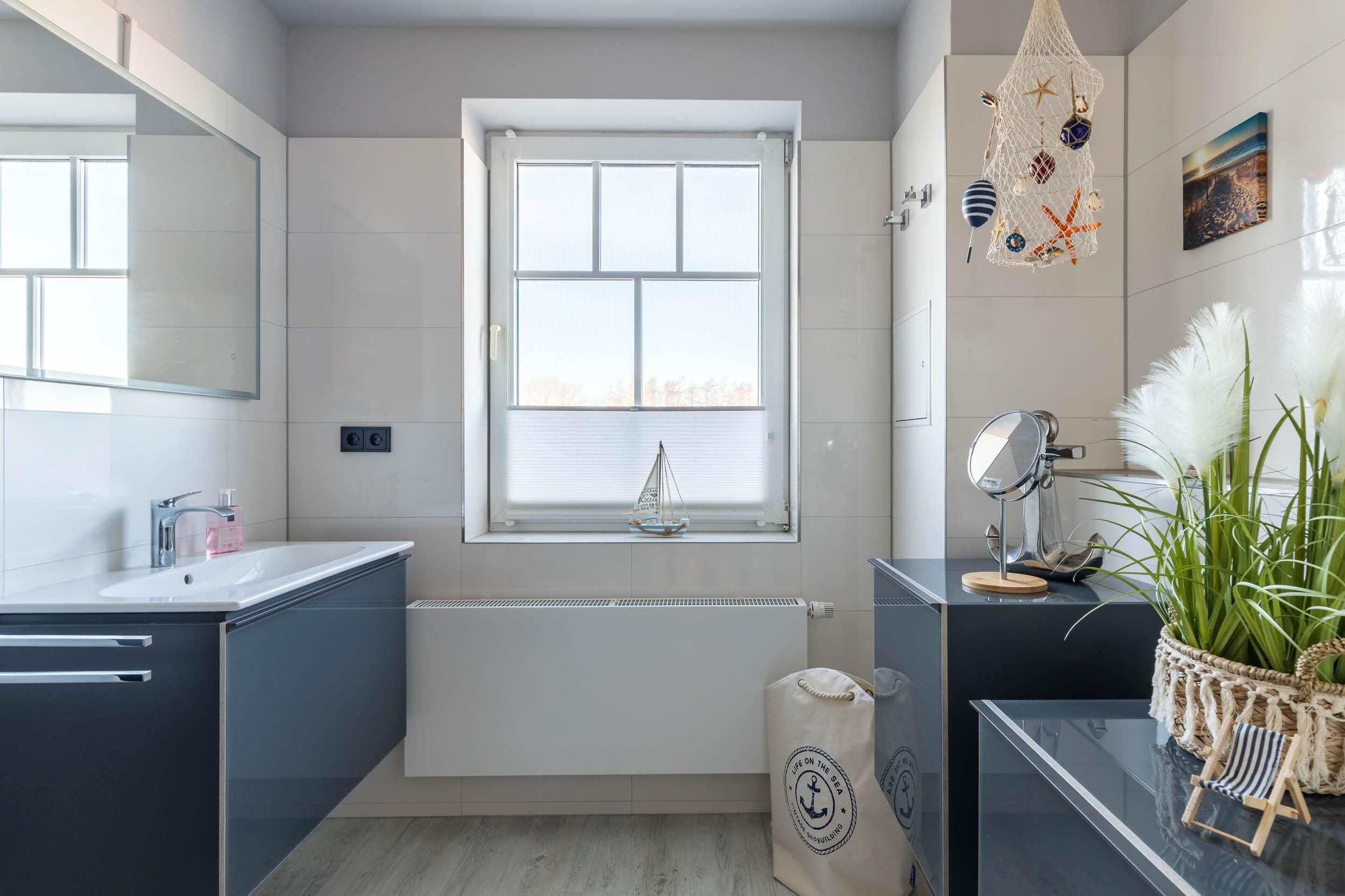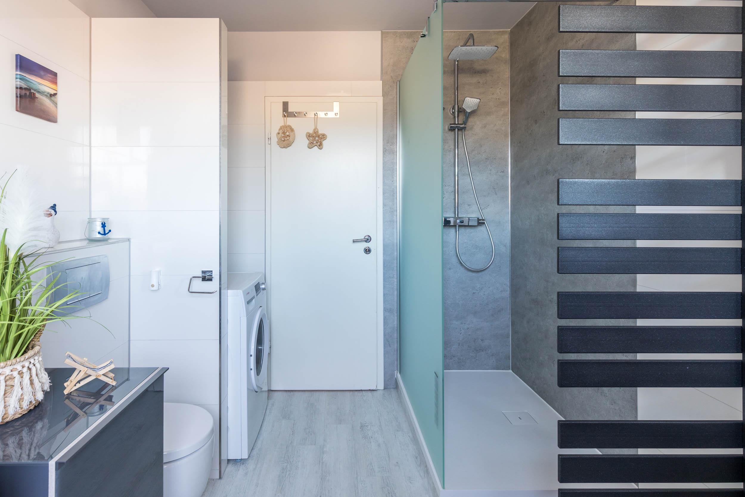 Das großzügige helle Badezimmer mit Fenster bietet eine Dusche, Handtuchheizung, WC und auch eine Waschmaschine.