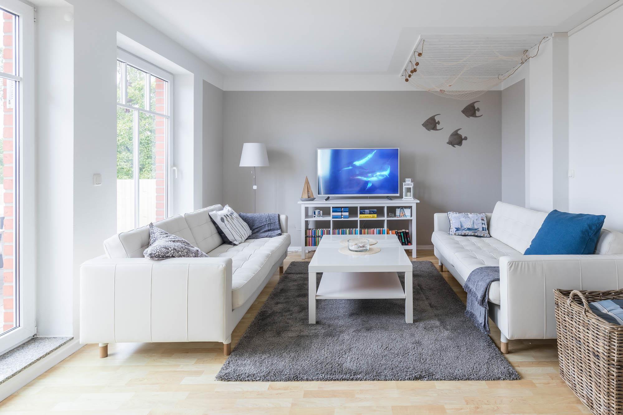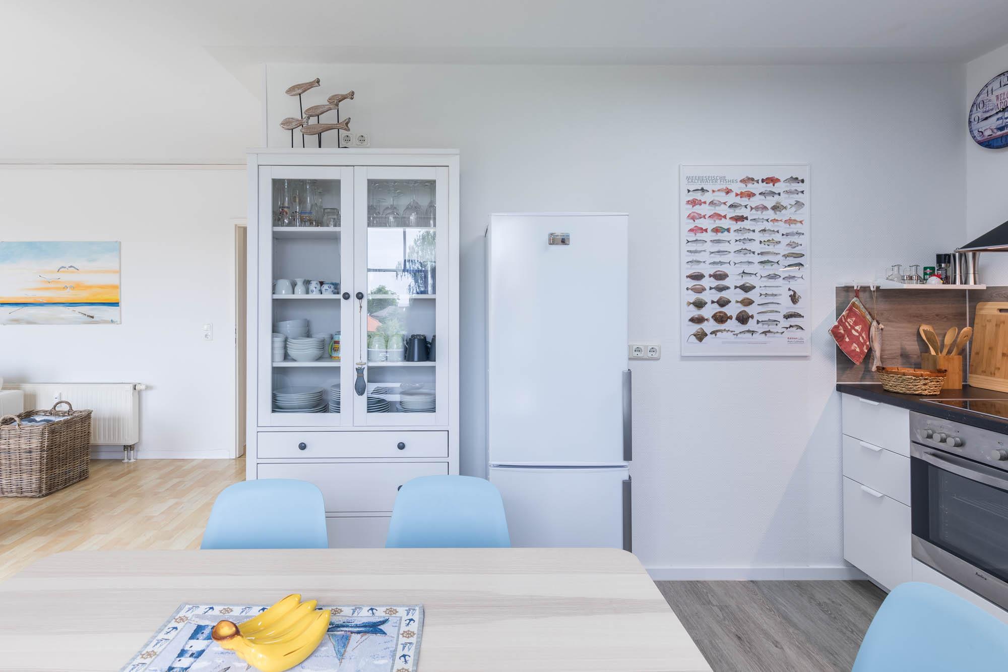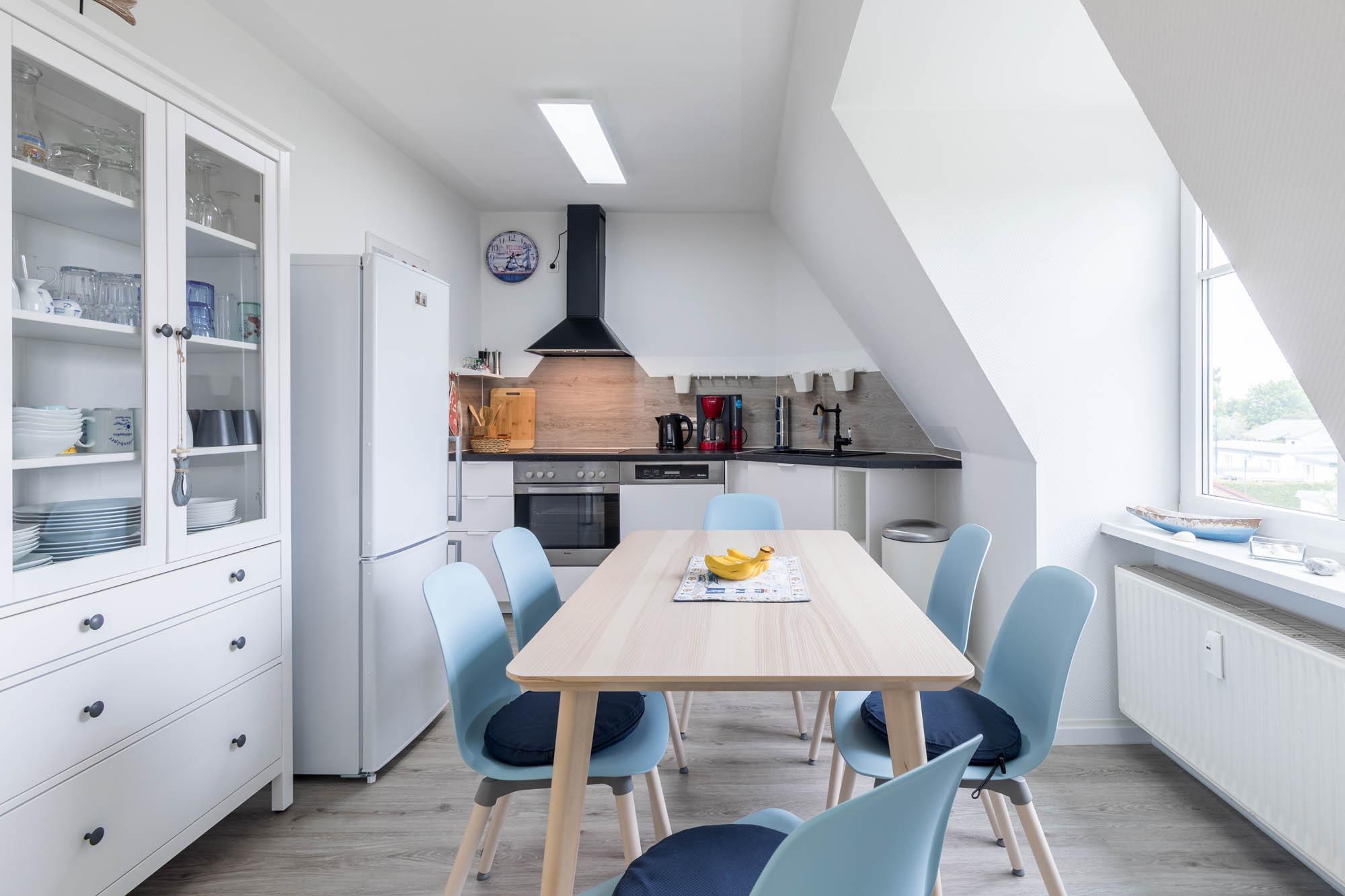 Das moderne helle Wohnzimmer bietet neben zwei bequemen Sofas und einem Schwingsessel auch Flatscreen-TV, eine kleine Bibliothek sowie eine hervorragend ausgestattete Wohnküche mit einer großzügigen Essecke für 6 Gäste.