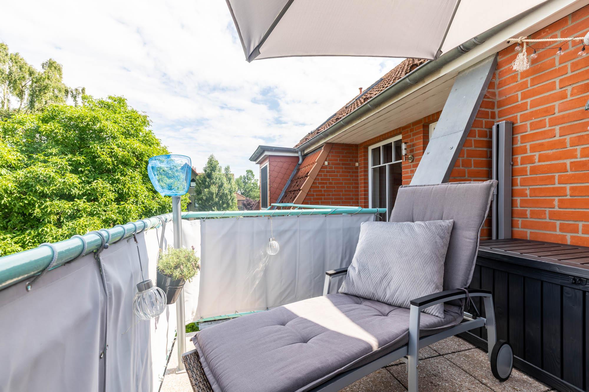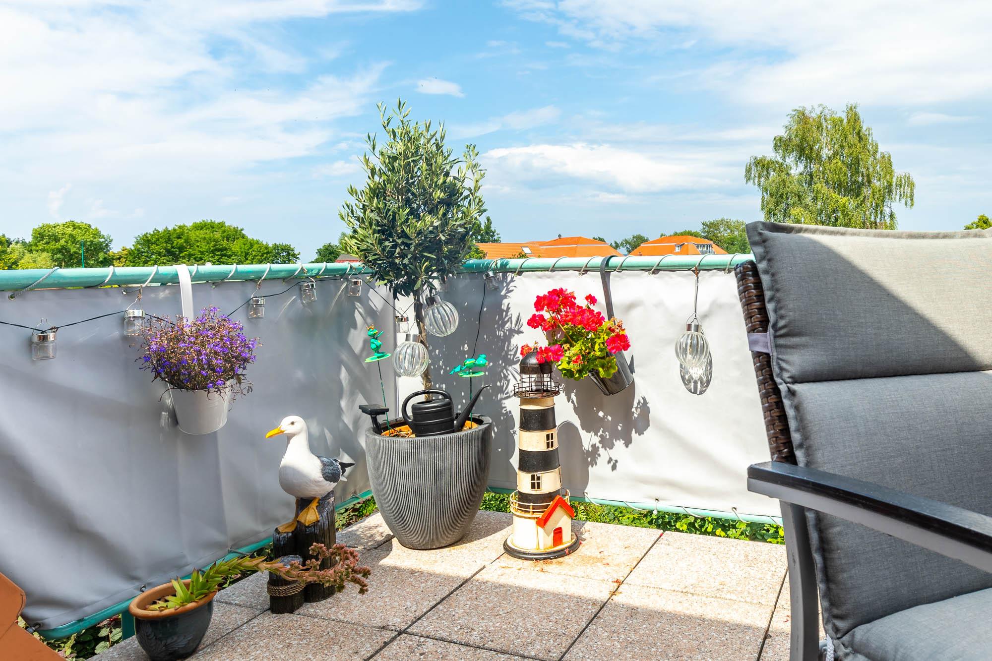 Der möblierte Nordost-Balkon ist direkt aus dem Wohnbereich begehbar. Sie können sogar ein bisschen das Meer von hier aus sehen...