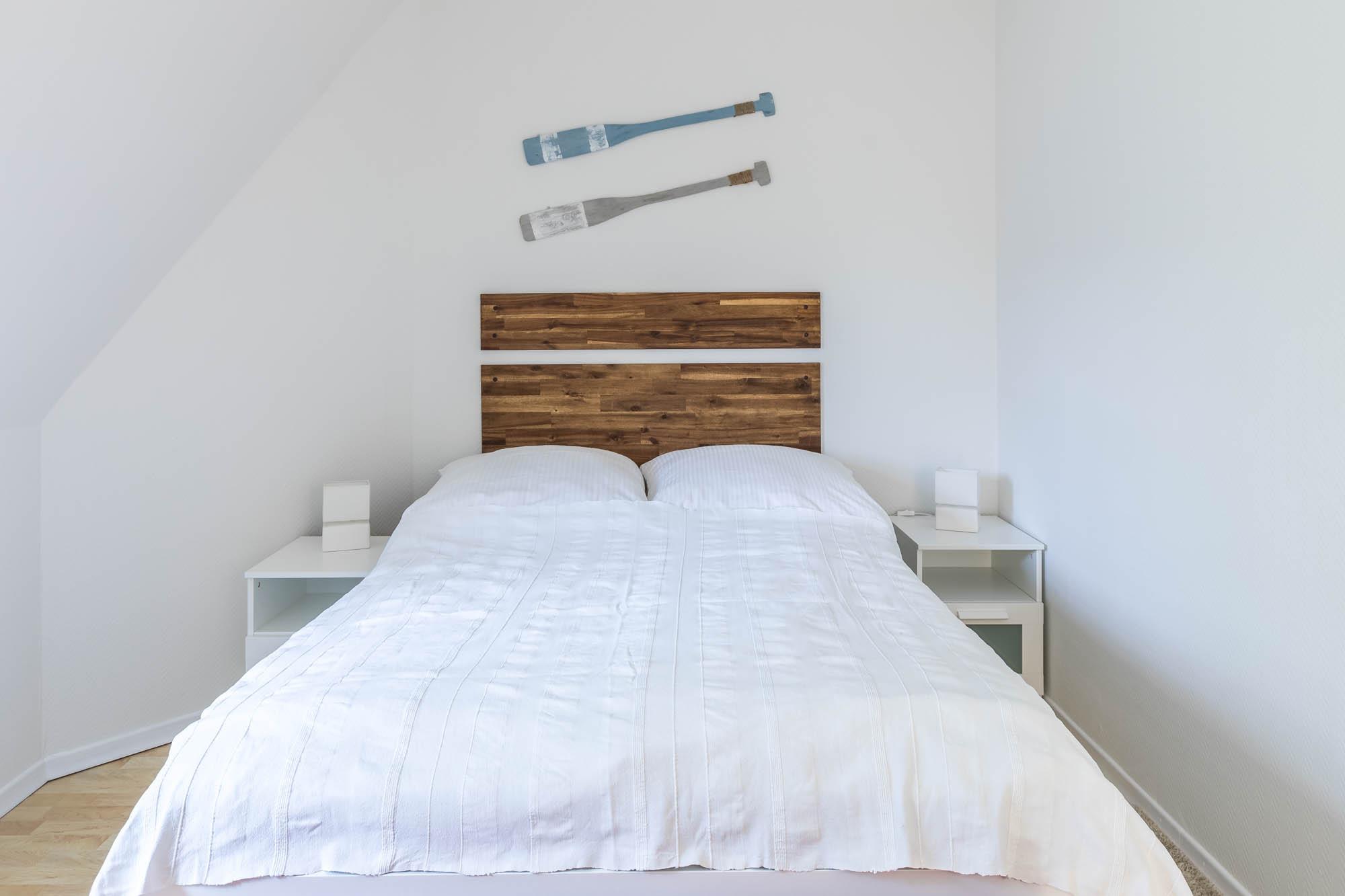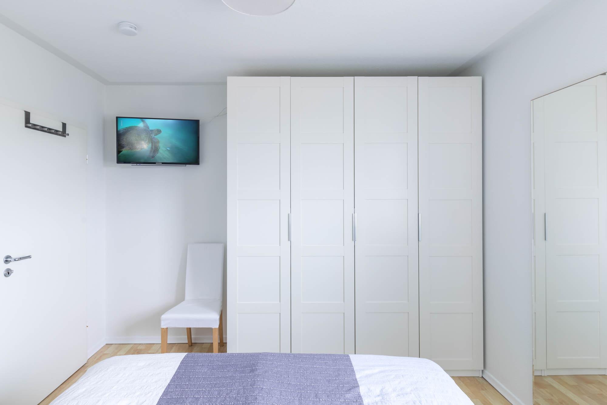 Die Wohnung bietet drei separate Schlafzimmer. Ein Schlafzimmer ist mit einem Doppelbett ( 160x200 ) und ein Schlafzimmer ist mit einem Doppelbett ( 140x200 ) eingerichtet. Das Dritte ist als Gäste-/ Kinderzimmer mit 2 Einzelbetten ( je 80x200 ) ausgestattet. Alle drei Schlafzimmer verfügen über einen Kleiderschrank. Sowohl in dem Gäste-/ Kinderzimmer als auch in einem der Schlafzimmer befinden sich außerdem ein moderner Fernseher.