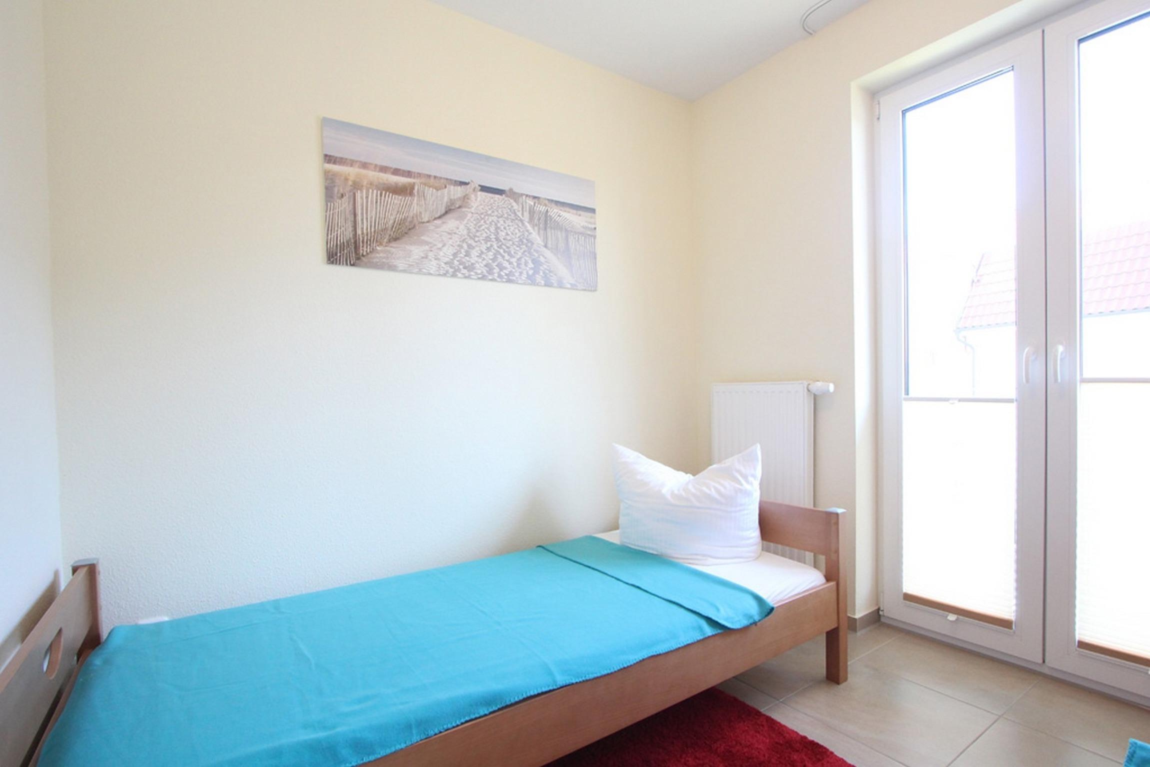 In dieser Wohnung gibt es zwei Schlafzimmer: Das erste Schlafzimmer (180x200cm) verfügt über ein Doppelbett und über einen Kleiderschrank. Das Gäste-/ Kinderzimmer ist mit zwei Einzelbetten (je 90x200cm) möbliert.
