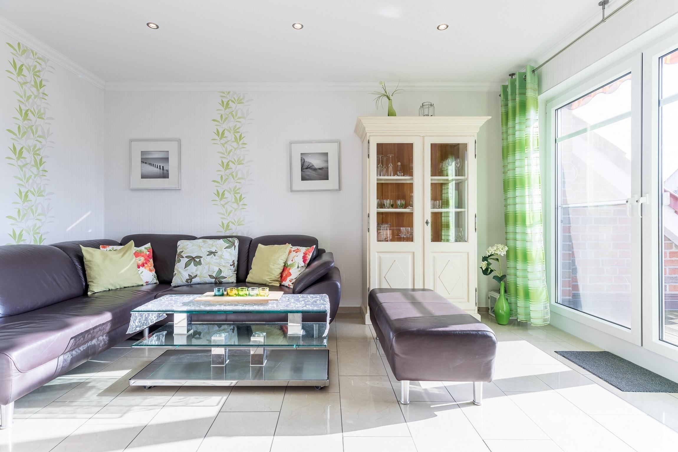 Der Wohnbereich mit Sofa und SAT-TV (Flatscreen) beherbergt eine Essecke für 4 Personen. Genießen Sie von hier aus die frische Ostseeluft auf dem möblierten Südbalkon.