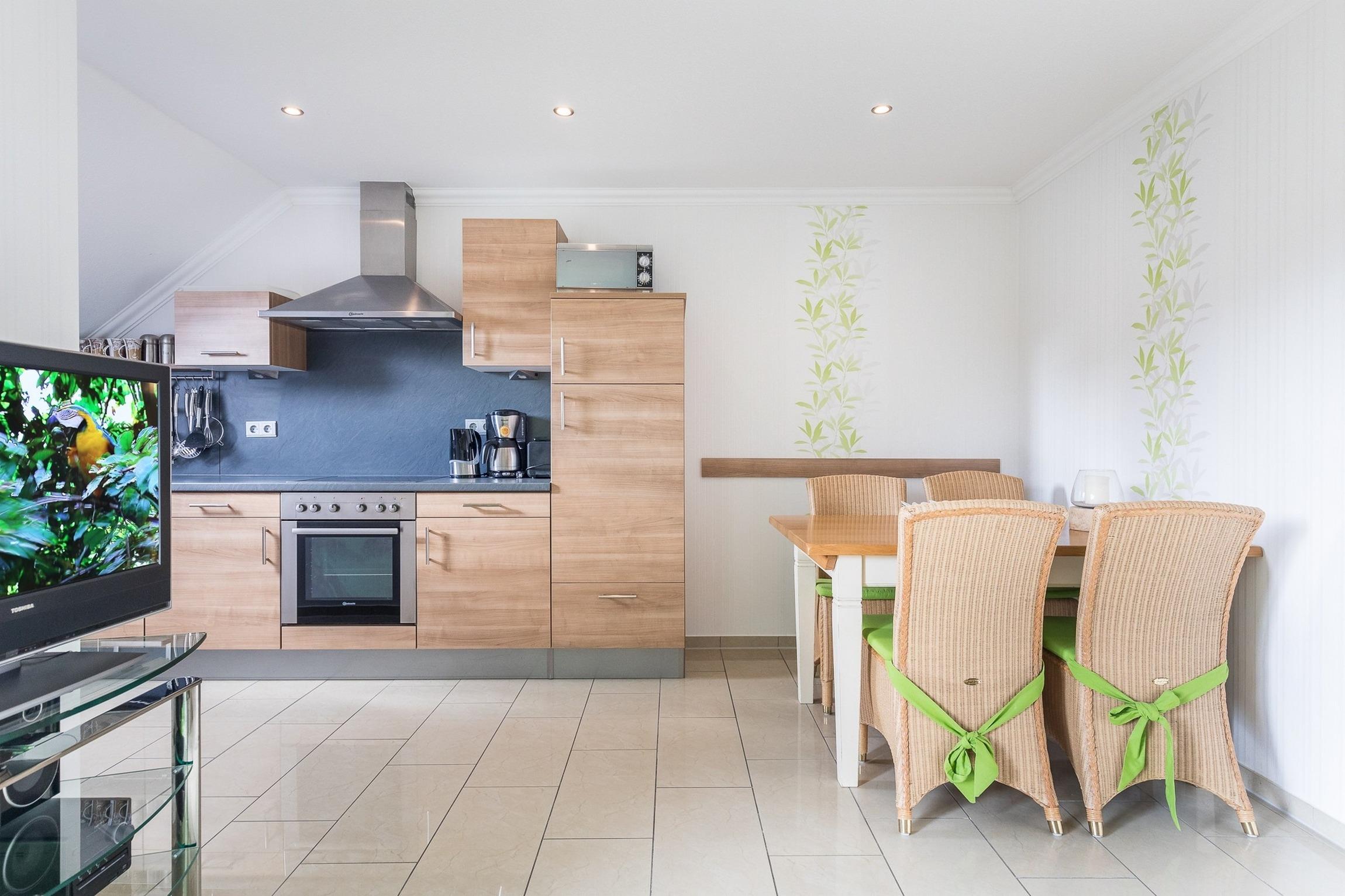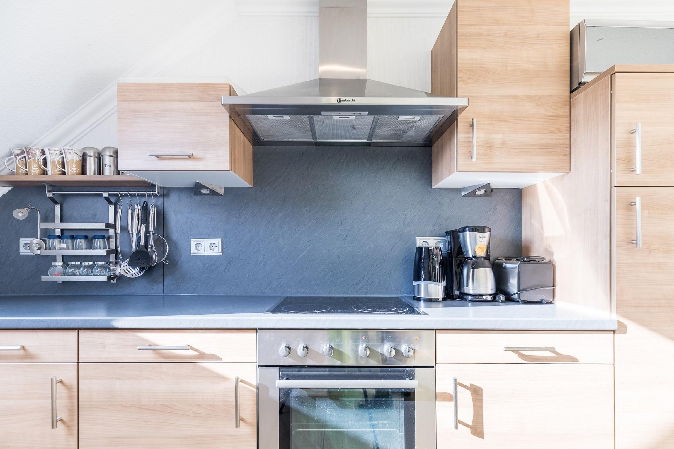 Die Küche ist mit einem Herd inklusive Backofen, einem Kühlschrank, einer Mikrowelle, einer Spülmaschine und einem Wasserkocher sehr gut eingerichtet.