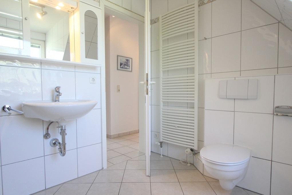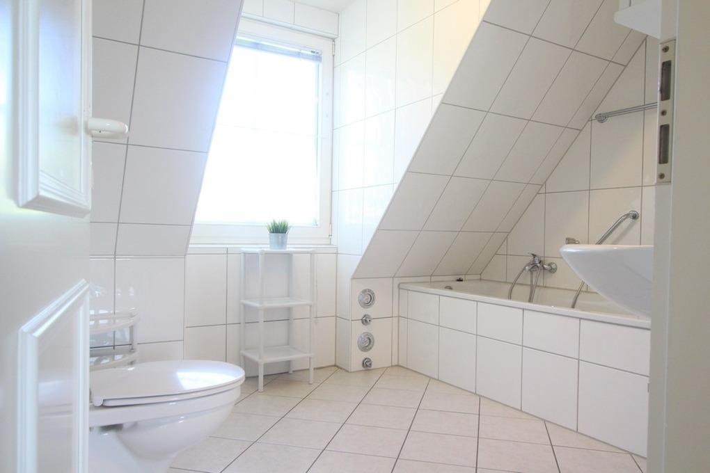 Im hellen Badezimmer mit Fenster (auf selber Ebene) finden Sie neben WC und Waschbecken sowohl Dusche als auch eine Badewanne vor. Weiterhin gibt es hier noch einmal ein separates Gäste-WC.