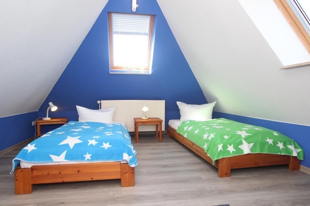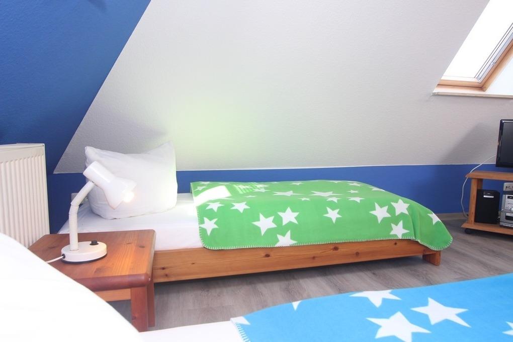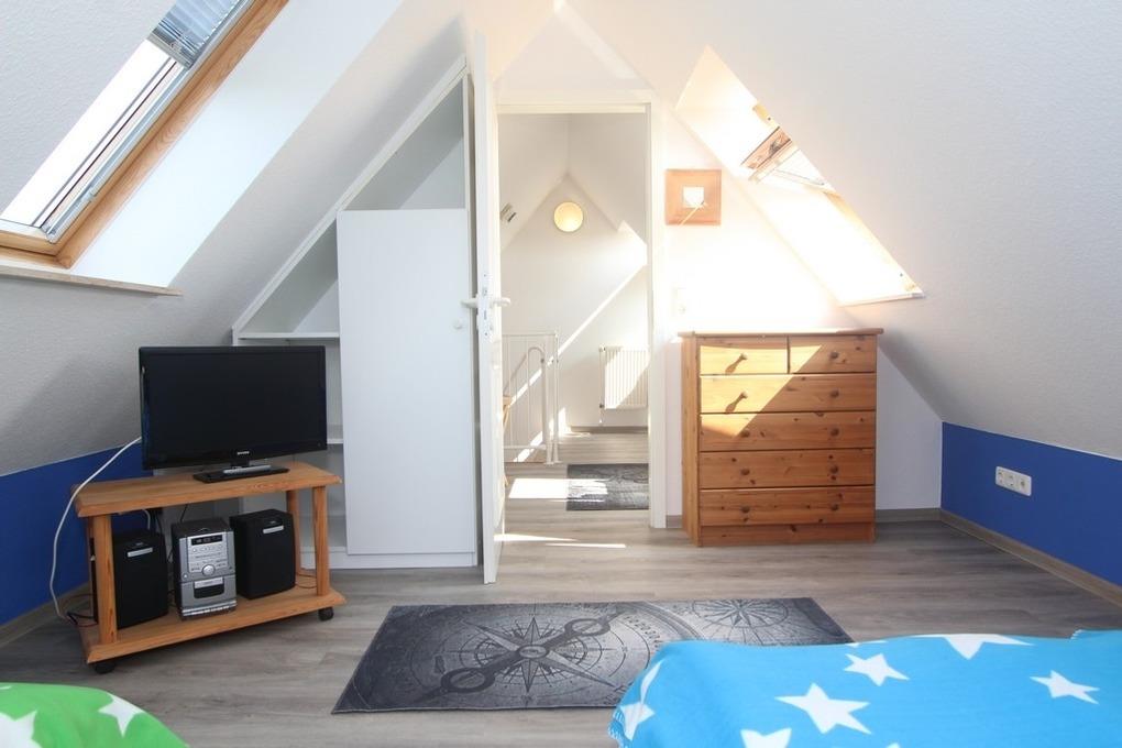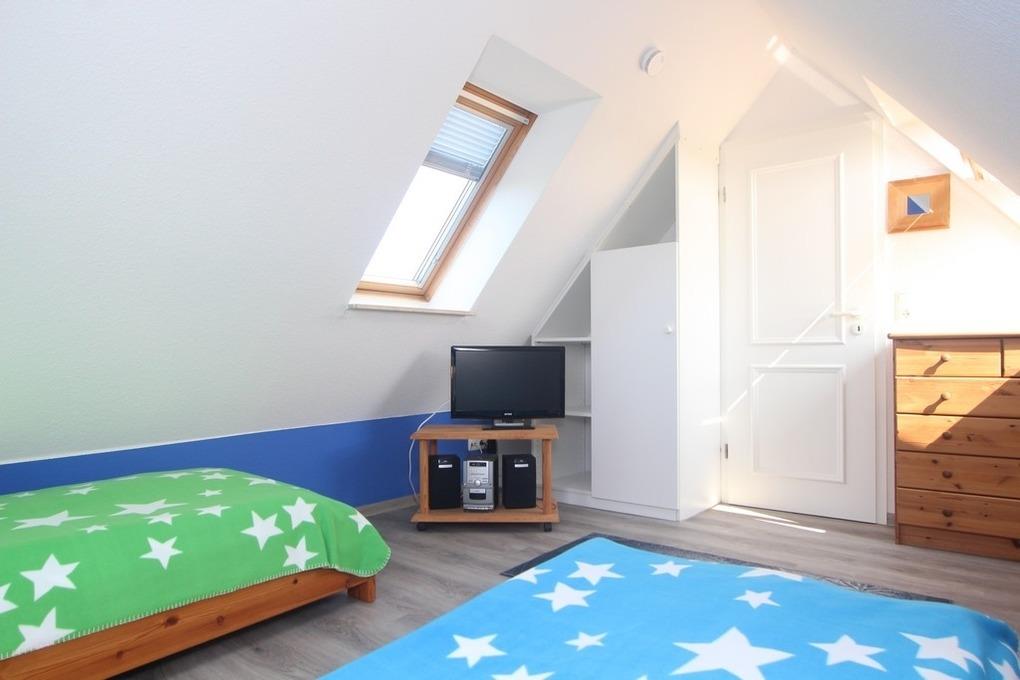 Dann betreten Sie das geschlossene Kinder-/ Gästezimmer mit 2 Einzelbetten sowie TV und kleiner Musikanlage. Für Ihre Garderobe steht hier eine Kommode bereit.