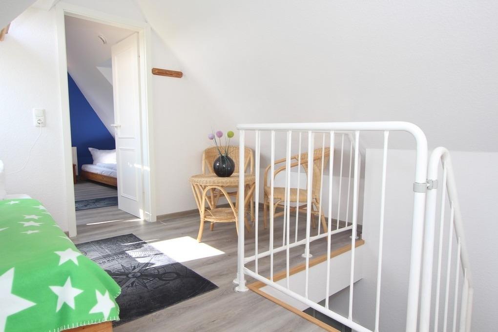 Erreicht man dann über die Treppe das Dachgeschoss, werden Sie von einer kleinen offenen Galerie mit einem Einzelbett und einer kleinen Sitzecke empfangen.