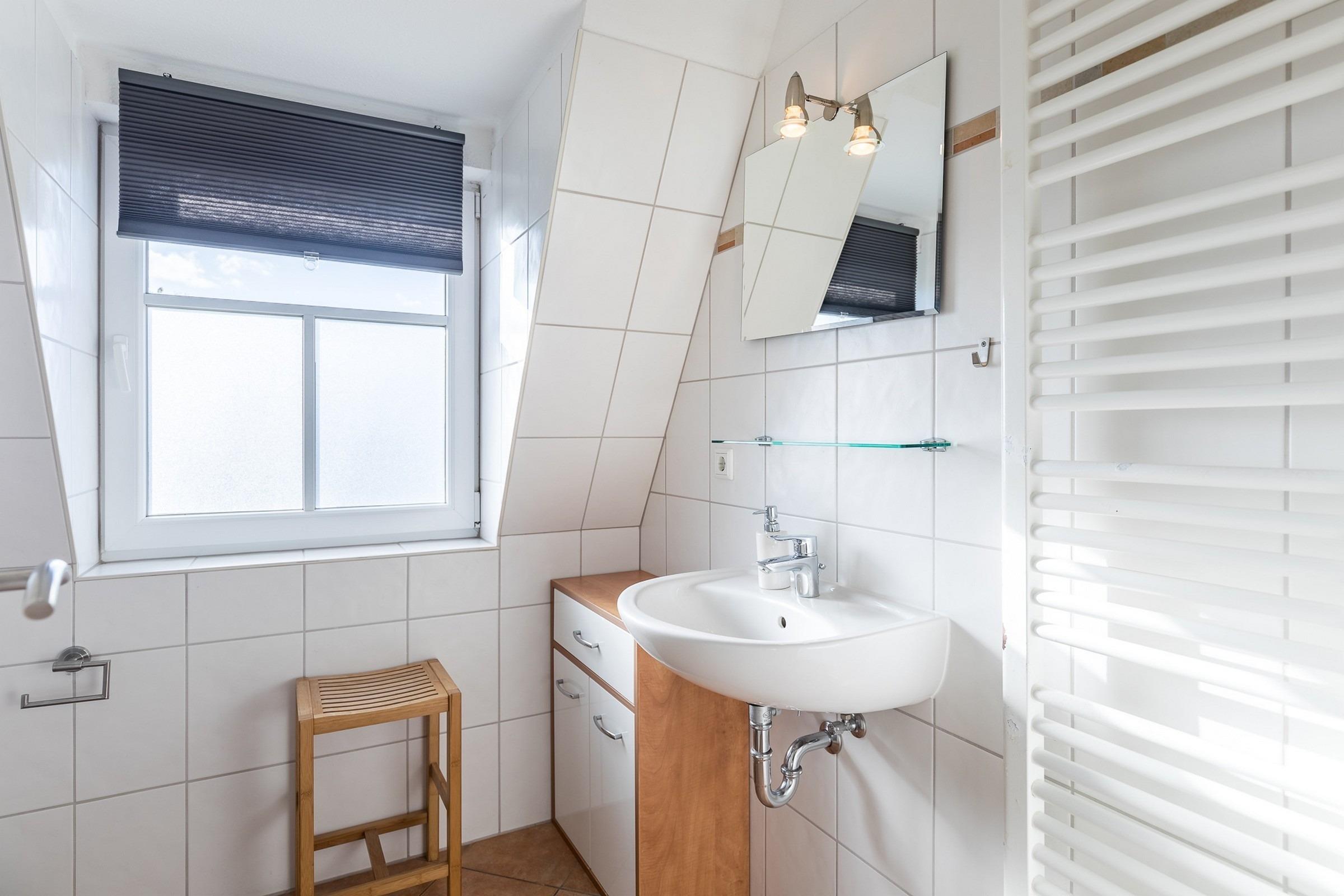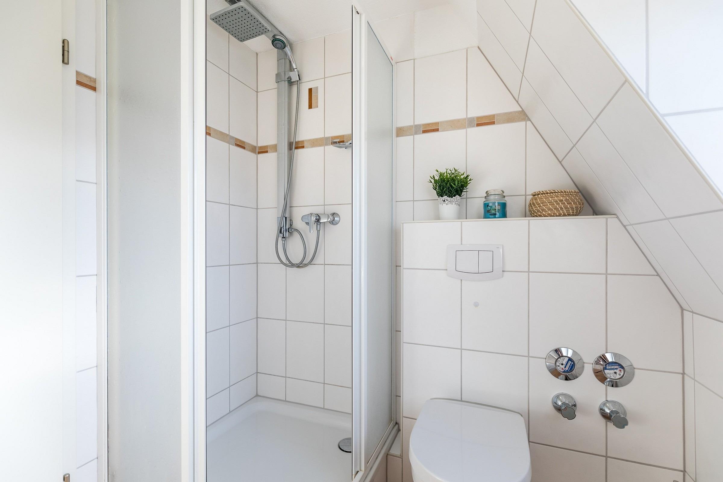 Das hell geflieste moderne Bad mit Tageslicht ist mit Dusche, WC und Waschbecken ausgestattet.