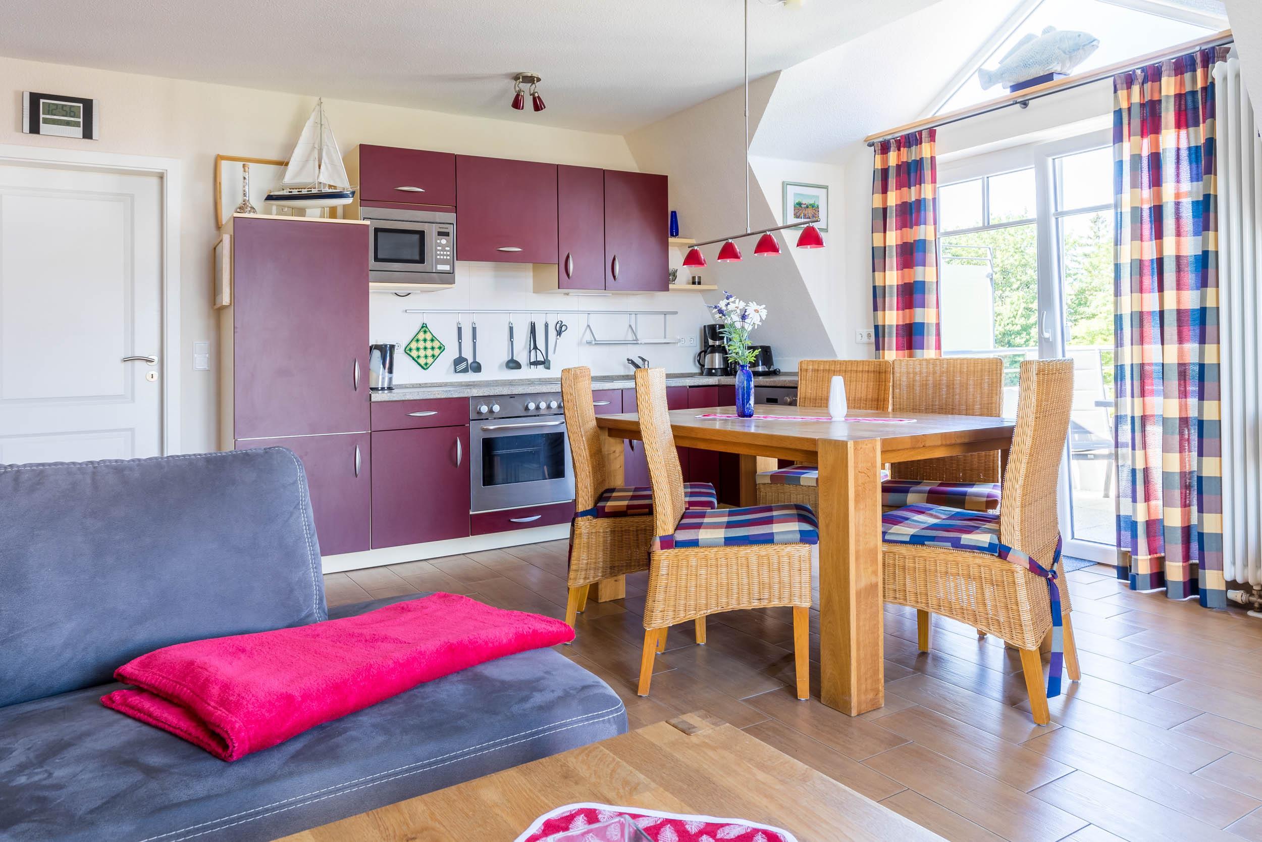 Mit der offenen Wohnküche können Sie sich rundum selbst versorgen und das zubereitete Essen gemeinsamen an der gemütlichen Essecke einnehmen. Zur Küchenausstattung zählen unter anderem ein Herd mit Backofen, eine Spülmaschine sowie ein Kühlschrank mit Gefrierfach.