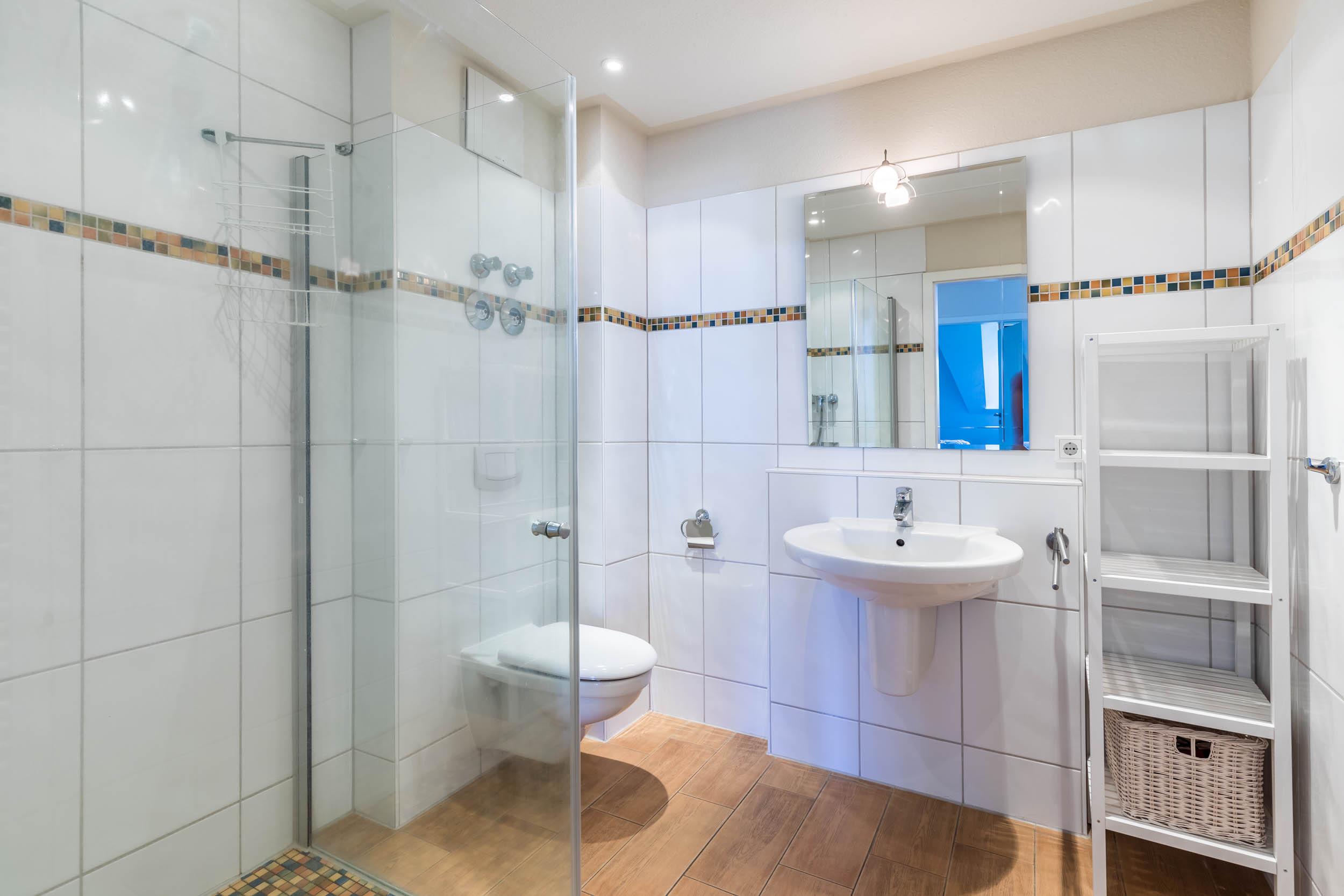 Selbstverständlich gehört zur Ferienwohnung auch ein Badezimmer mit ebenerdiger Dusche und WC.