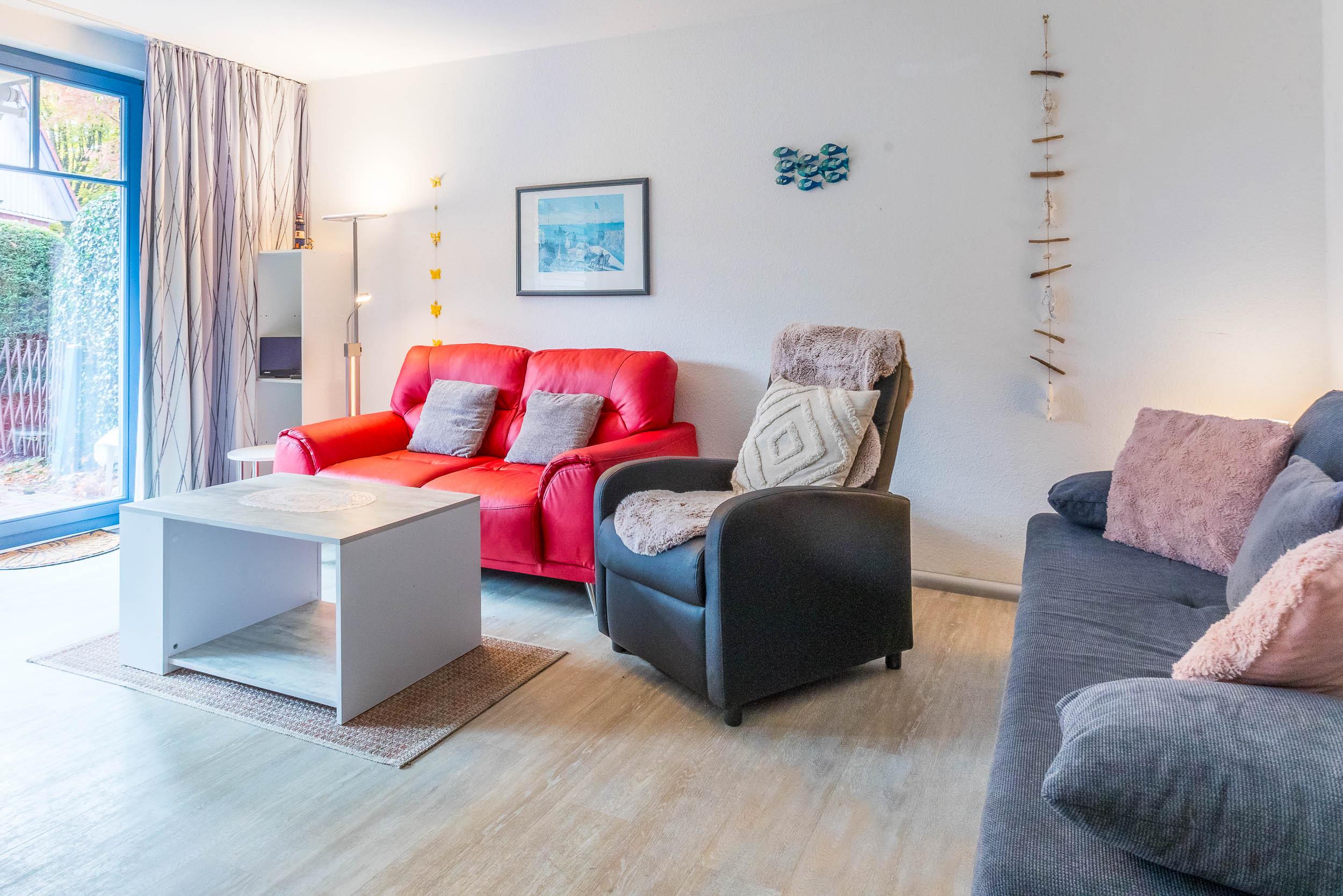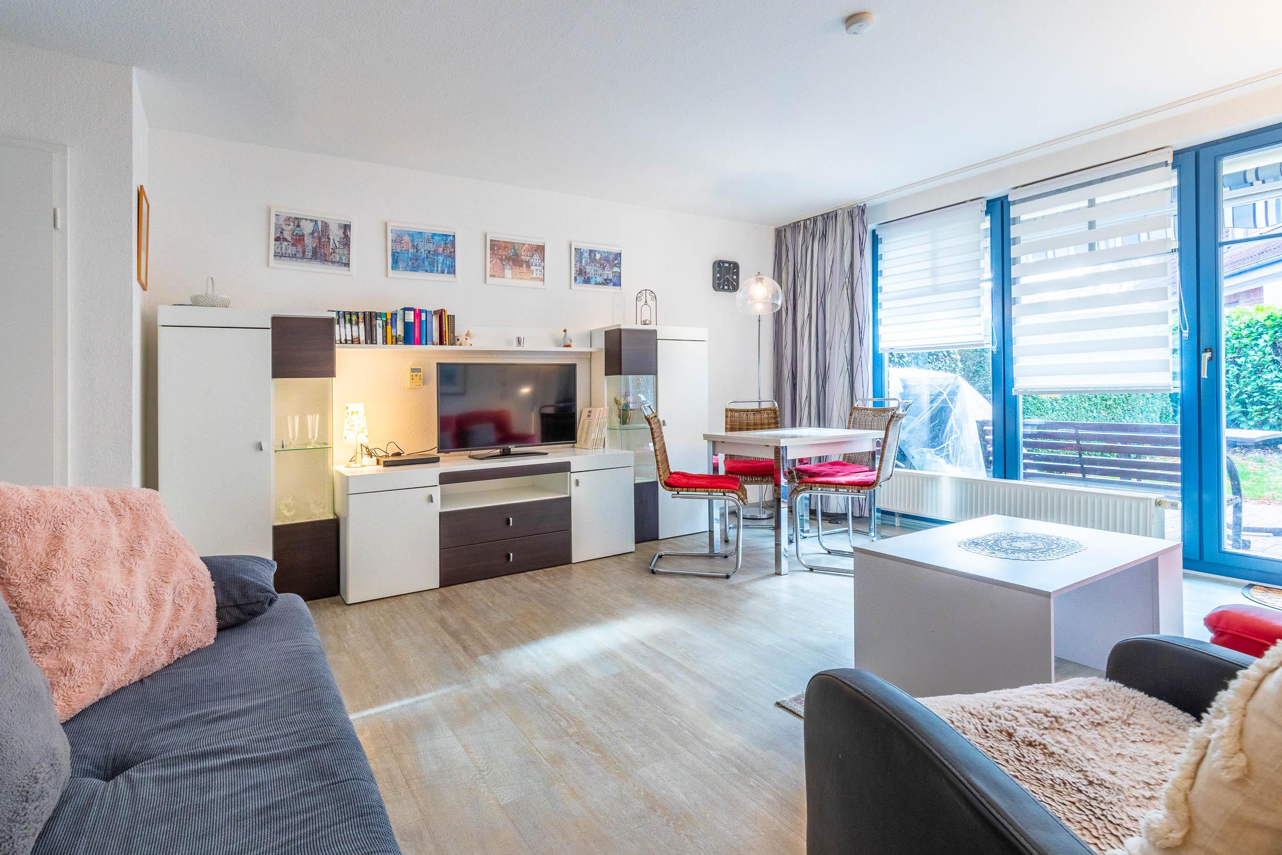 Die gemütliche 55qm große 2-Zimmer-Wohnung für 2 -3 Gäste liegt im Erdgeschoss und verfügt über eine eingezäunte möblierte Terrasse (Hundesteckzaun 90 cm).