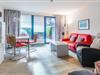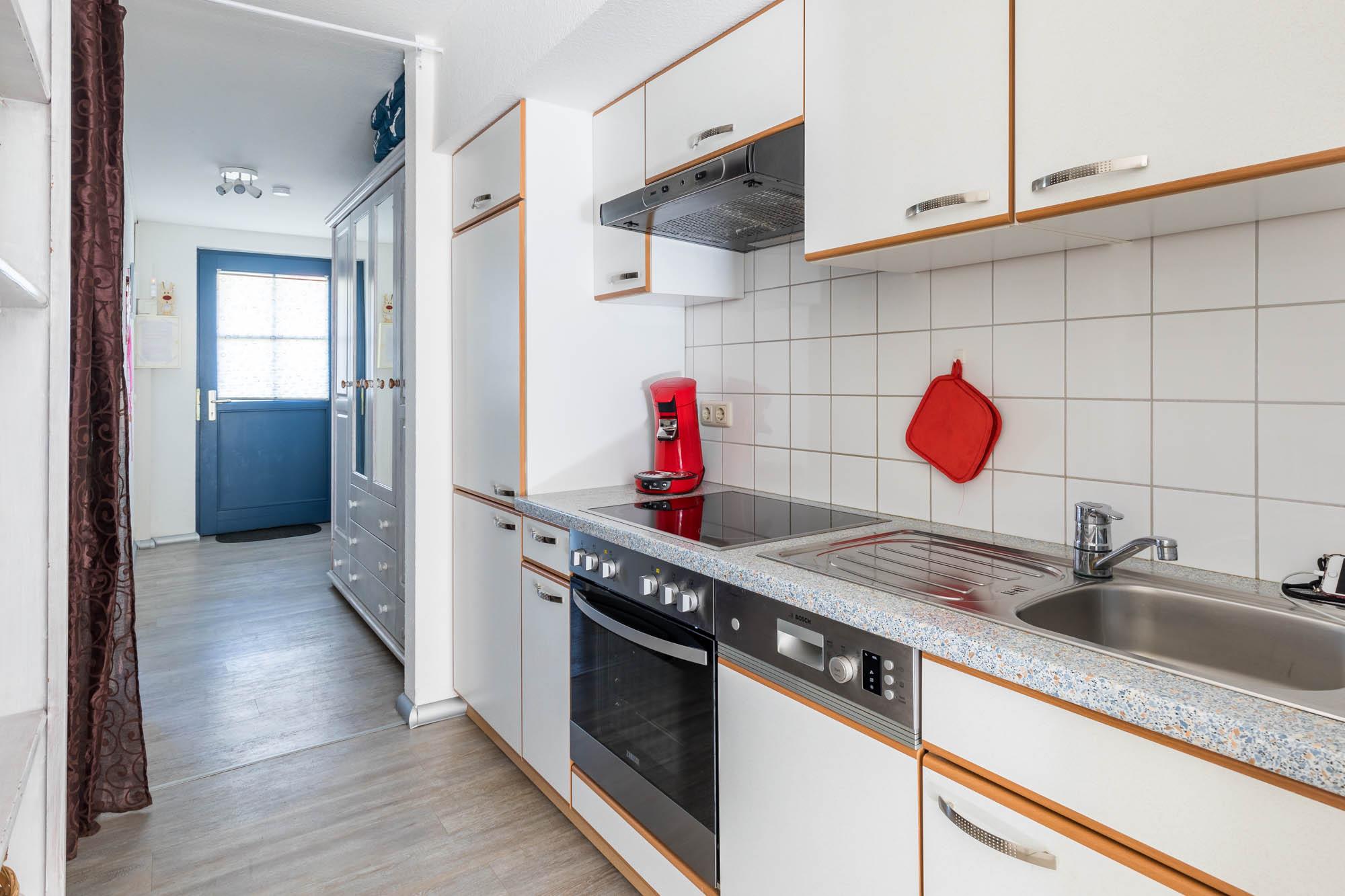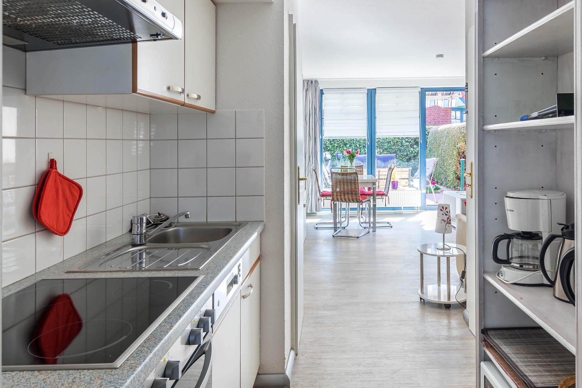 Die Küchenzeile ist sehr gut ausgestattet. So finden Sie einen kleinen Backofen mit Ceranfeldherd, Mikrowelle, Spülmaschine, Toaster, Wasserkocher und ebenso eine Kaffeemaschine. Gemeinsame Mahlzeiten nehmen Sie am Esstisch ein, der mit vier Schwingstühlen bestückt ist.